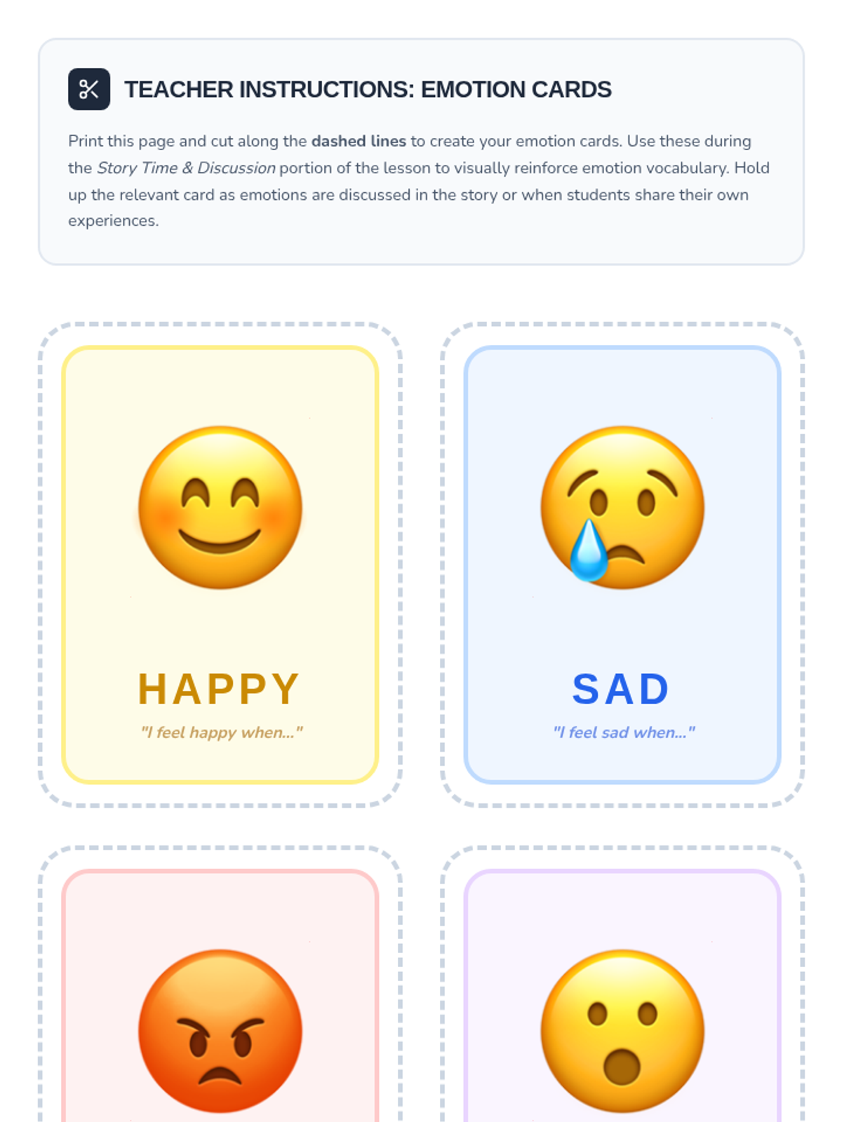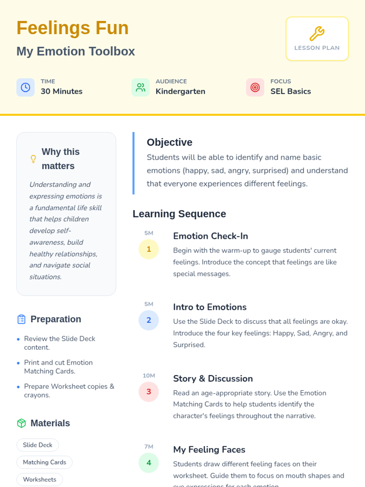 A foundational social-emotional learning lesson for Kindergarteners to identify and express basic emotions using an 'Emotion Toolbox' concept. Students explore happiness, sadness, anger, and surprise through storytelling, discussion, and creative drawing.