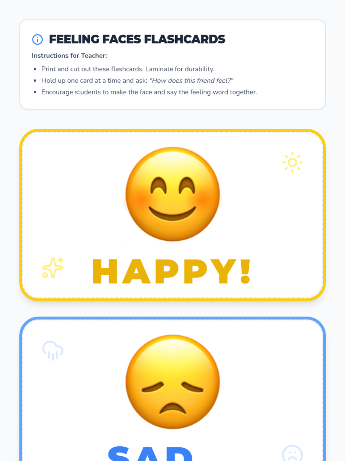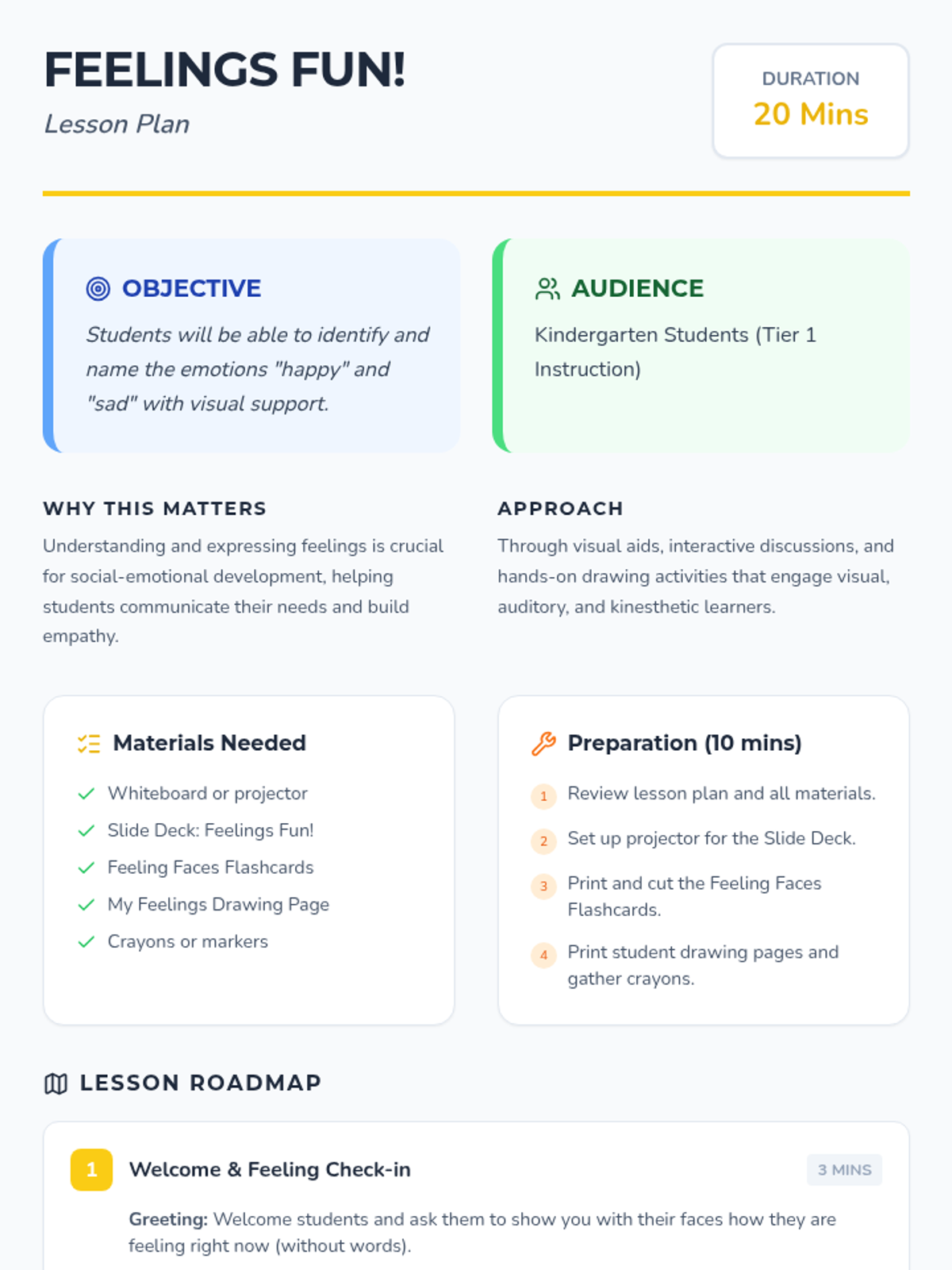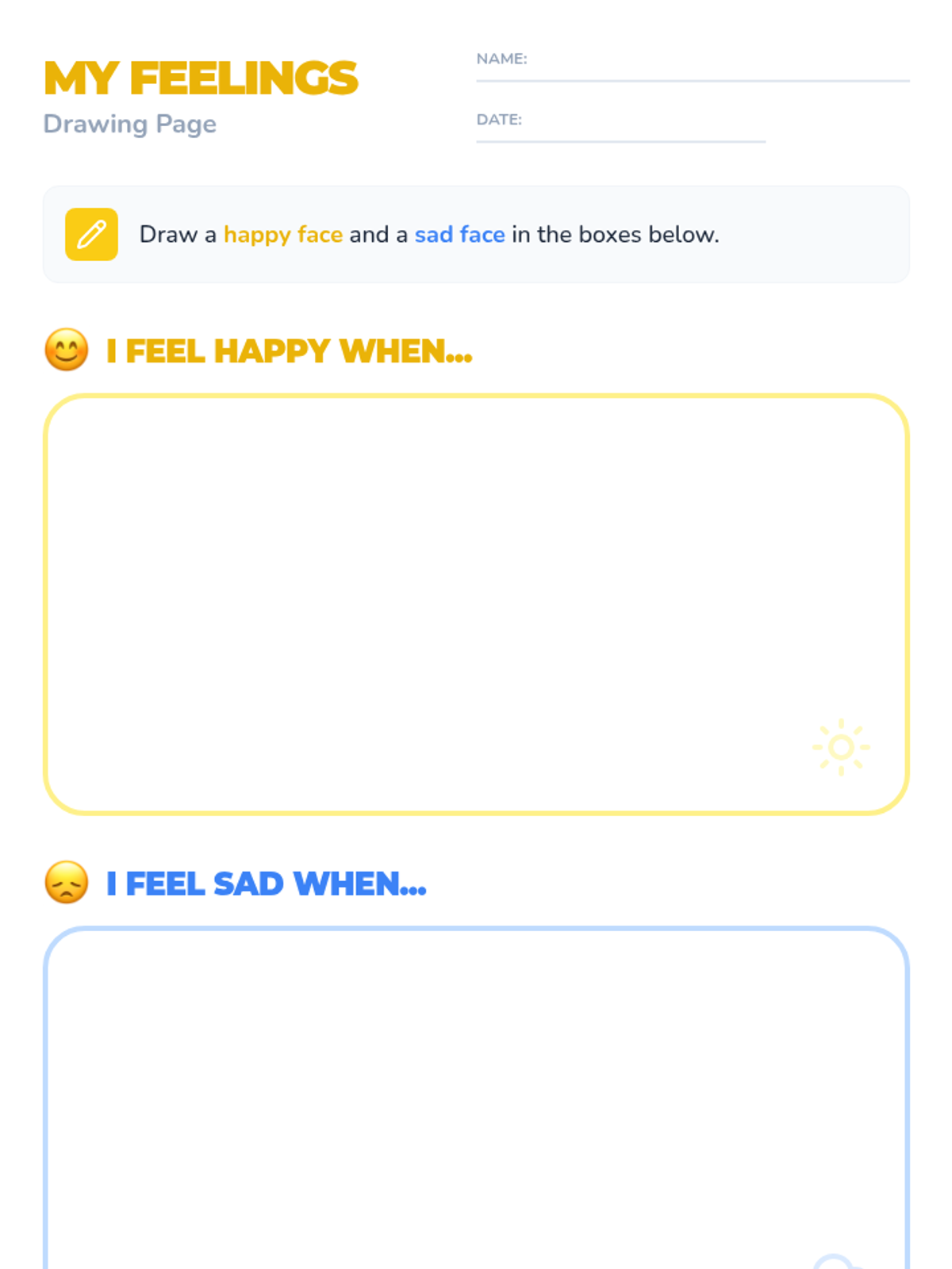 A 20-minute social-emotional learning lesson for Kindergarten students to identify and express 'happy' and 'sad' emotions through visual aids and drawing.