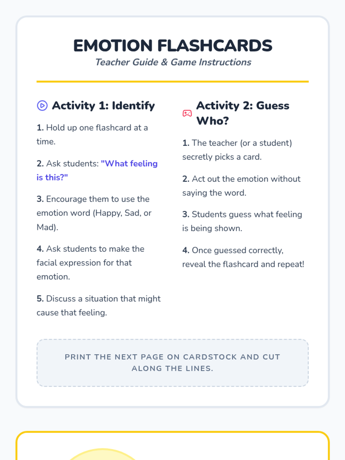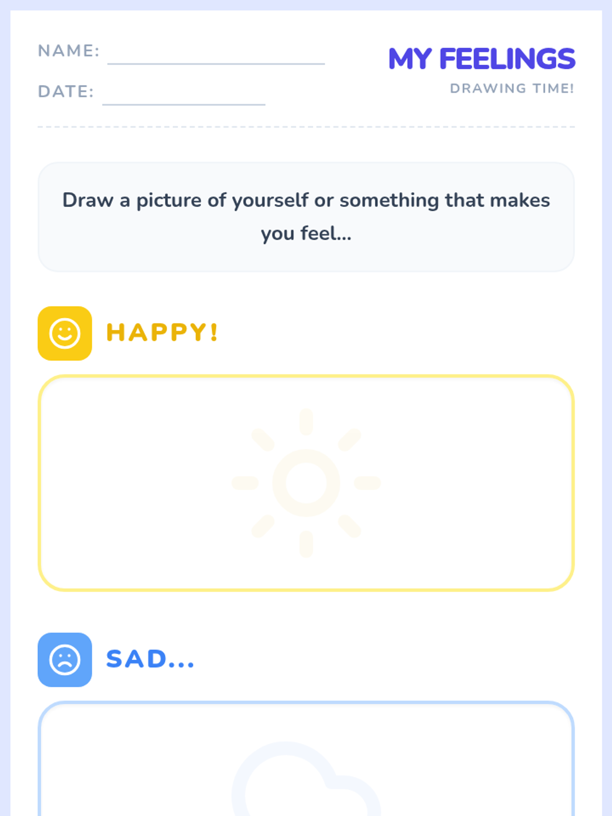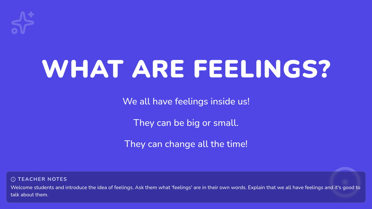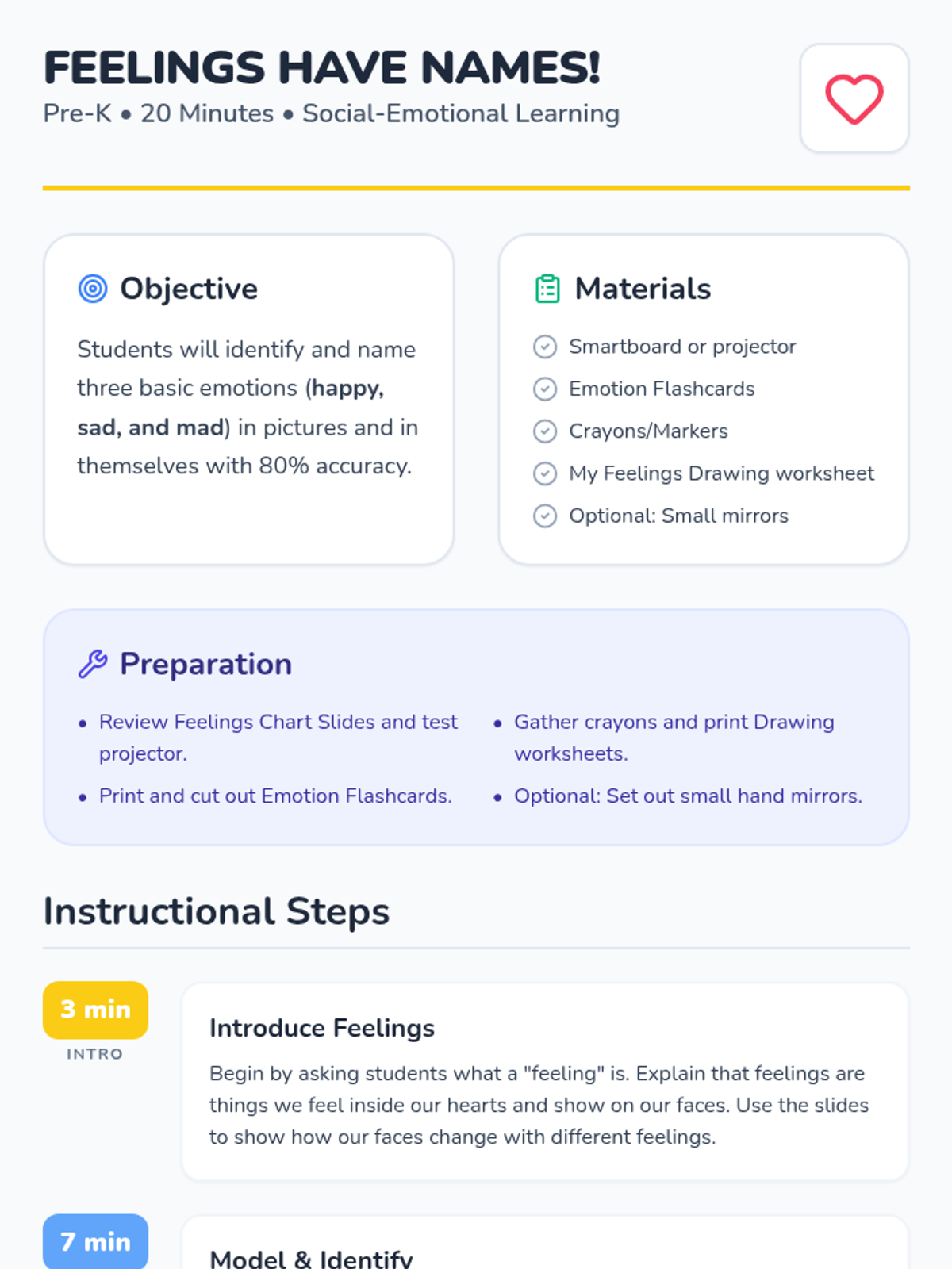 A 20-minute Pre-K lesson focused on identifying and naming happy, sad, and mad emotions through interactive slides, flashcards, and drawing.