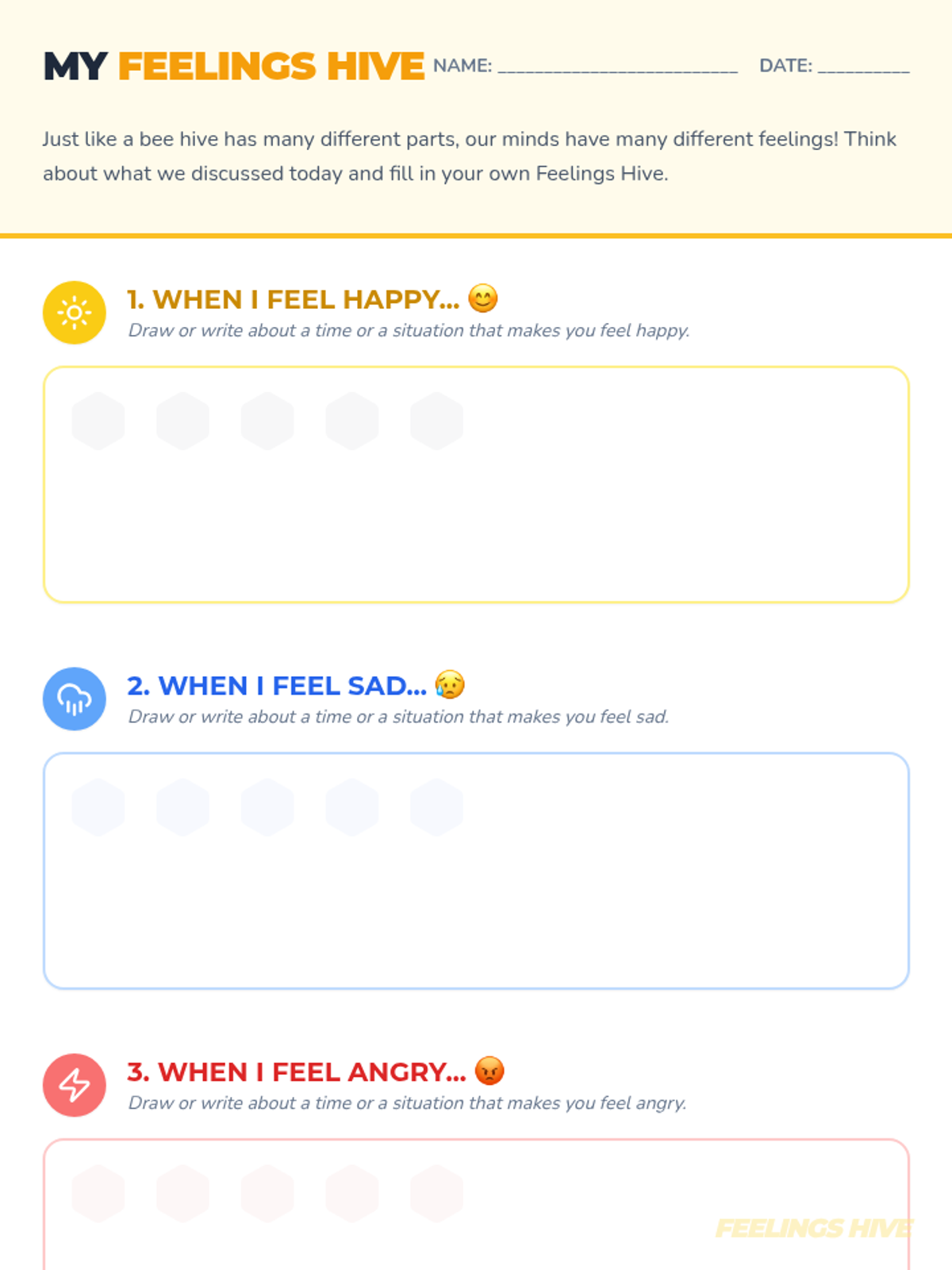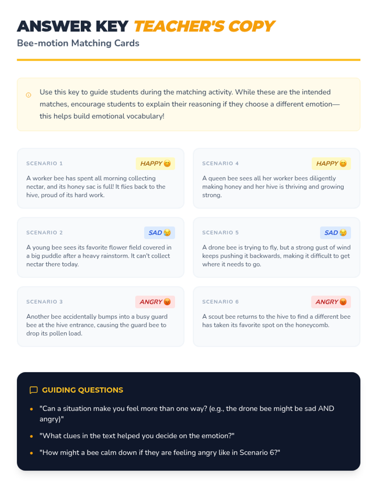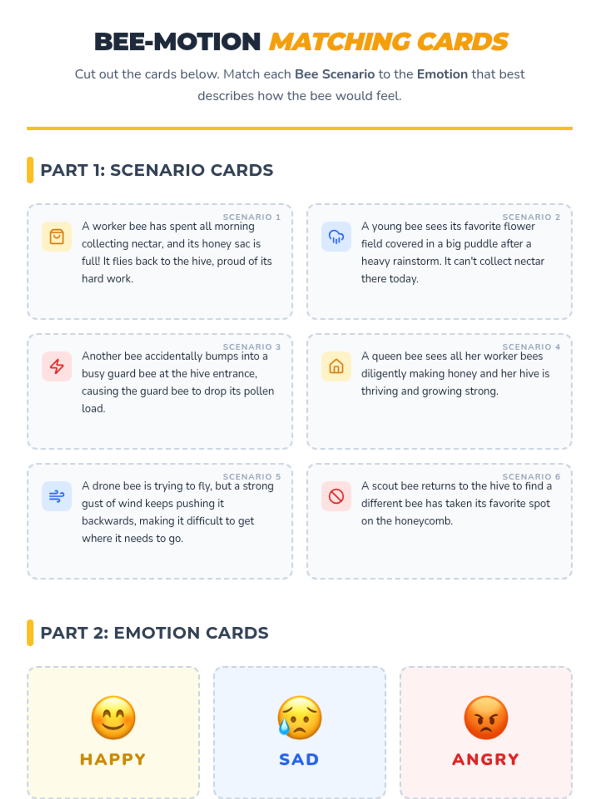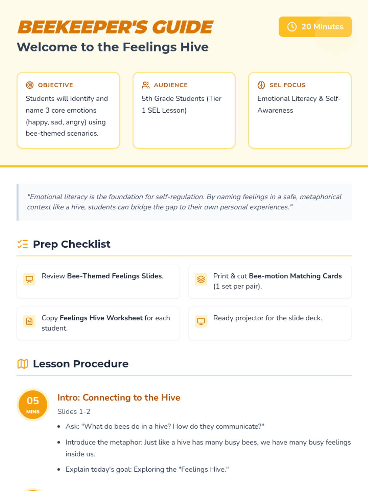 This 20-minute lesson uses a bee-themed metaphor to help 5th graders identify and name core emotions like happiness, sadness, and anger. Students engage with interactive slides, scenario-based matching cards, and a personal reflection worksheet.