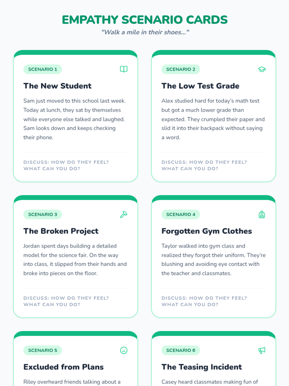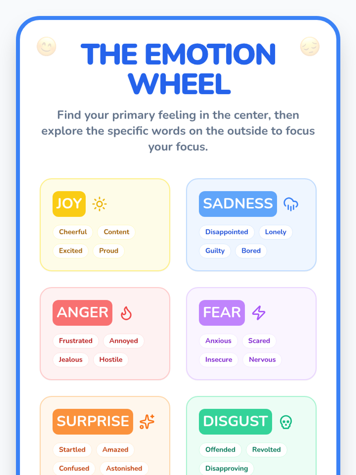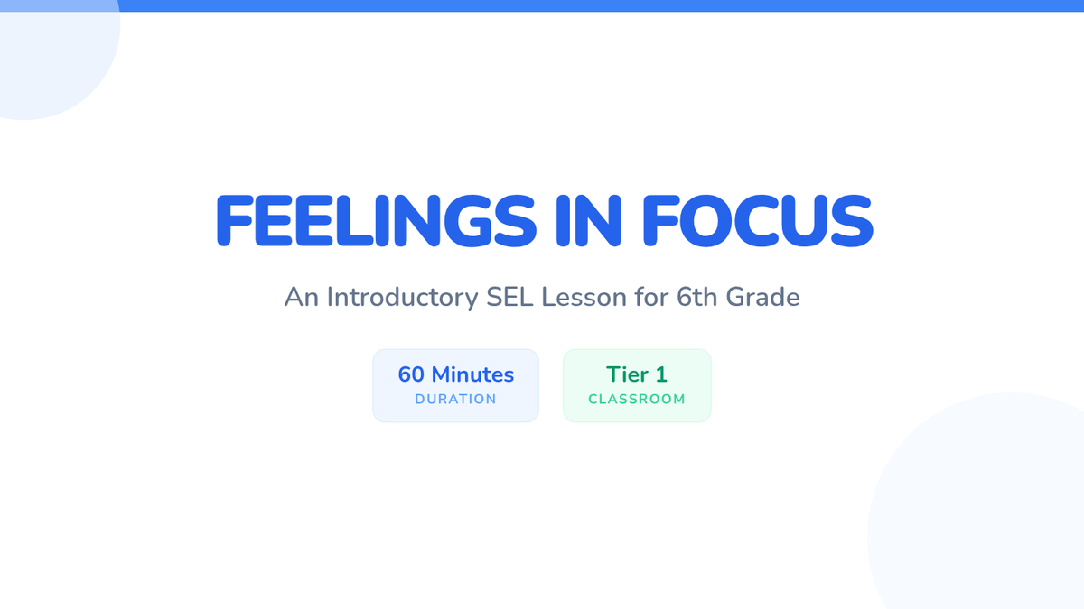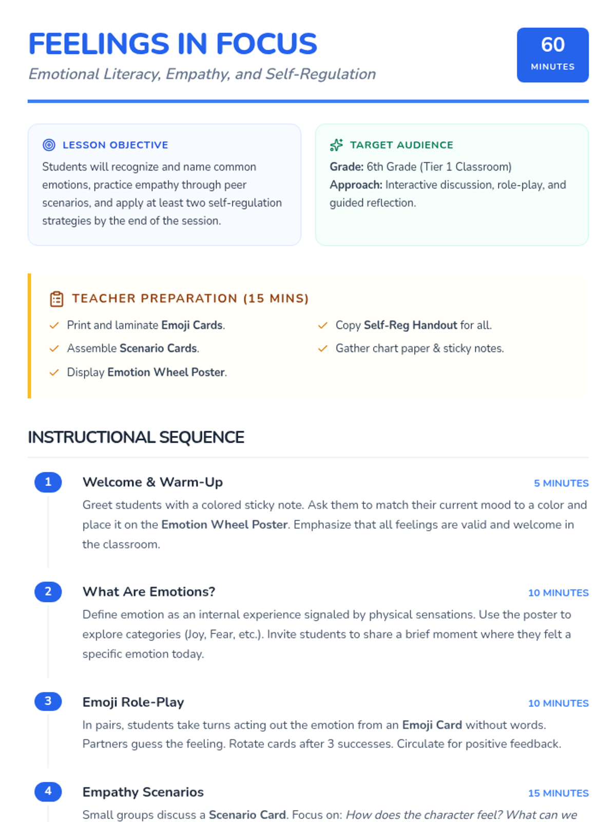 A foundational 60-minute SEL lesson for 6th graders focused on emotional literacy, empathy, and self-regulation. Students explore a range of emotions using an emotion wheel, practice identification with emoji role-play, and develop personal self-regulation plans.
