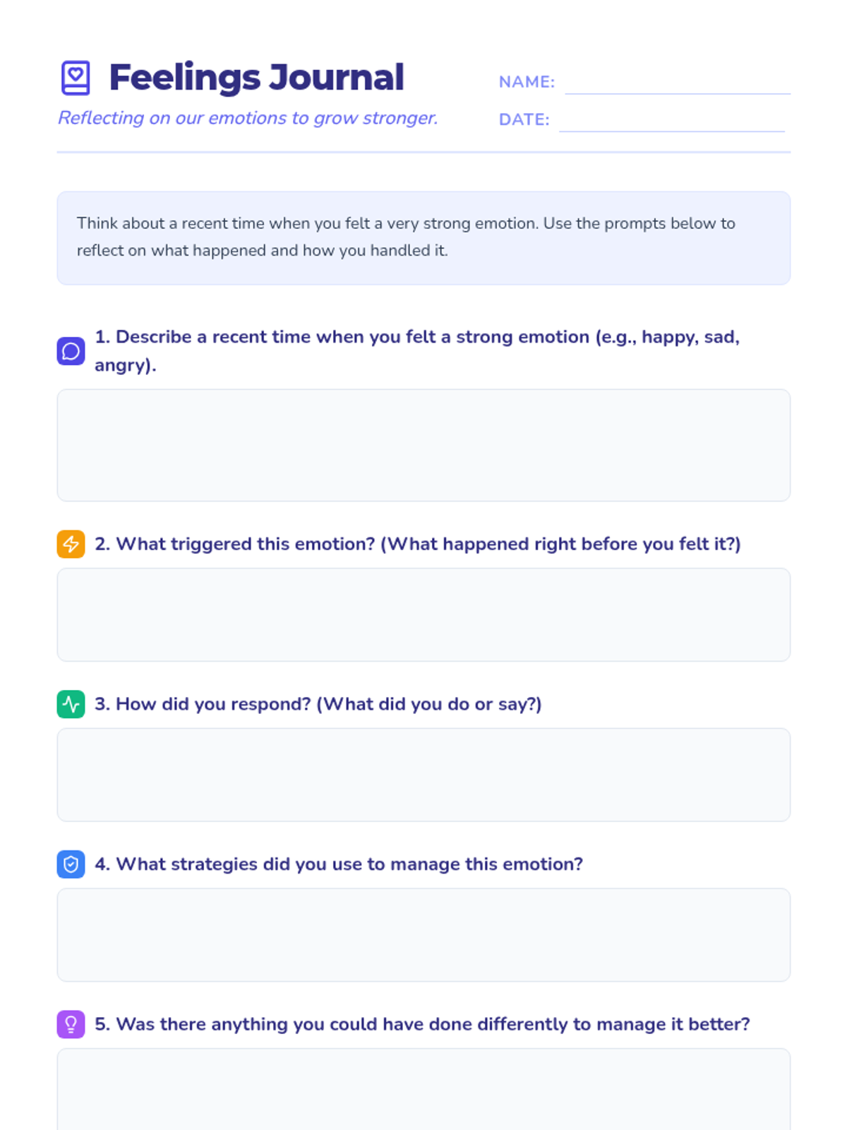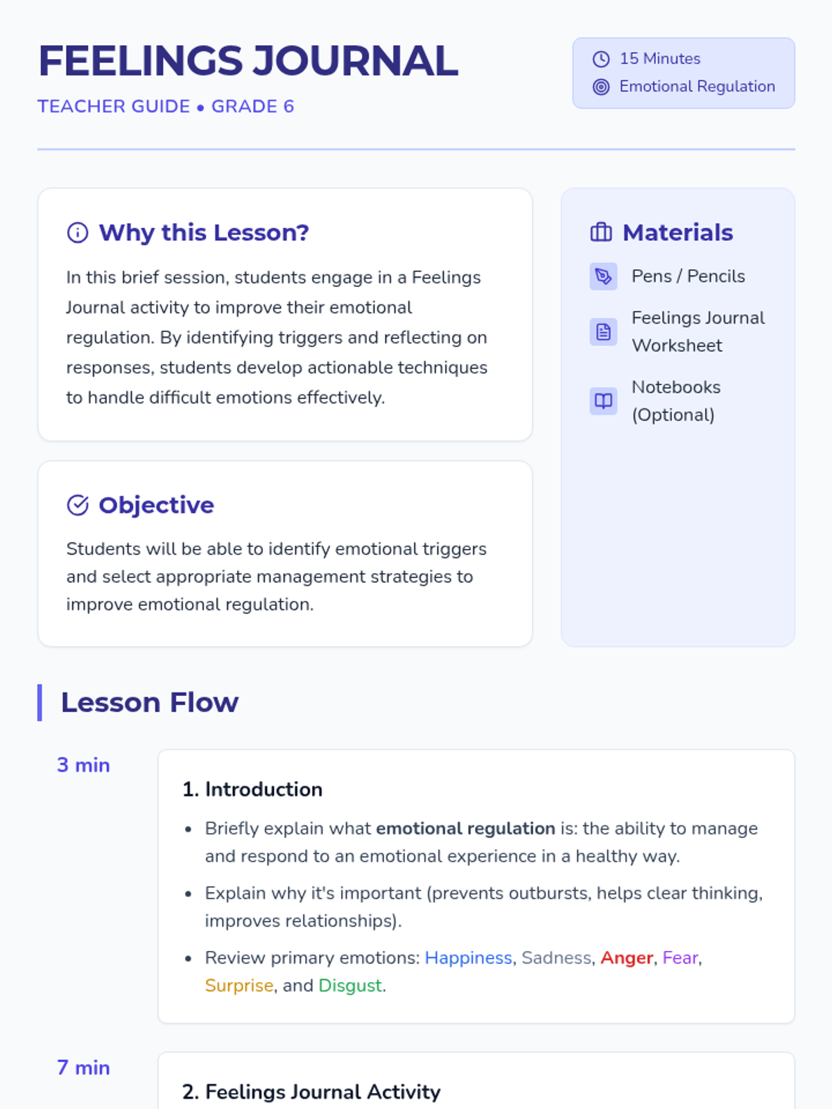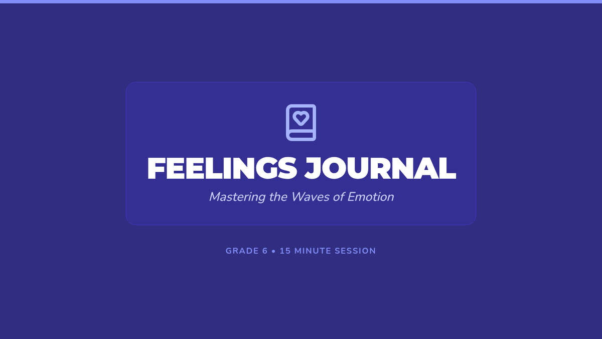 A quick 15-minute session for 6th graders to explore emotional regulation through personal reflection and guided discussion. Students learn to identify triggers and practice management strategies.