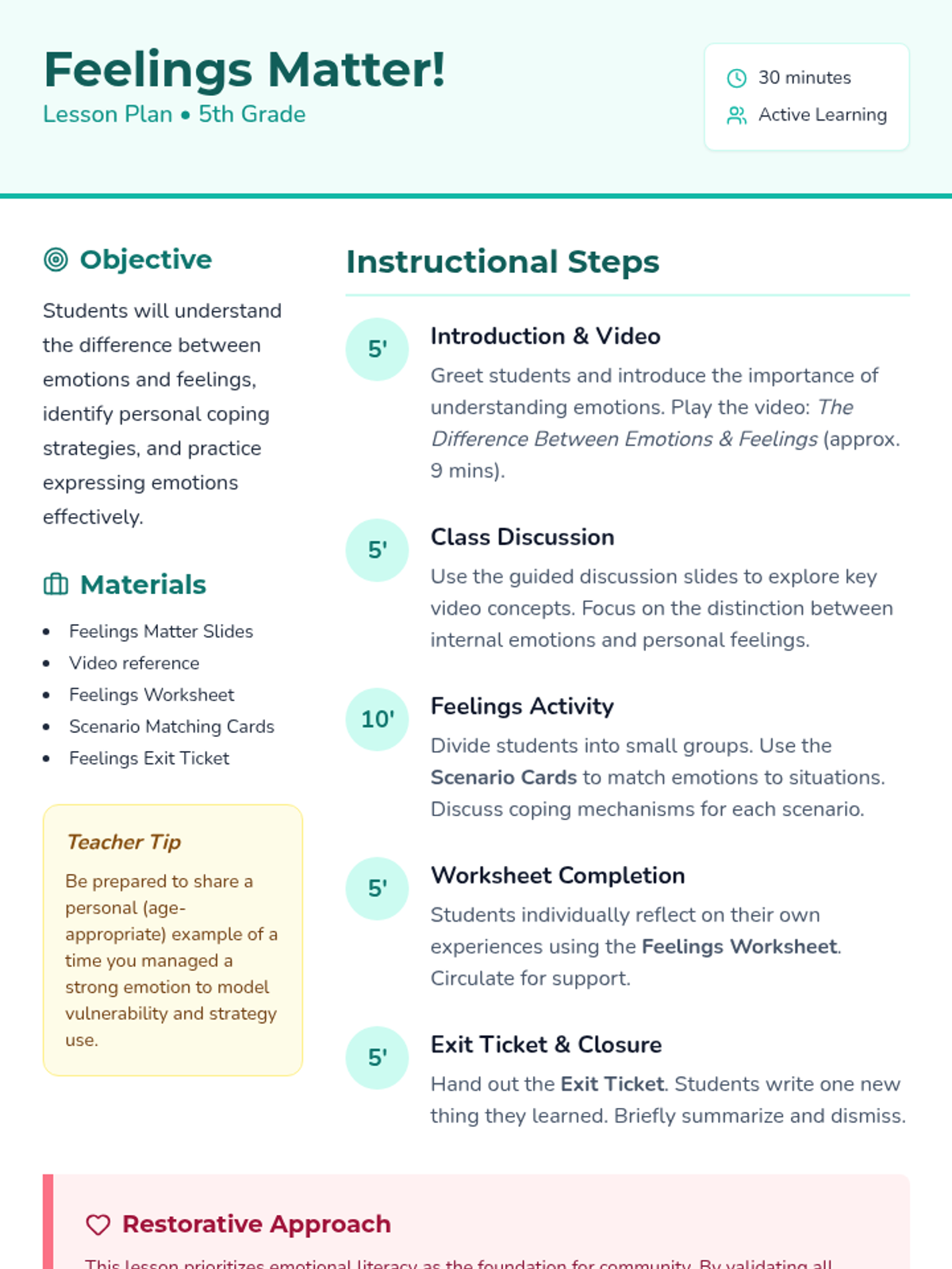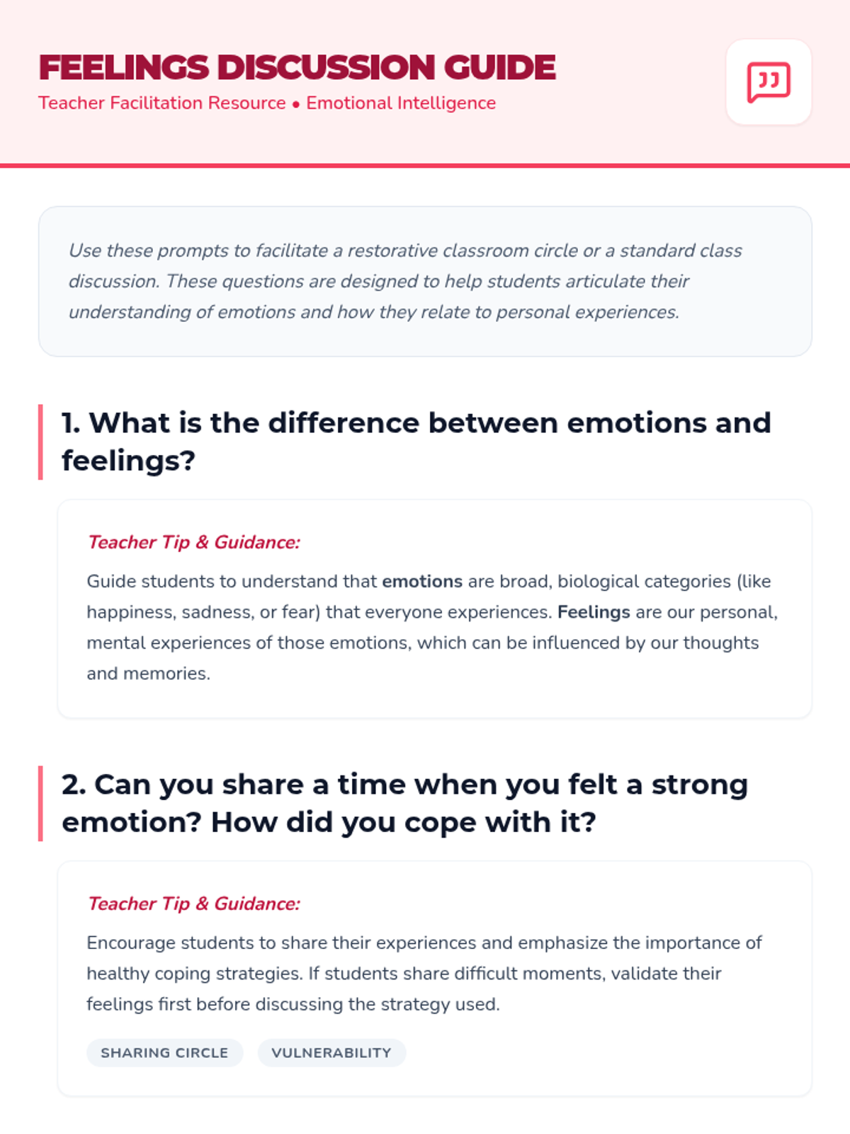 Students explore the concept of emotions, learning to identify, understand, and express their feelings to build emotional intelligence and empathy.