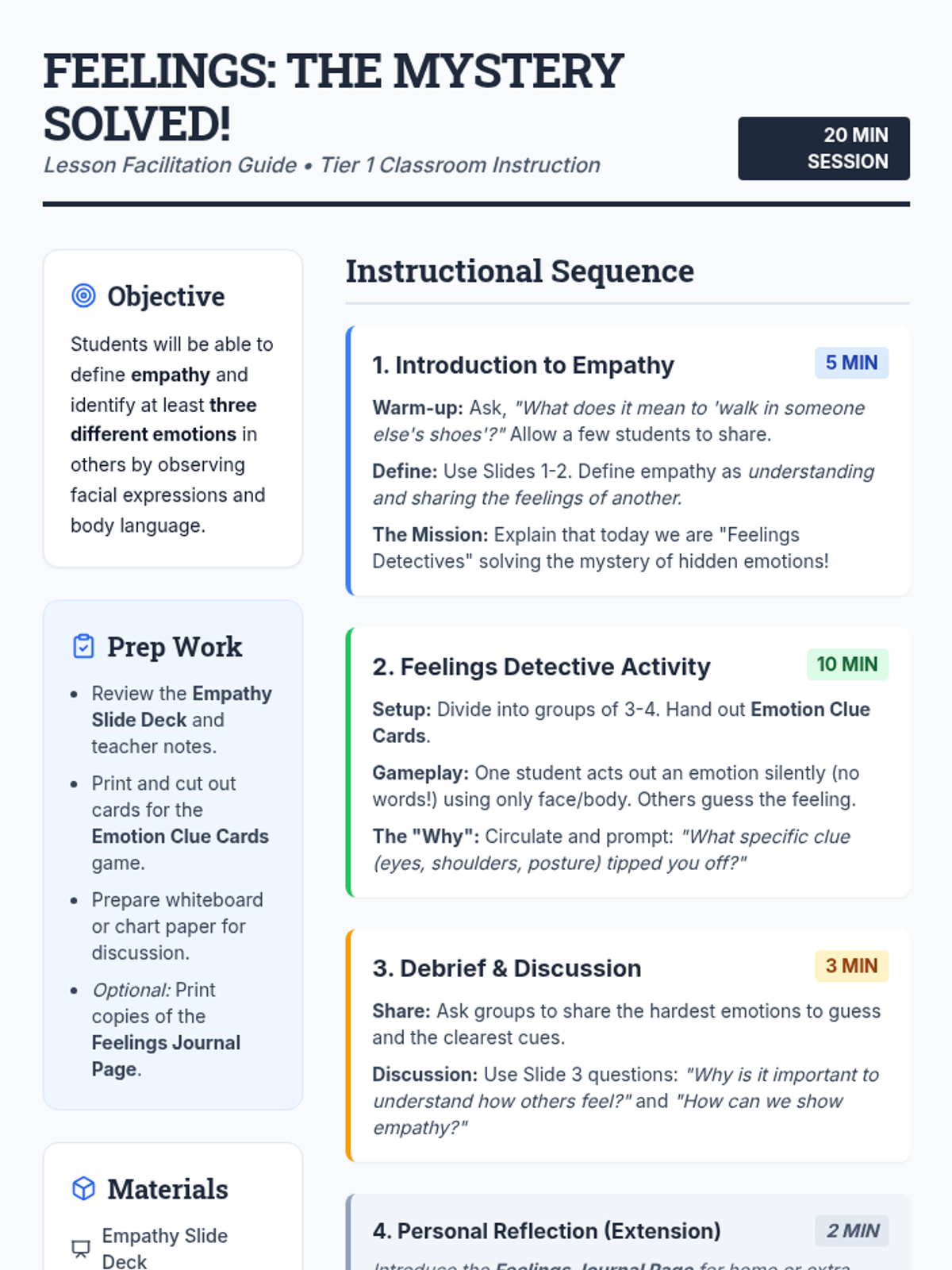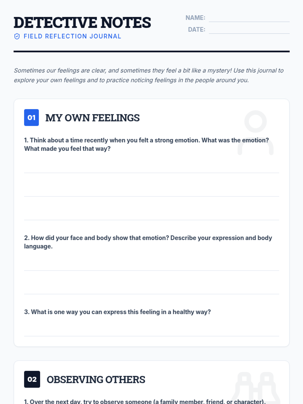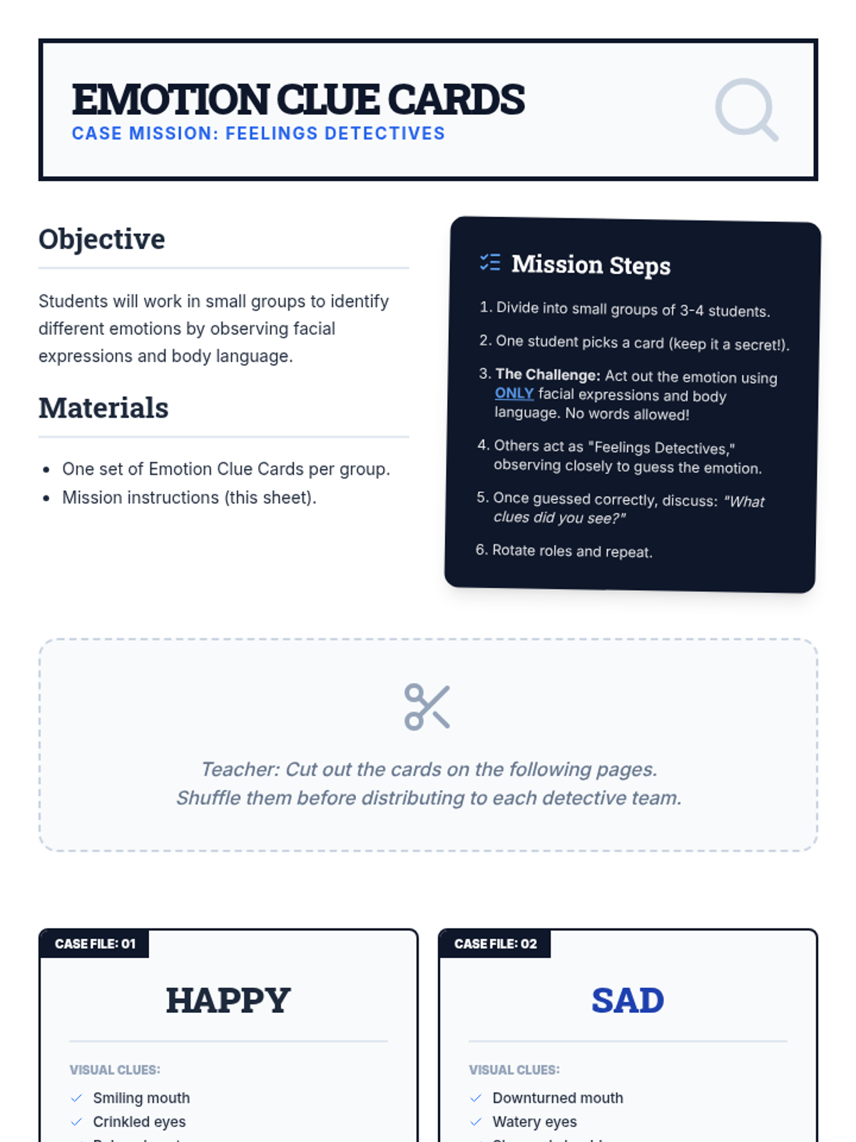 A single-session 20-minute lesson for 5th graders to master the art of identifying emotions through non-verbal cues, turning them into 'Feelings Detectives.' Students explore empathy by observing facial expressions and body language in a mystery-themed classroom experience.