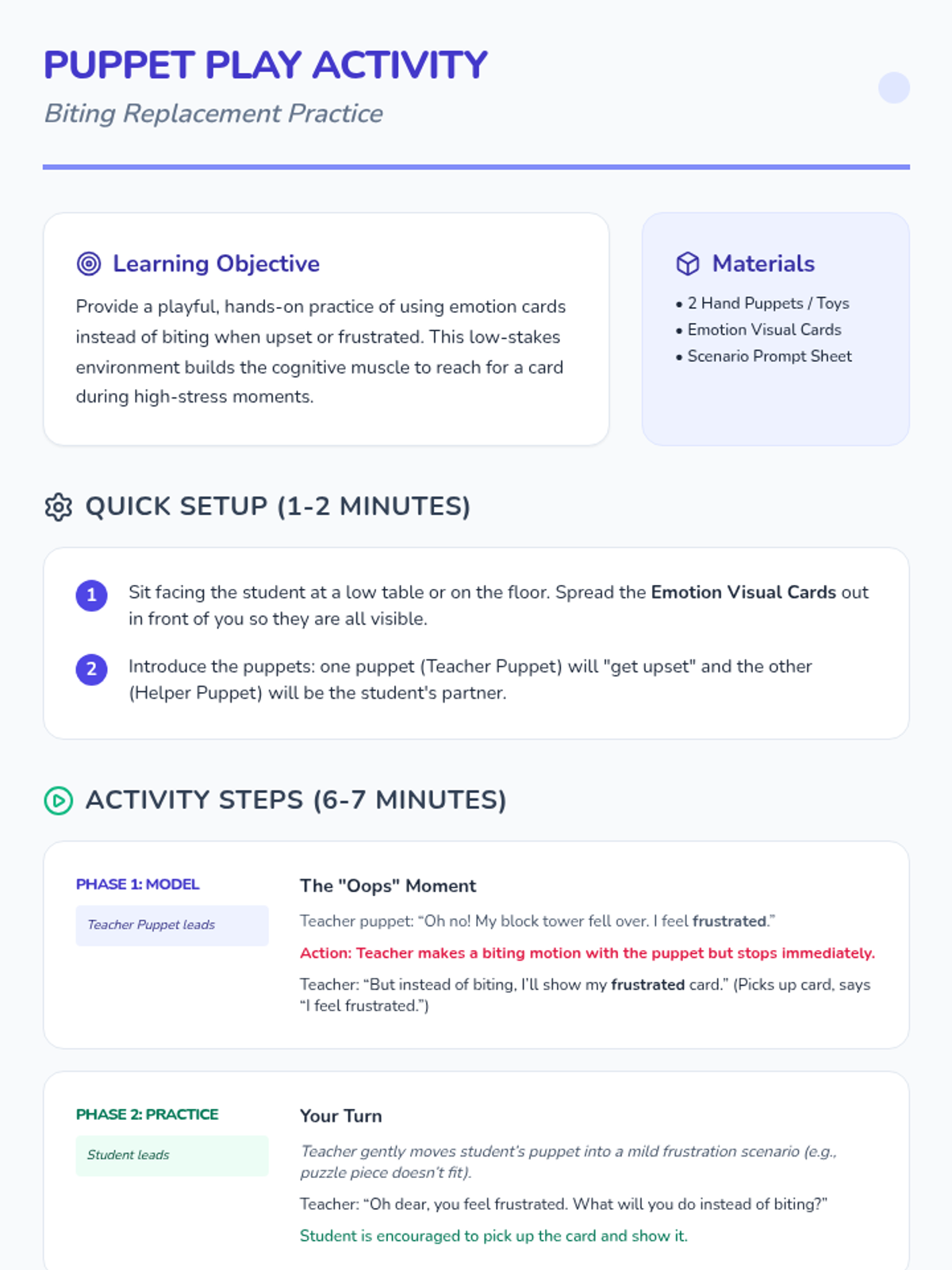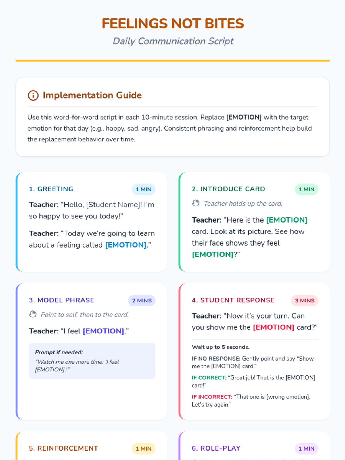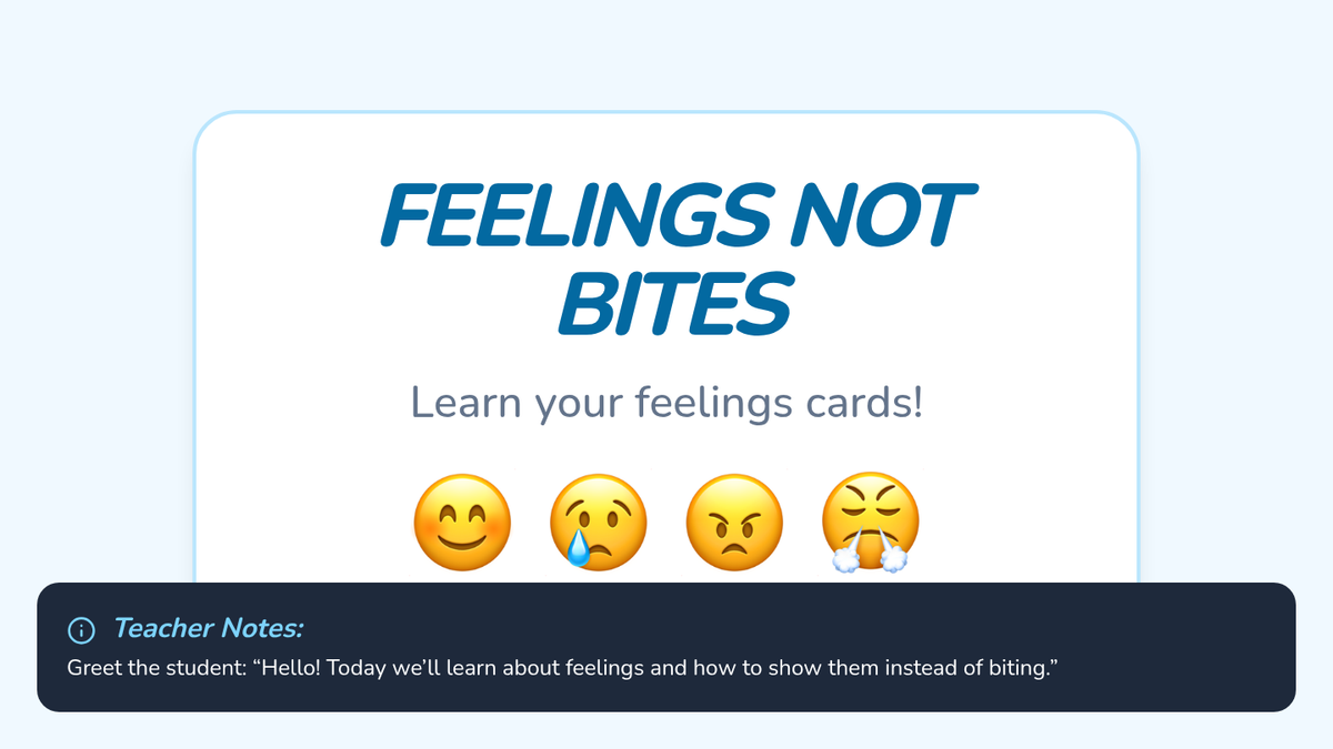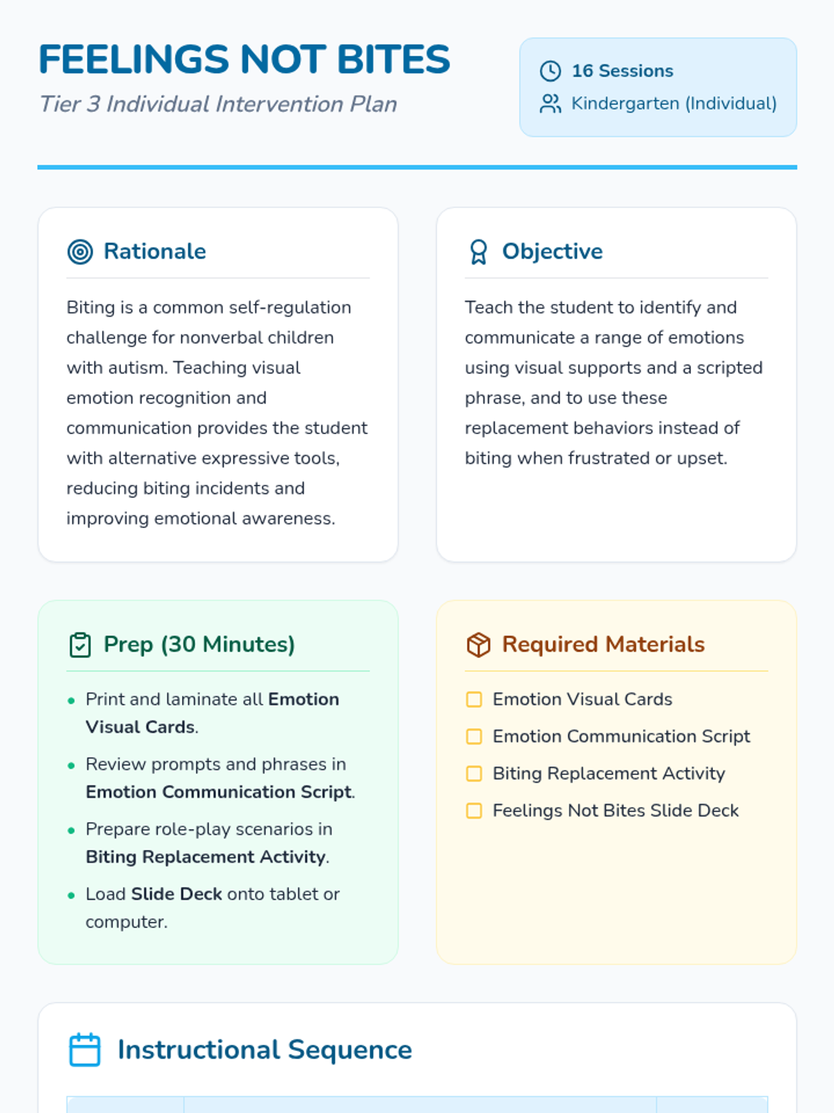 A 16-session Tier 3 intervention for a 6-year-old student with autism, focused on replacing biting behaviors with visual emotion communication. This intensive program uses modeling, scripts, and visual aids to build emotional regulation and functional communication.