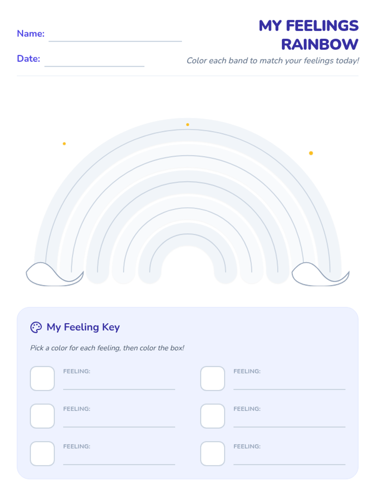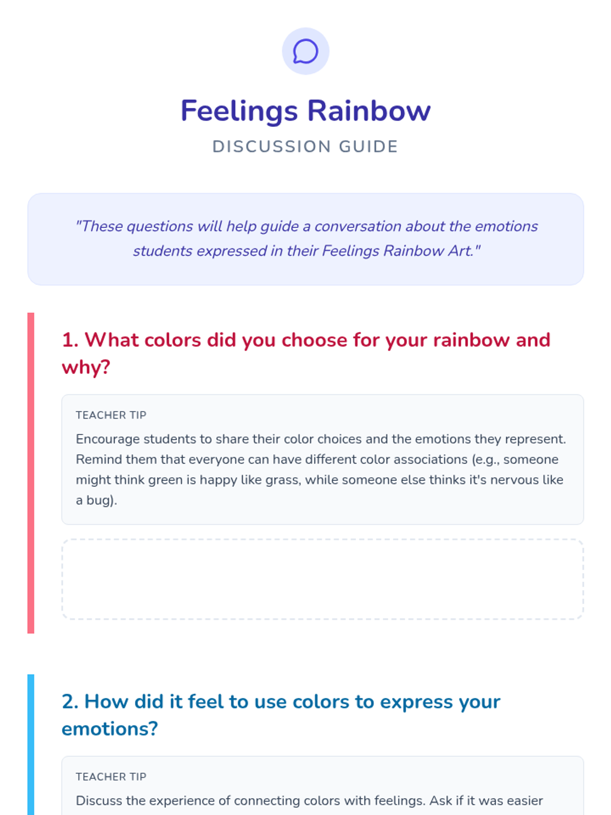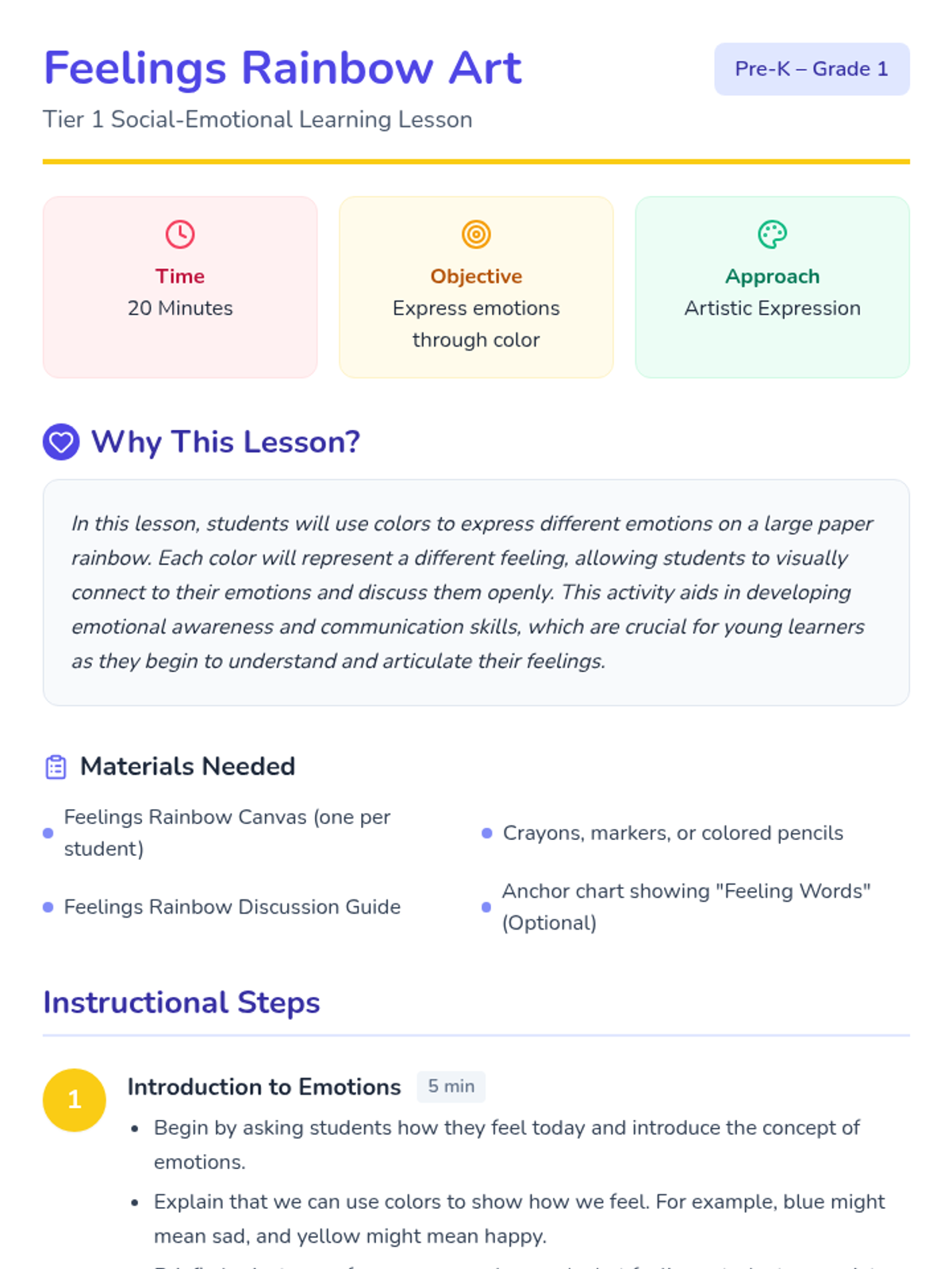 Students express emotions through color by creating a personalized 'feelings rainbow,' developing emotional literacy and communication skills through art and discussion.