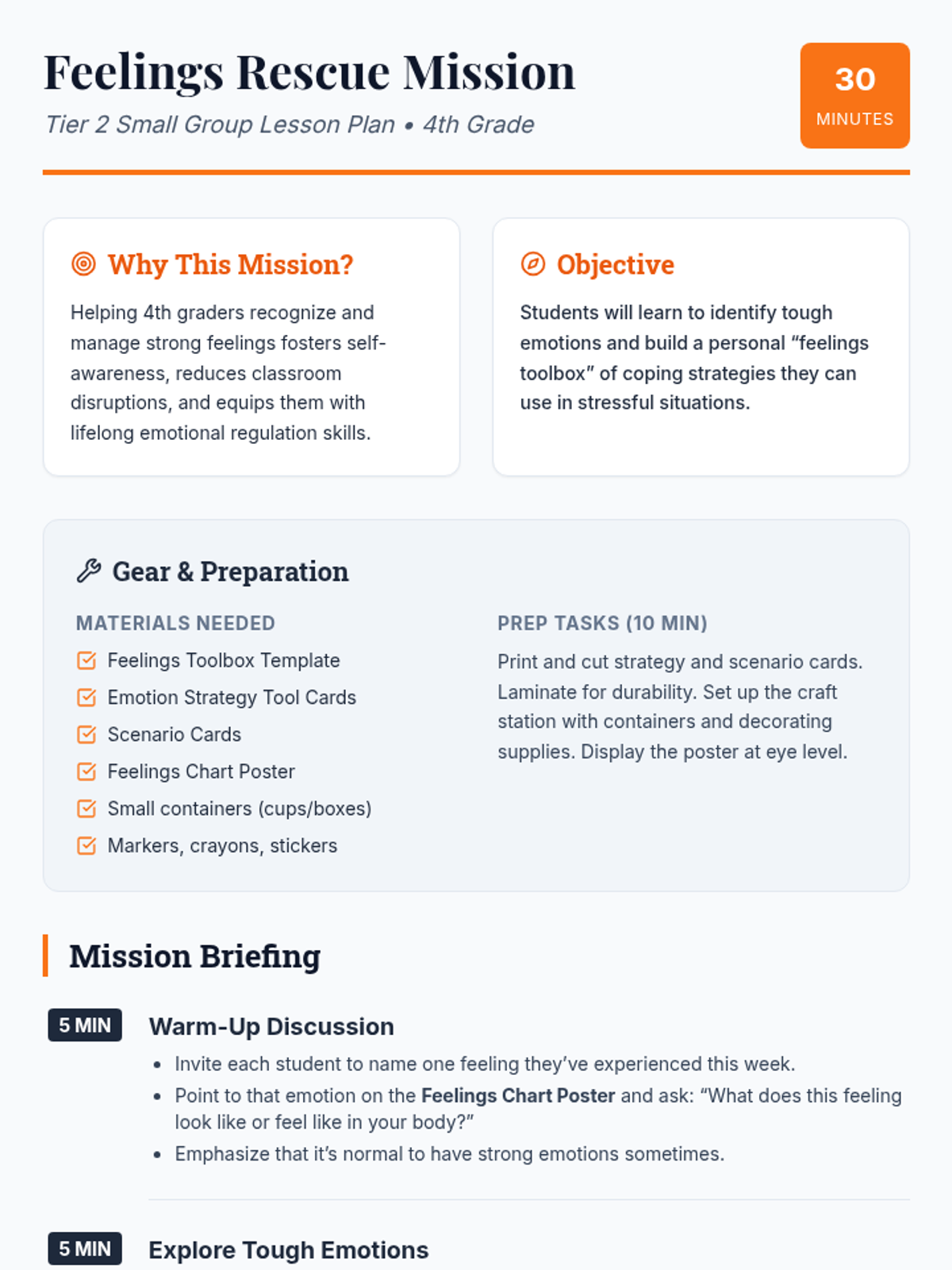A 30-minute Tier 2 small-group lesson for 4th graders focused on identifying tough emotions and building a personal 'feelings toolbox' of coping strategies.