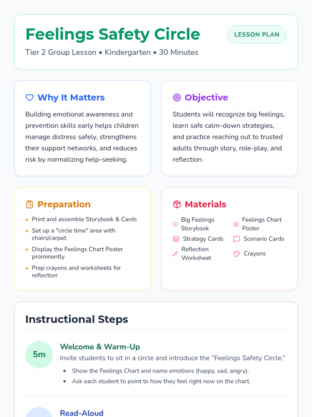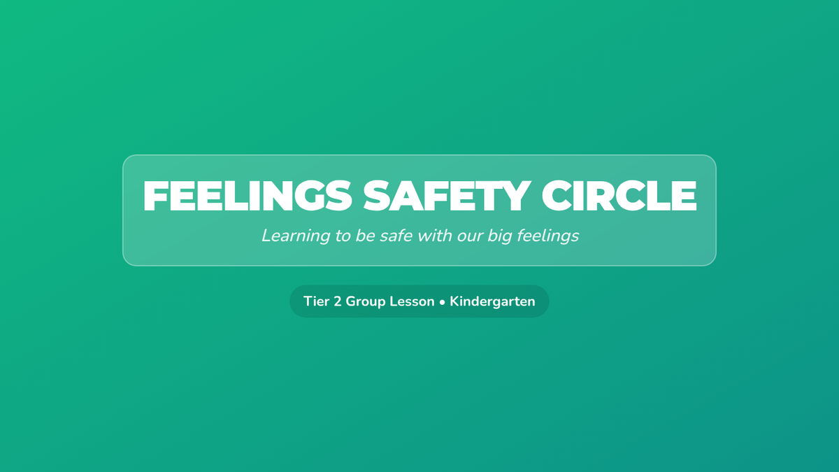 A 30-minute Tier 2 group lesson for kindergarteners focused on recognizing big feelings, learning safe calm-down strategies, and identifying trusted adults for help.