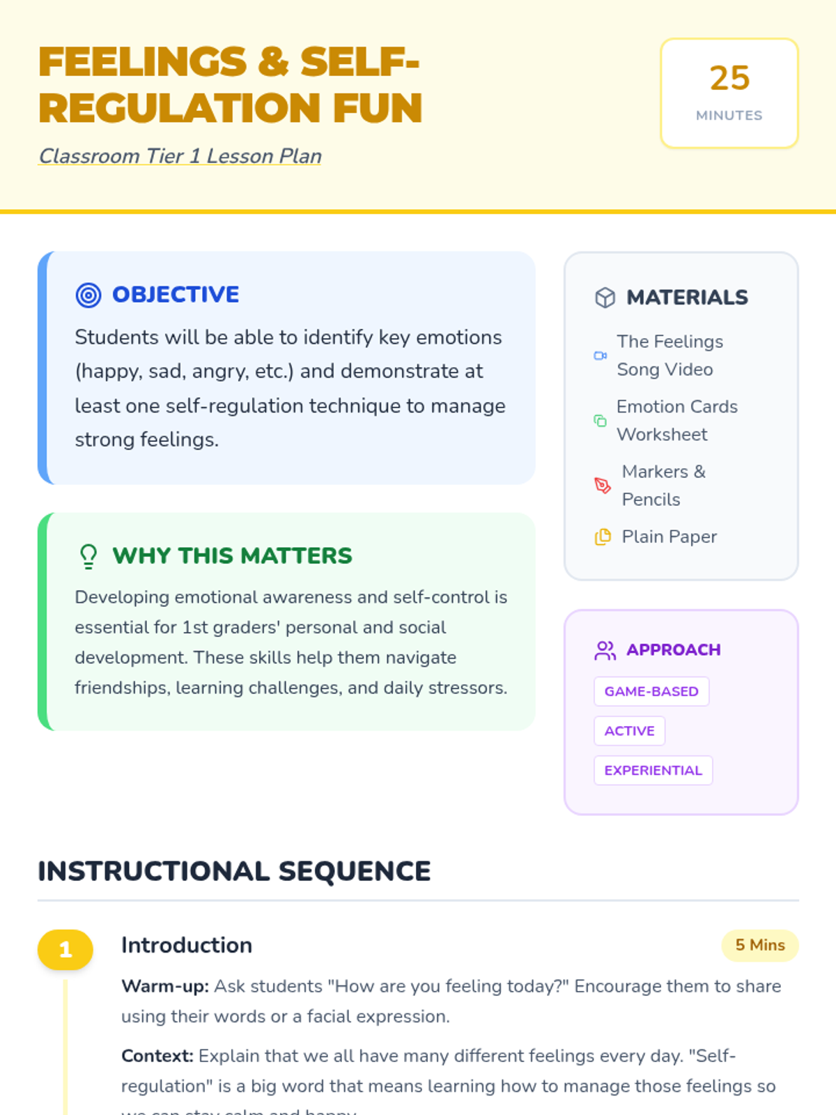 A 25-minute introductory lesson for 1st graders on identifying emotions and learning simple self-regulation techniques through songs and activities.