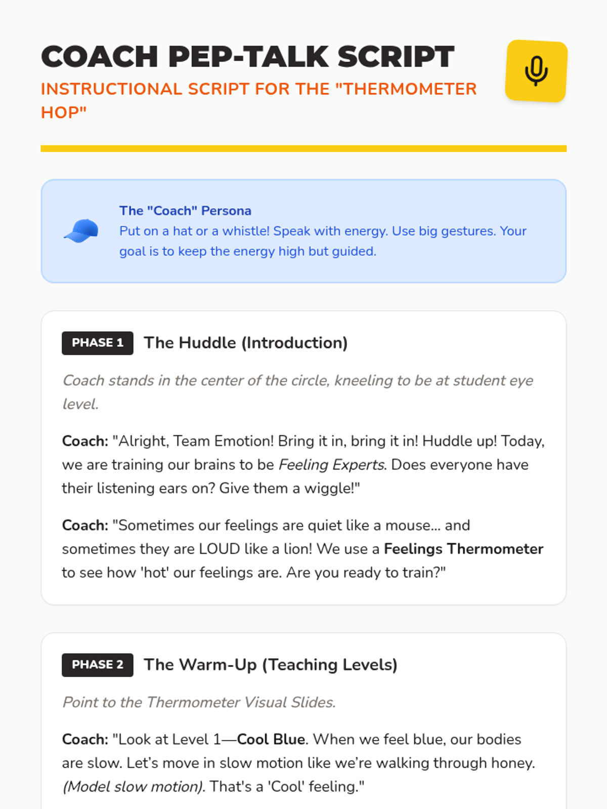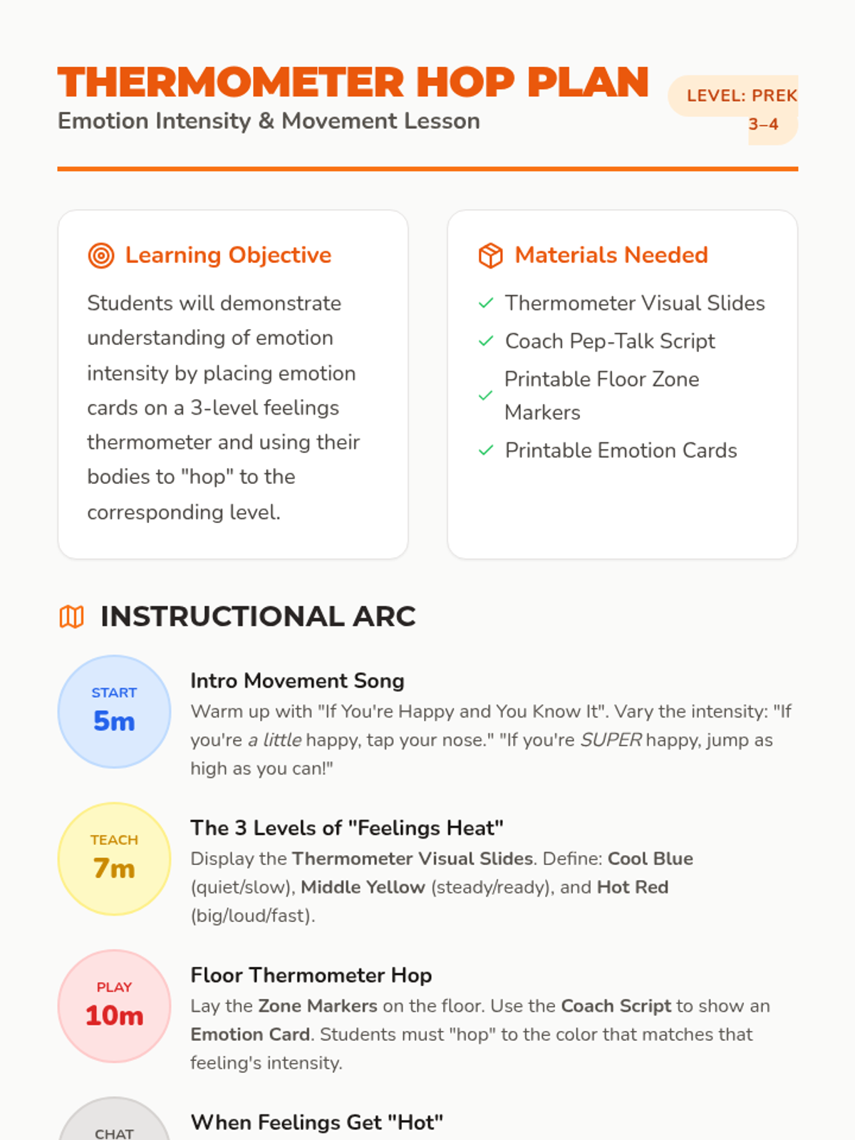 A high-energy PreK lesson where students use movement to explore emotion intensity by 'hopping' between different levels of a feelings thermometer. Students learn to categorize feelings as 'cool,' 'middle,' or 'hot' through active play and discussion.
