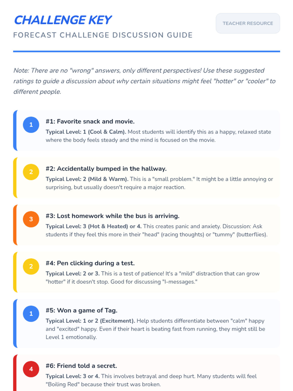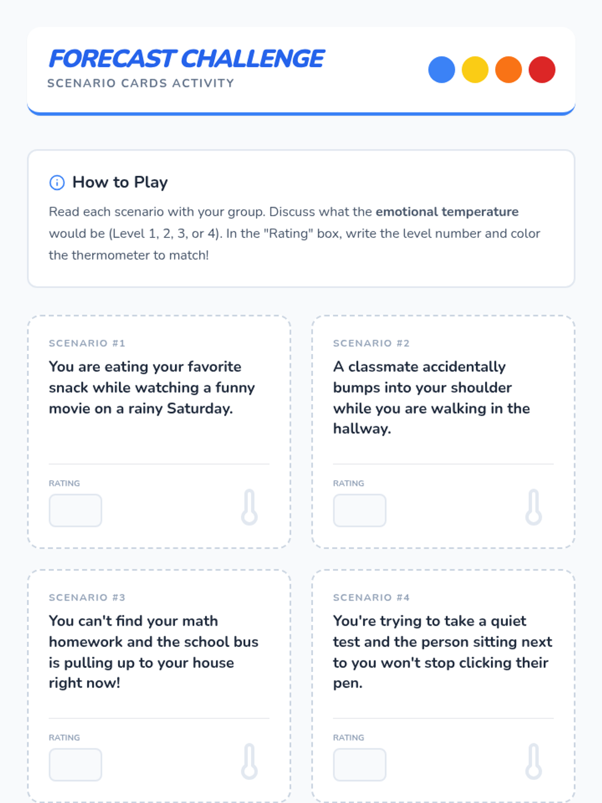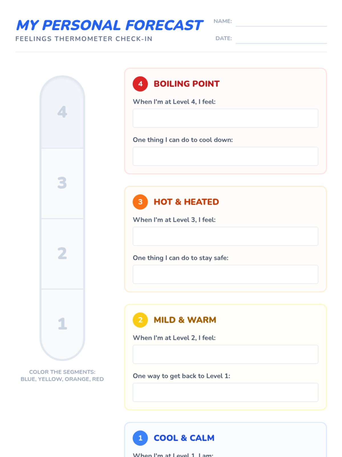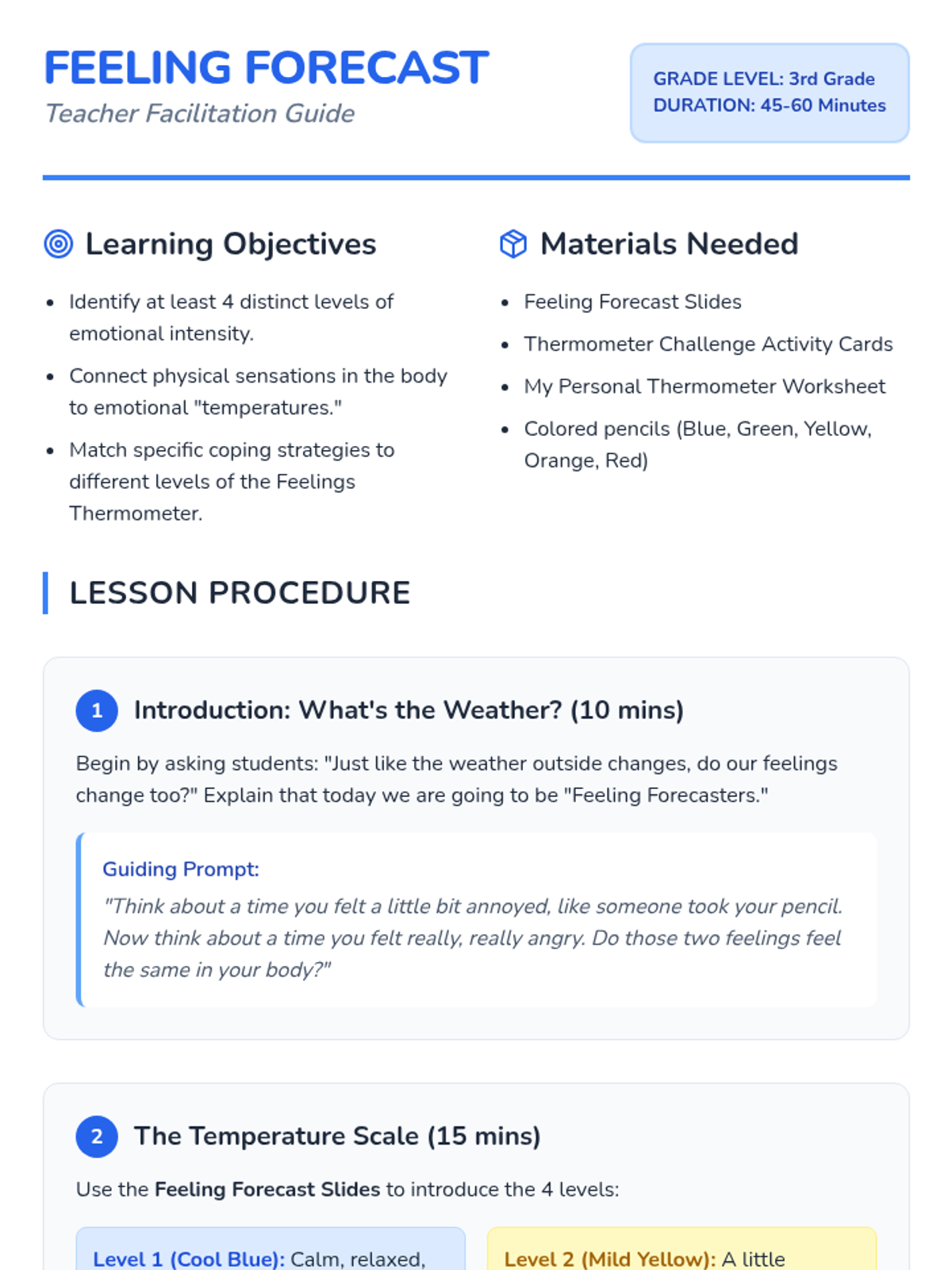 Students learn to identify and rate the intensity of their emotions using a 'Feelings Thermometer' to develop self-awareness and regulation strategies.