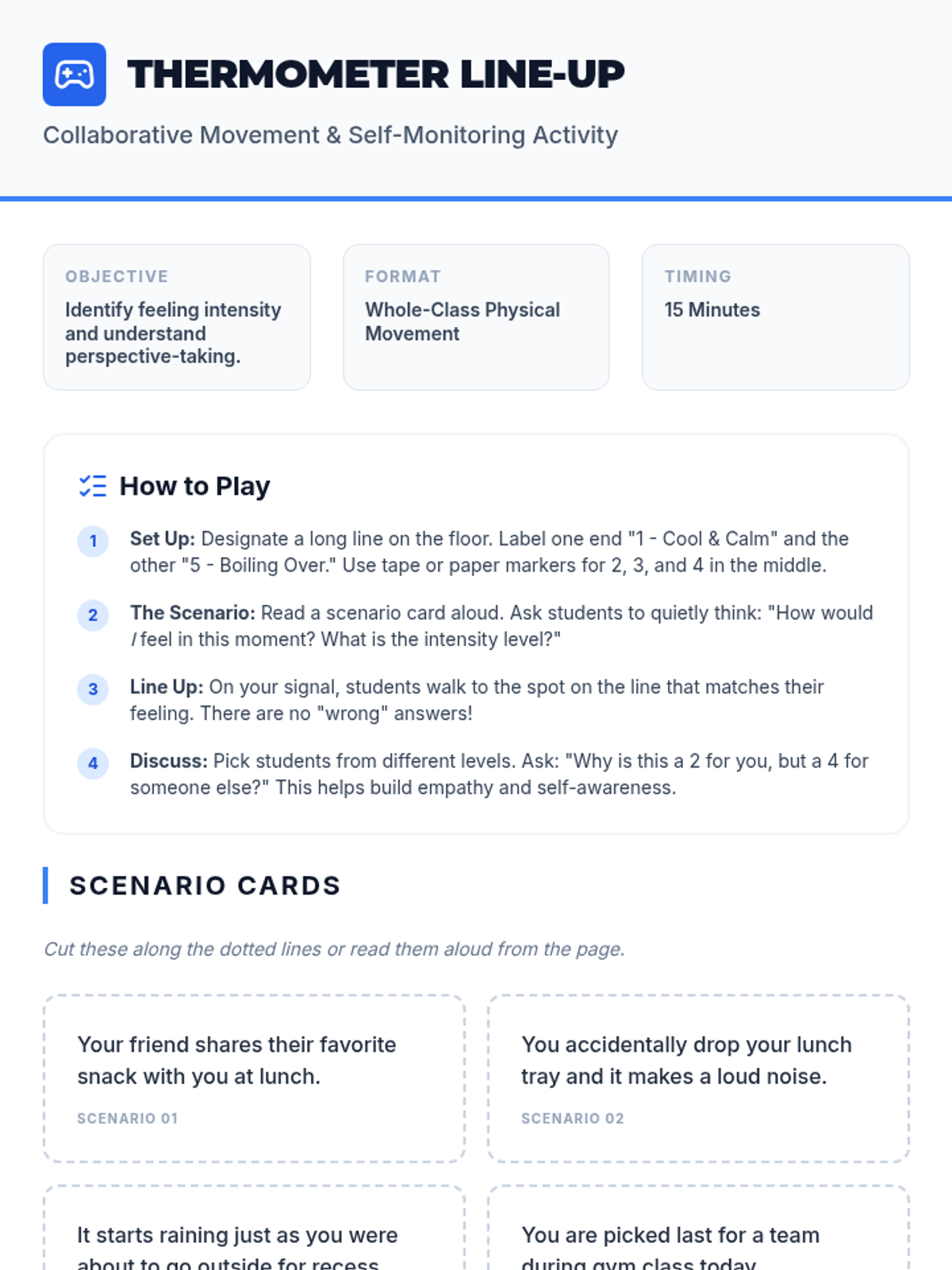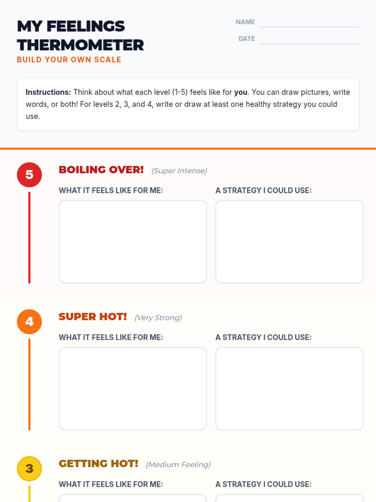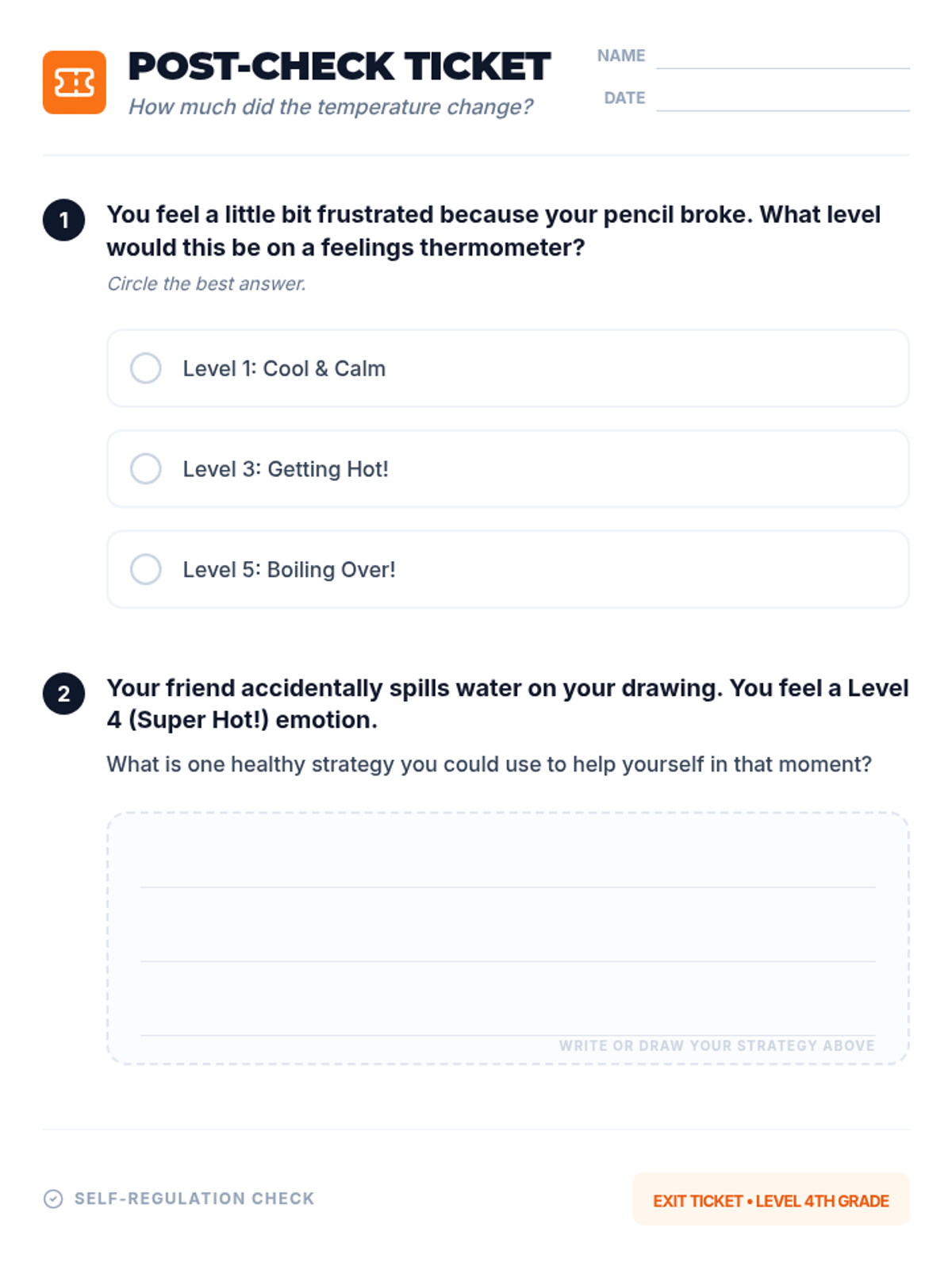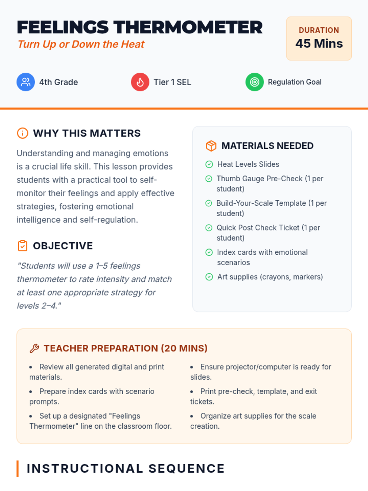 A 45-minute social-emotional learning lesson for 4th graders to identify emotional intensity using a 1-5 scale and match appropriate coping strategies to their 'heat level'.