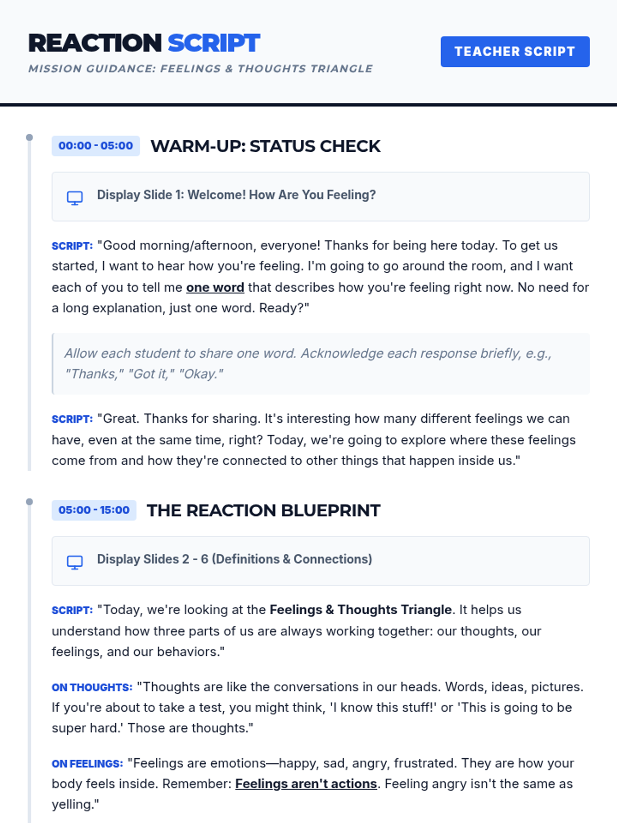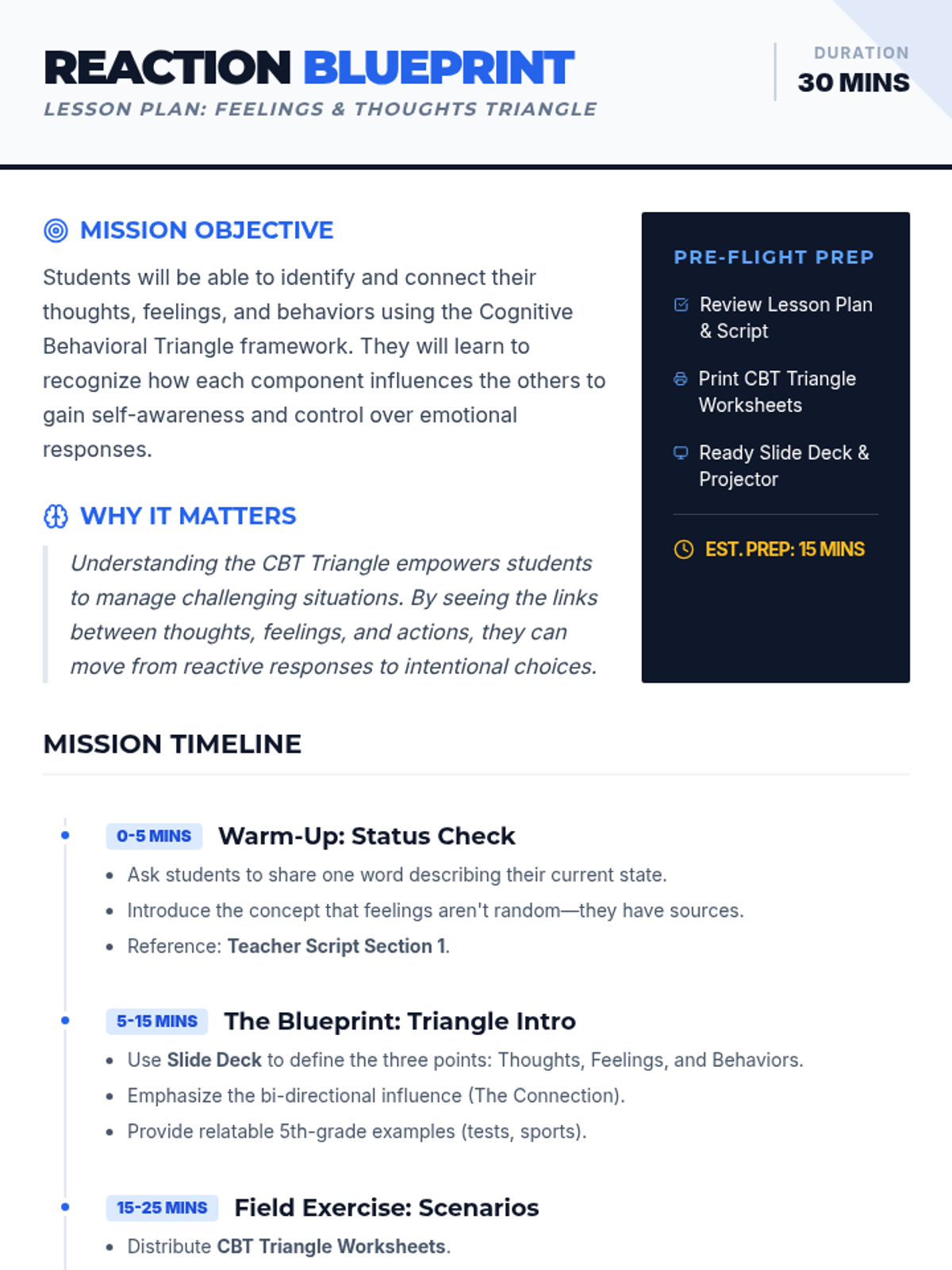 A 30-minute group lesson for 5th-grade boys focused on understanding the Cognitive Behavioral Triangle to connect thoughts, feelings, and behaviors.