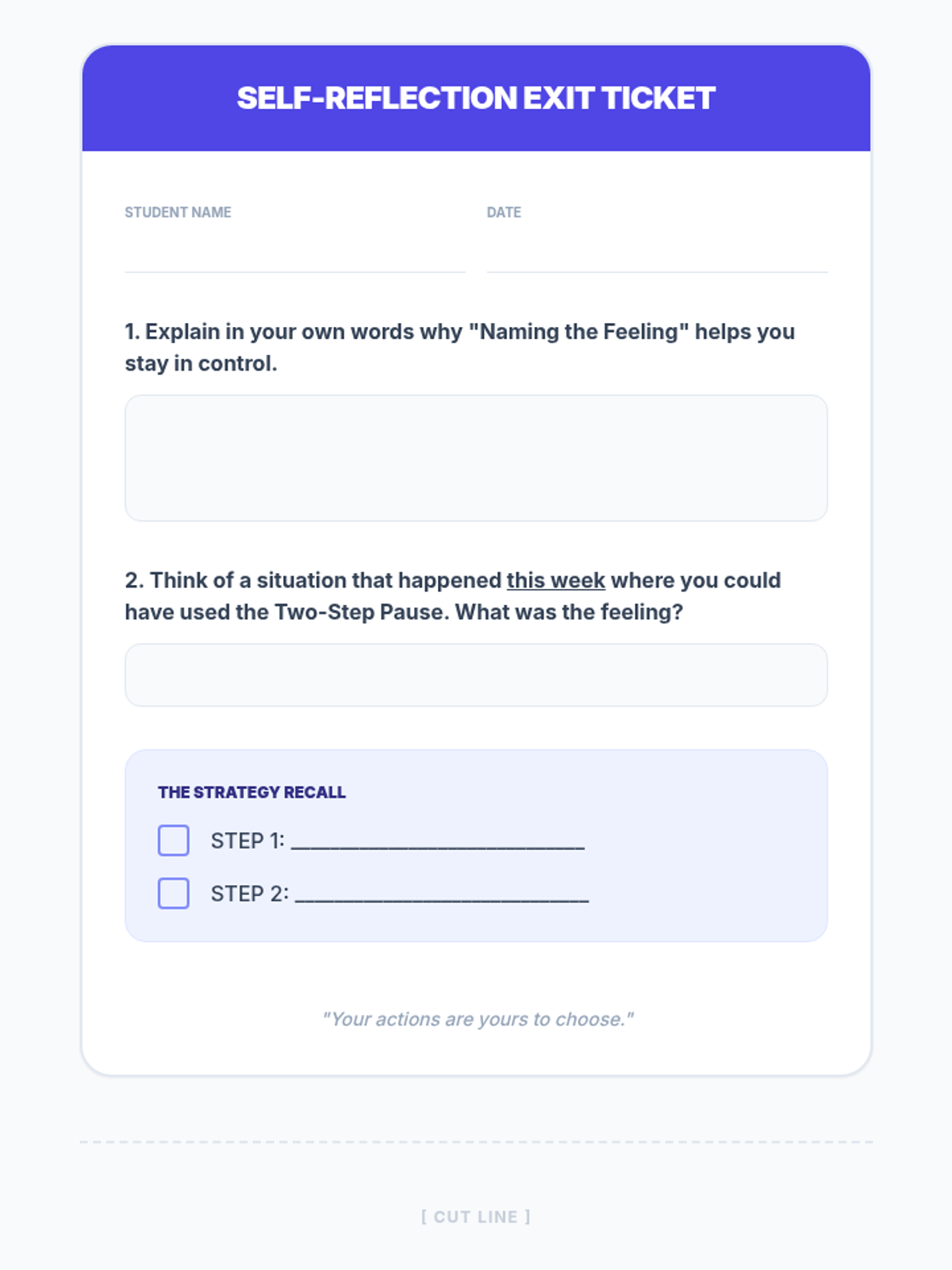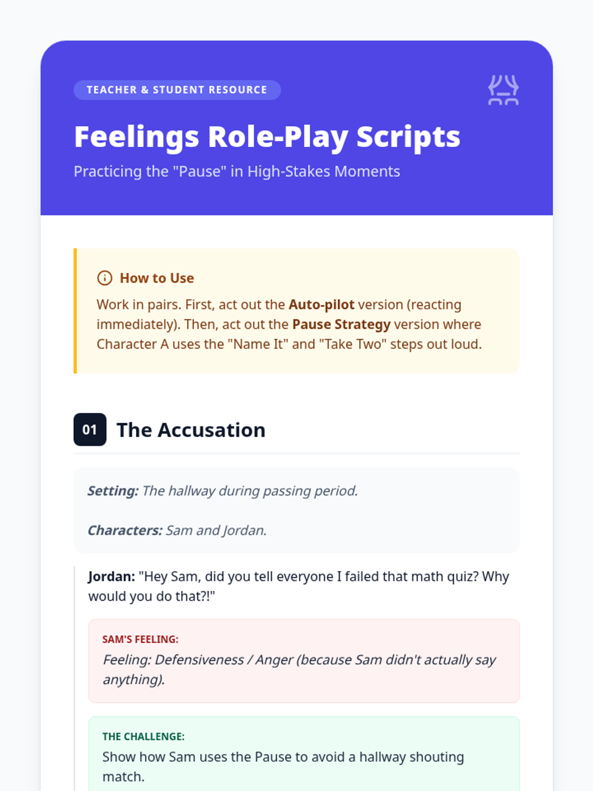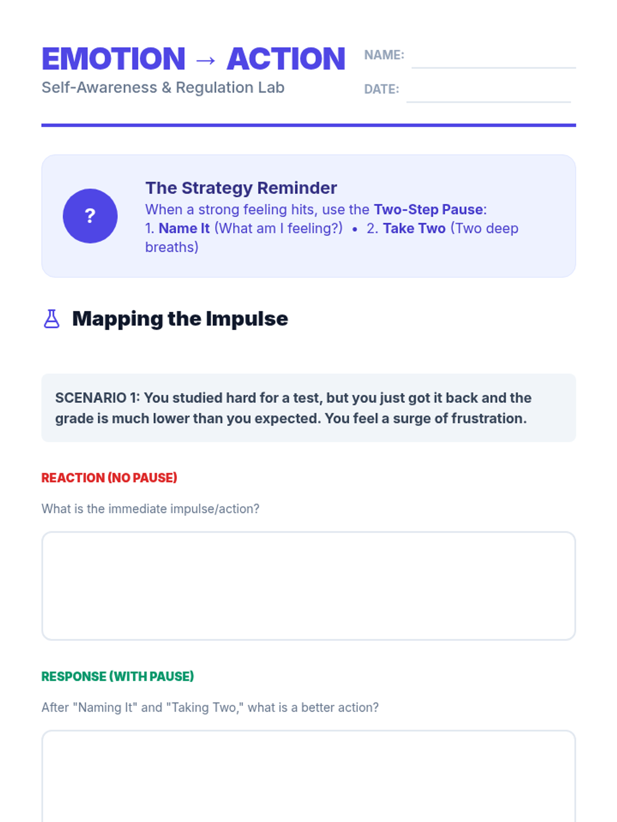 A 30-minute SEL lesson for 7th graders focusing on the link between emotions and behaviors, featuring a practical two-step pause strategy to improve self-regulation.