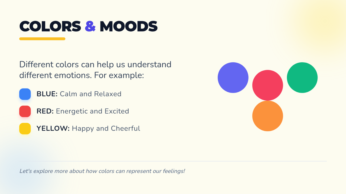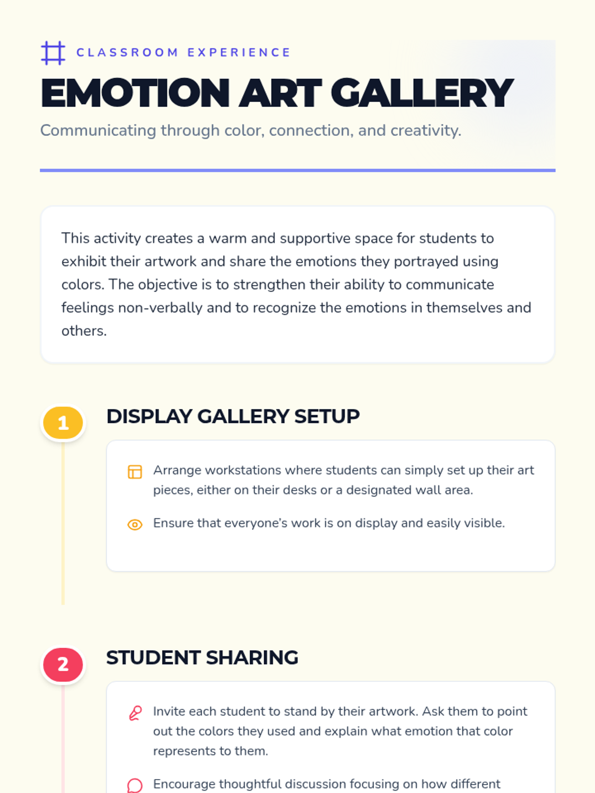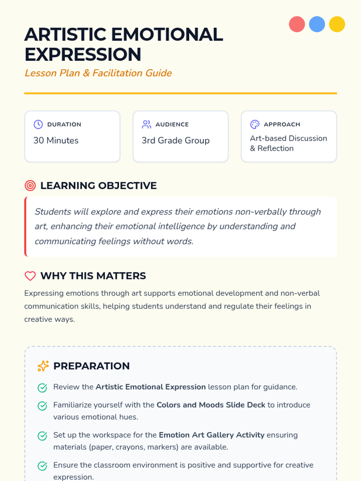 A 30-minute creative arts lesson for 3rd grade students to explore and express emotions non-verbally through color and artistic expression. Students learn to associate moods with specific hues and create their own abstract emotional artwork.