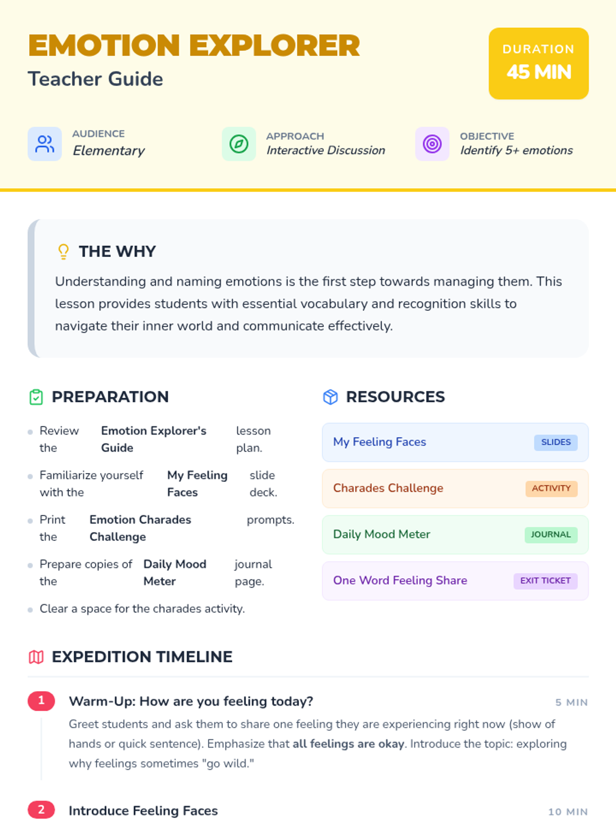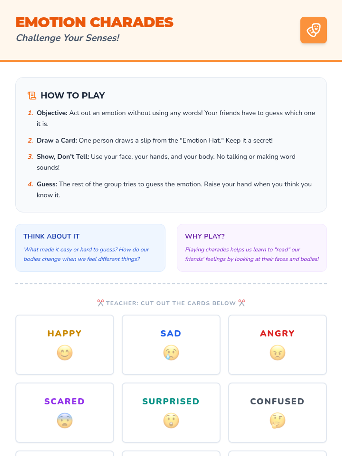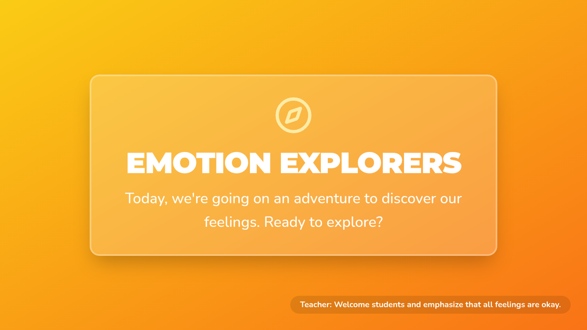 This lesson introduces elementary students to identifying and naming a range of emotions through interactive slides, a charades game, and personal reflection. Students will develop foundational SEL vocabulary to better understand their internal experiences and communicate with others.