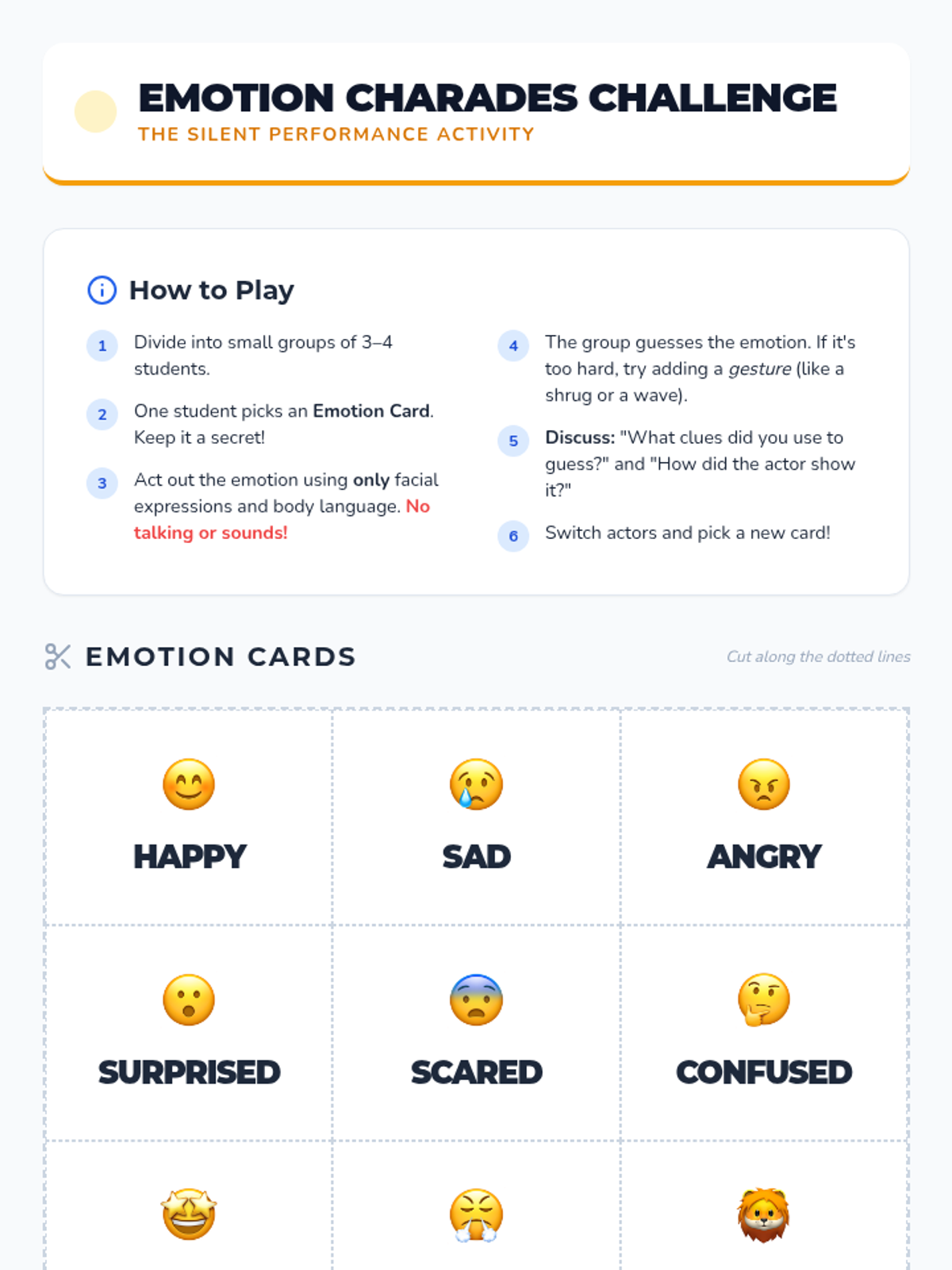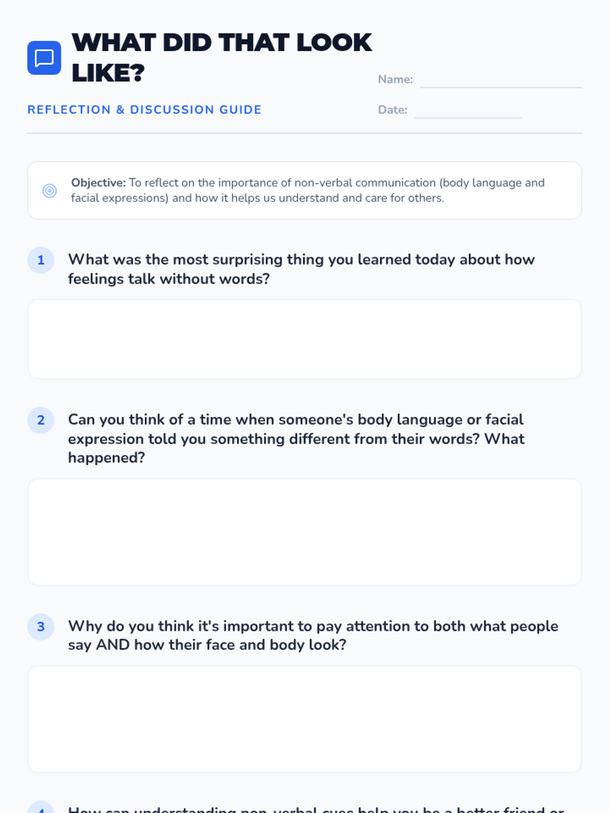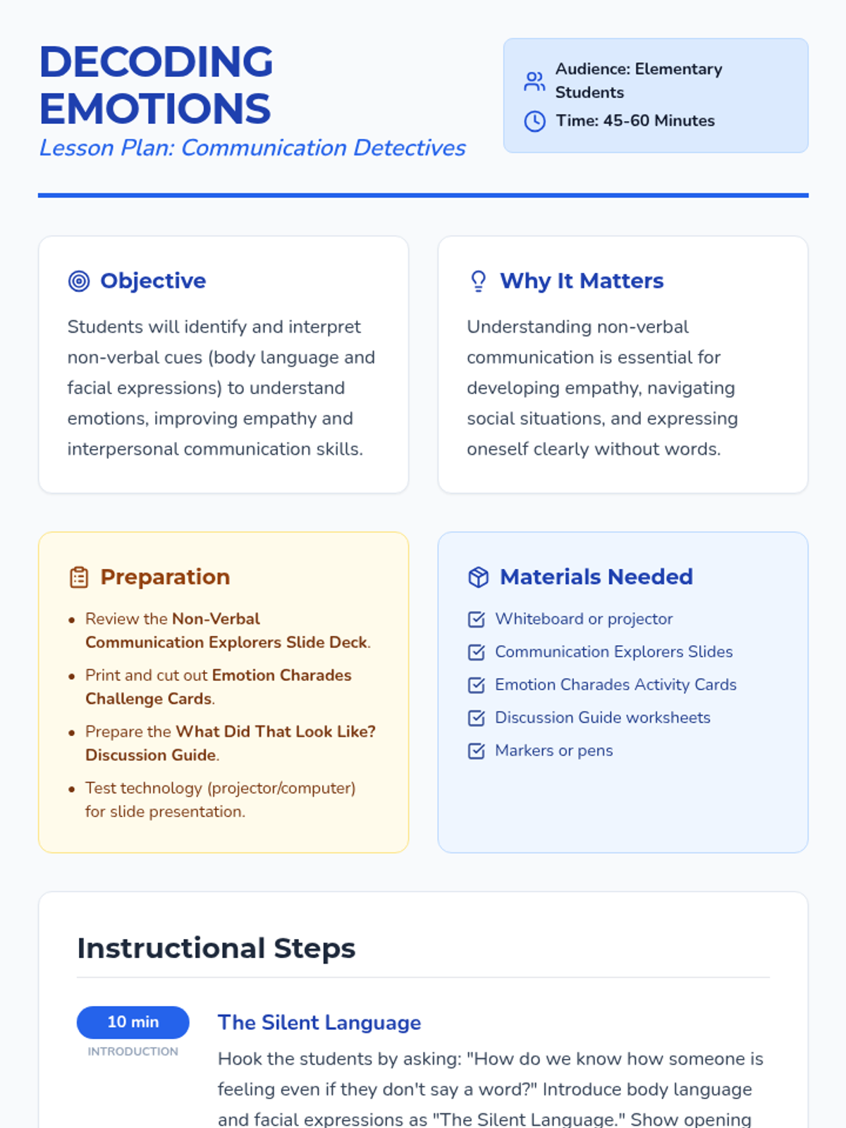 Students will learn to decode the silent language of non-verbal communication, exploring how facial expressions and body language convey emotions to foster empathy and clear communication.