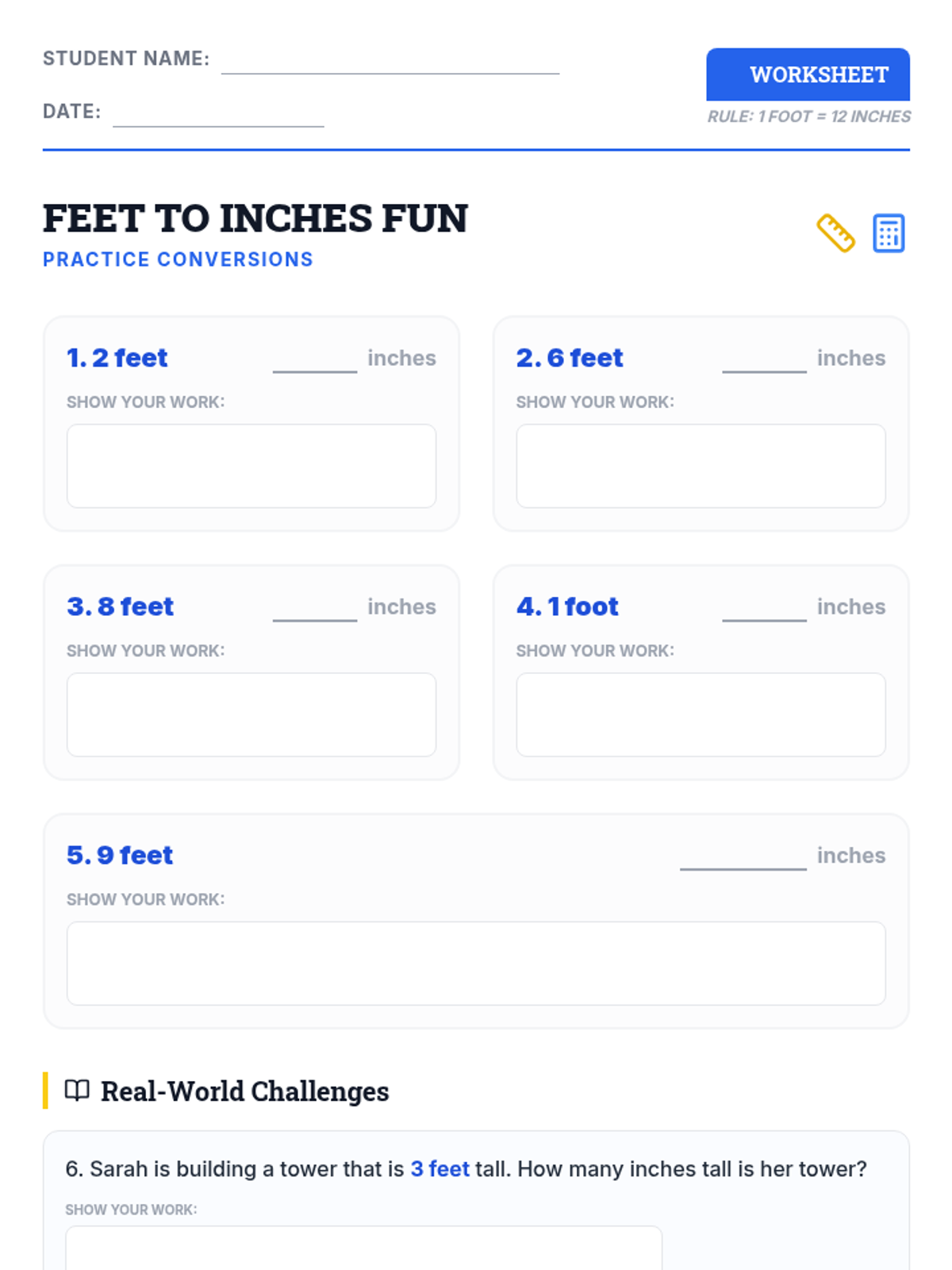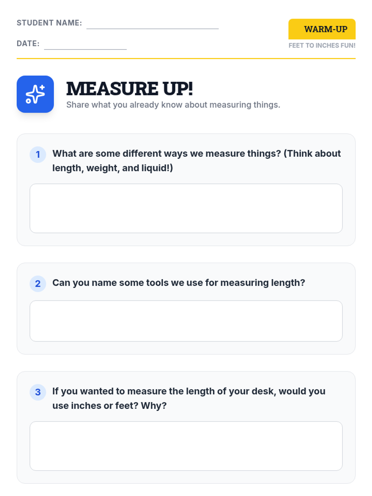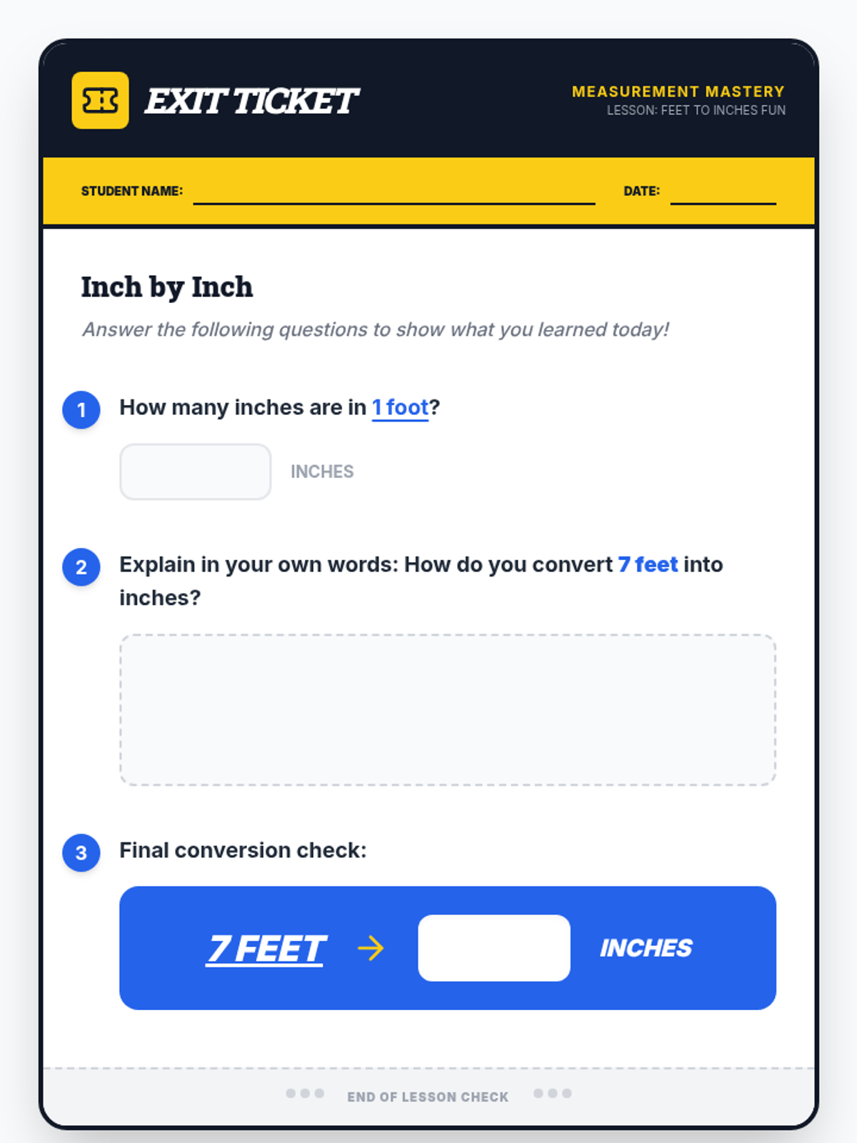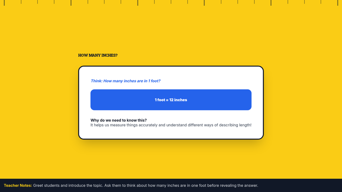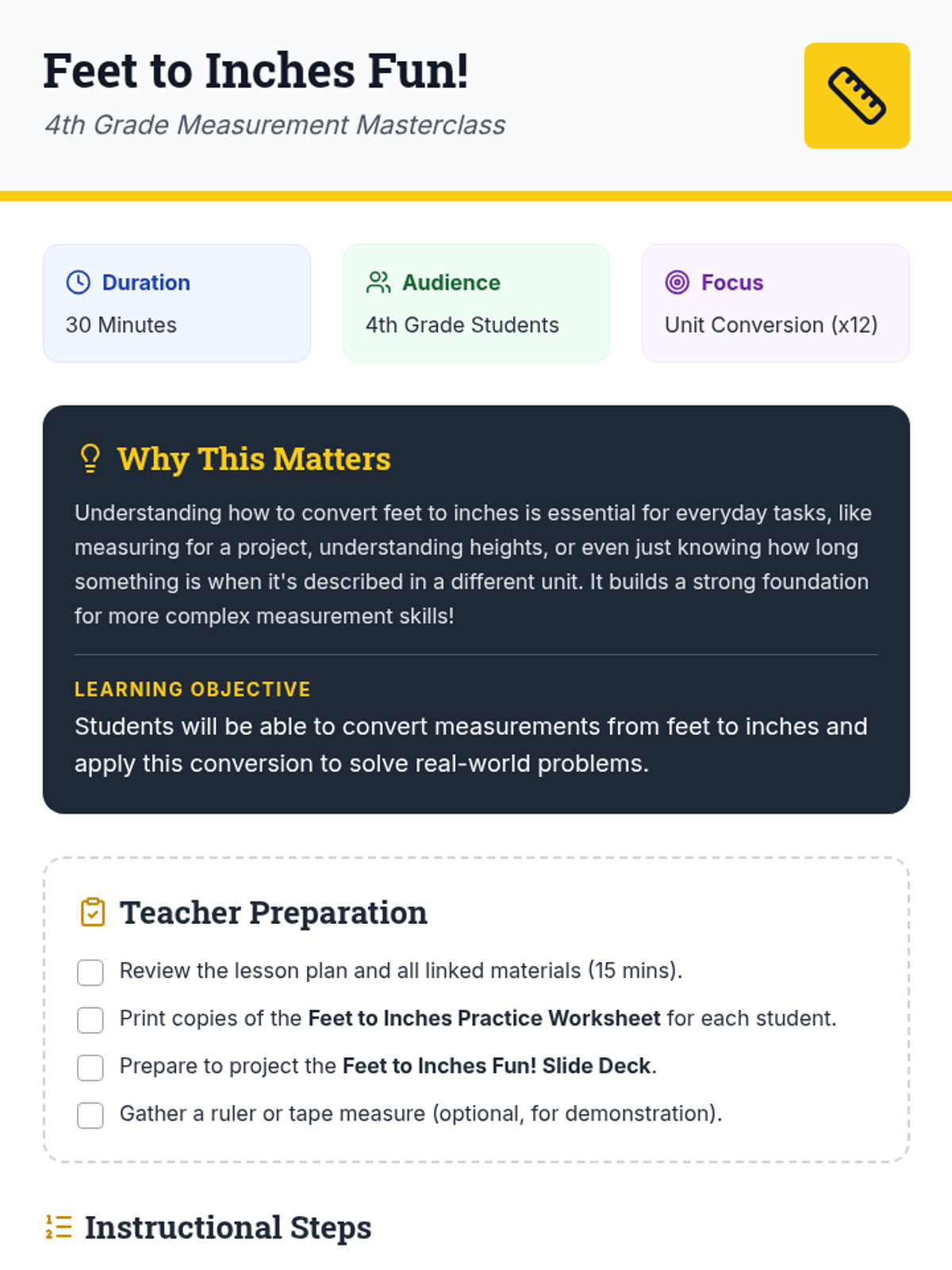 A 30-minute introductory lesson for 4th graders on converting feet to inches using multiplication, featuring interactive slides and hands-on practice.