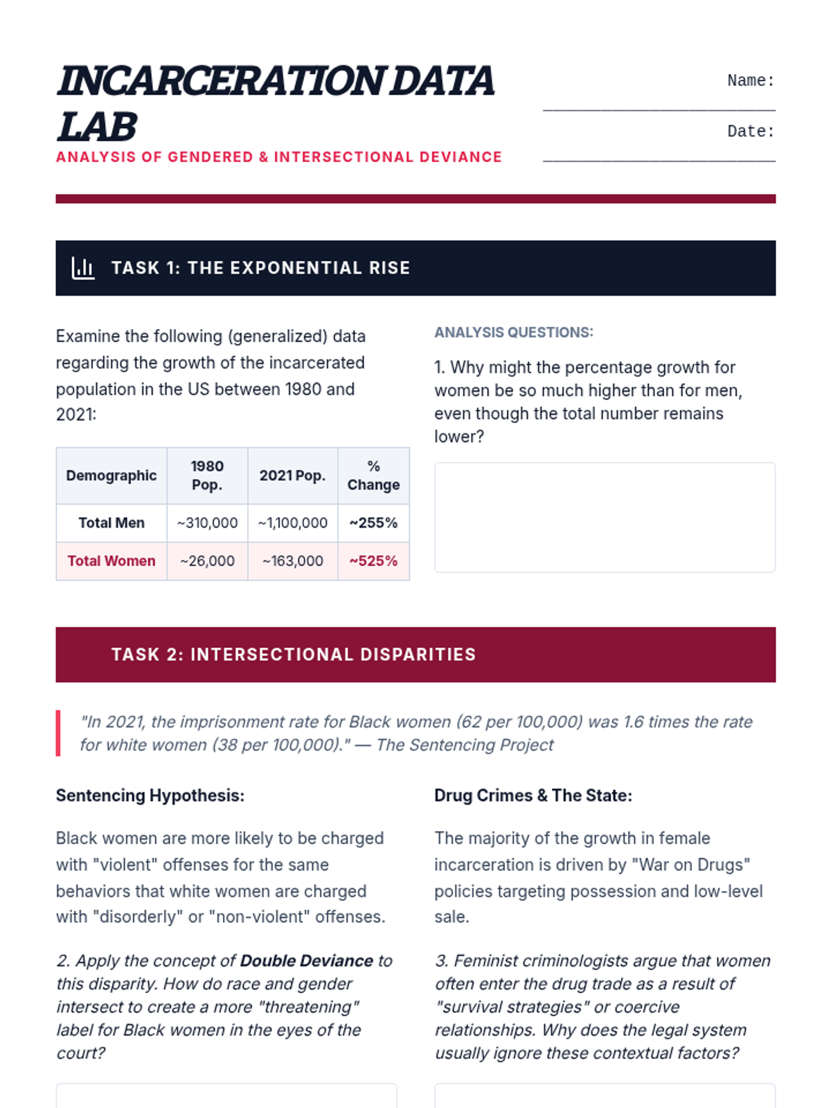 This lesson critiques traditional 'malestream' criminology, introducing feminist perspectives on victimology and the gendered nature of deviance. Students analyze statistical data regarding sentencing disparities and the 'double deviance' of women.