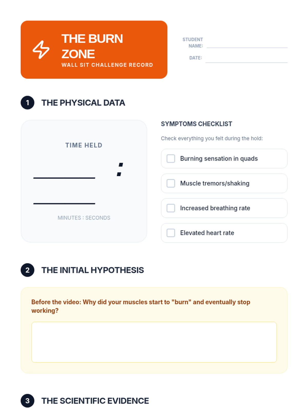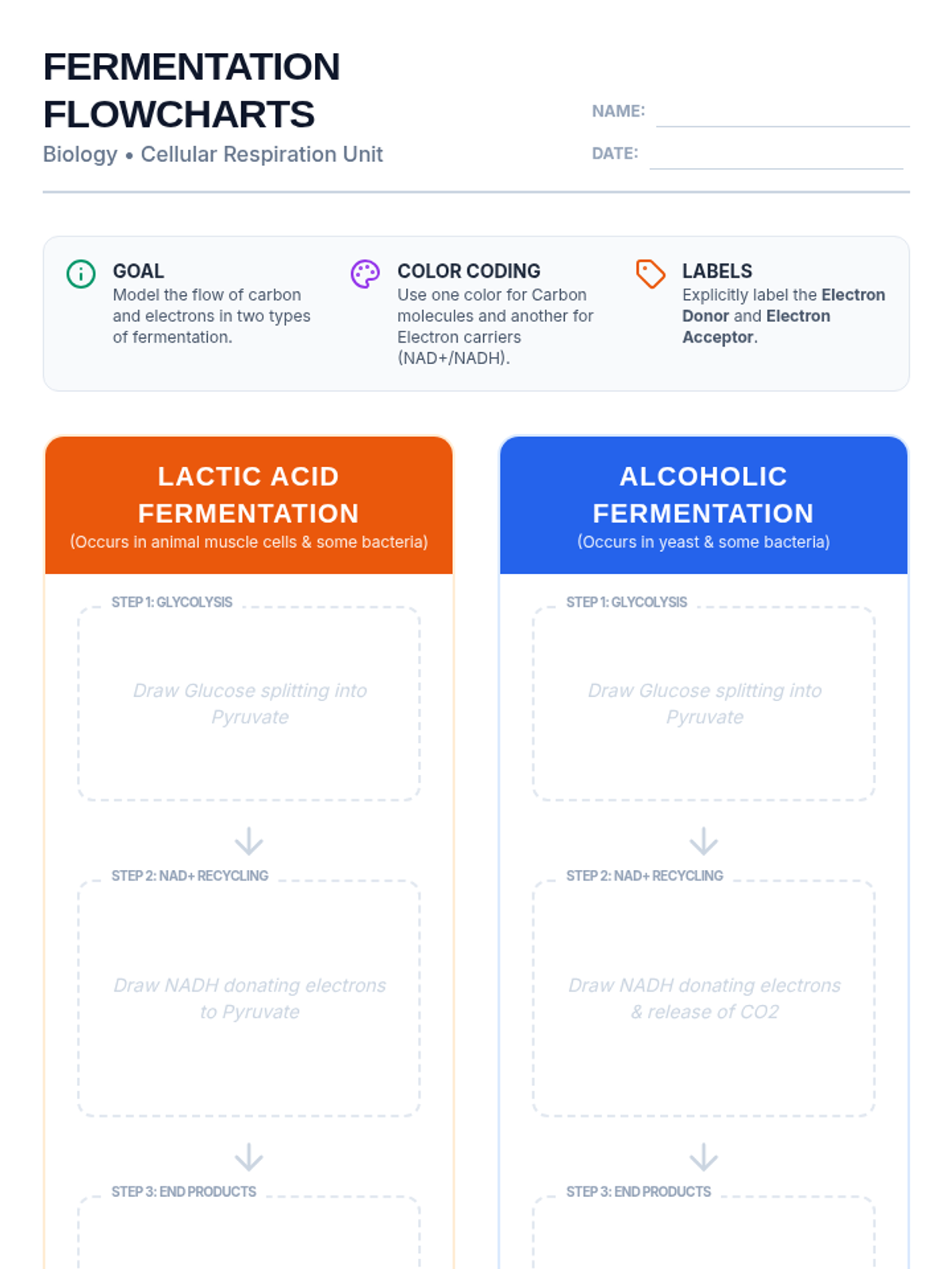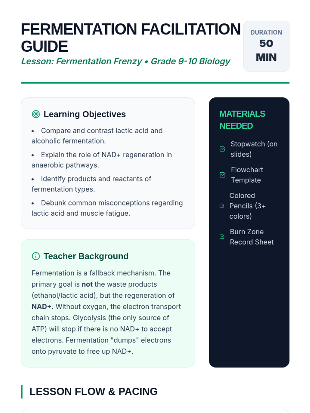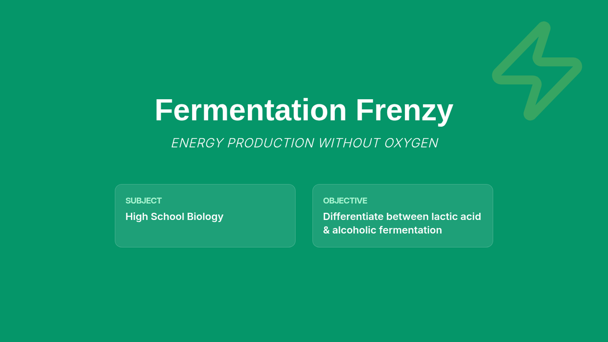 A high-energy lesson exploring how cells generate ATP without oxygen, featuring a physical wall-sit challenge, a video deep-dive, and detailed illustrated flowcharts of lactic acid and alcoholic fermentation.