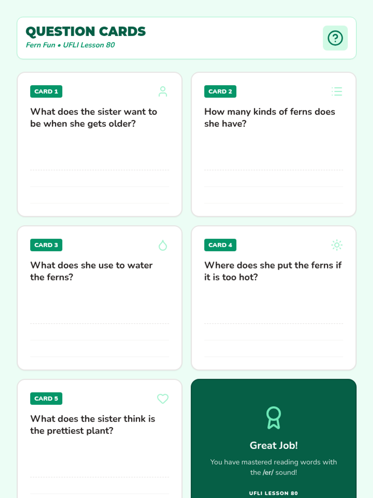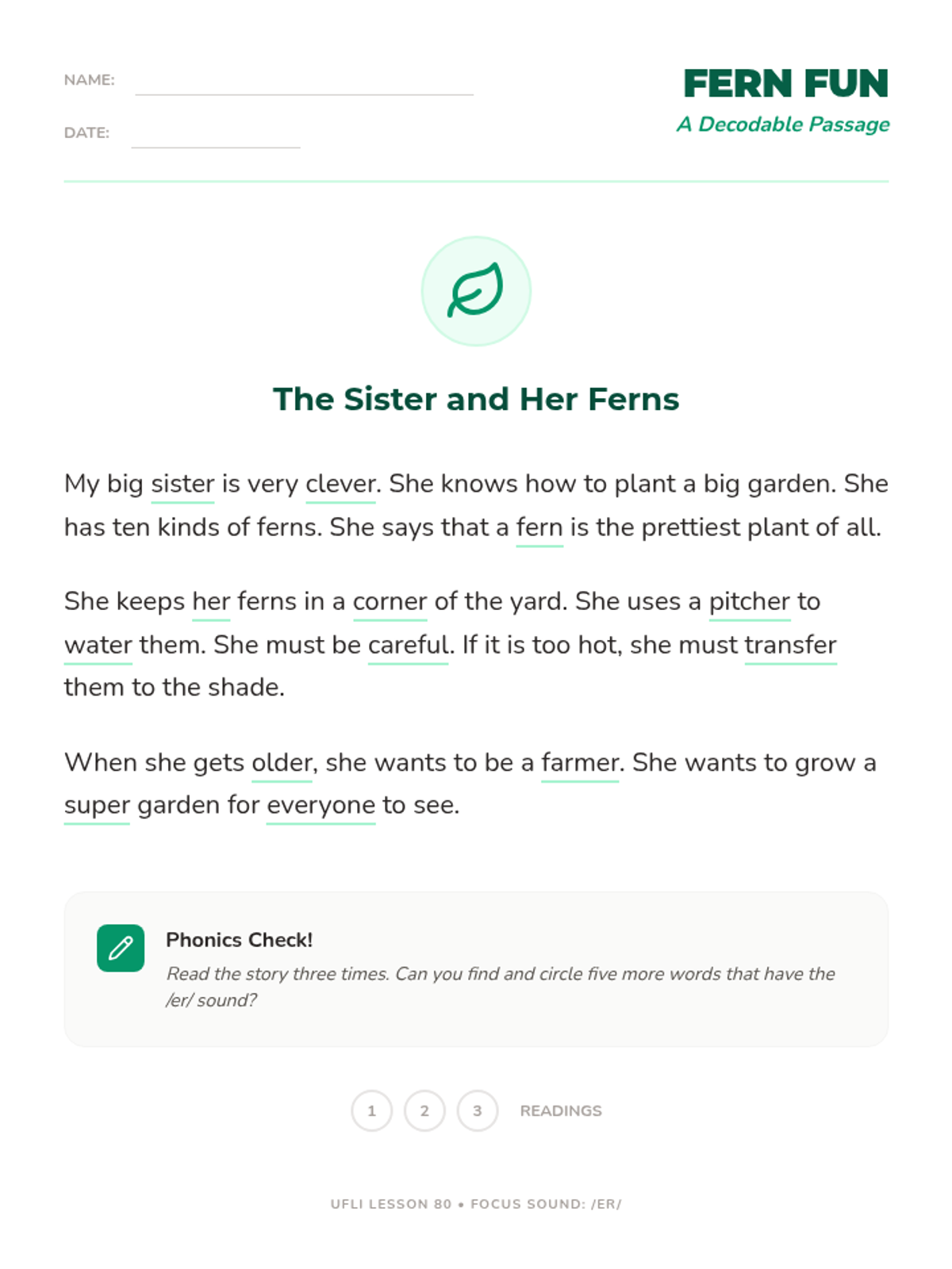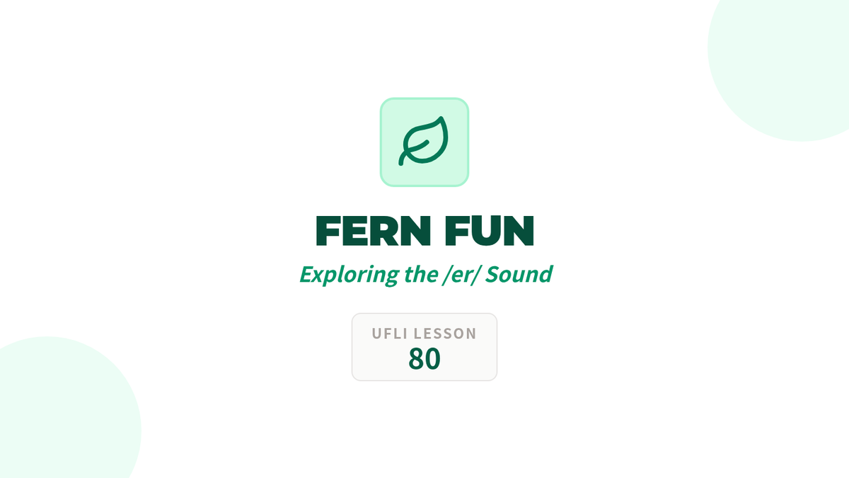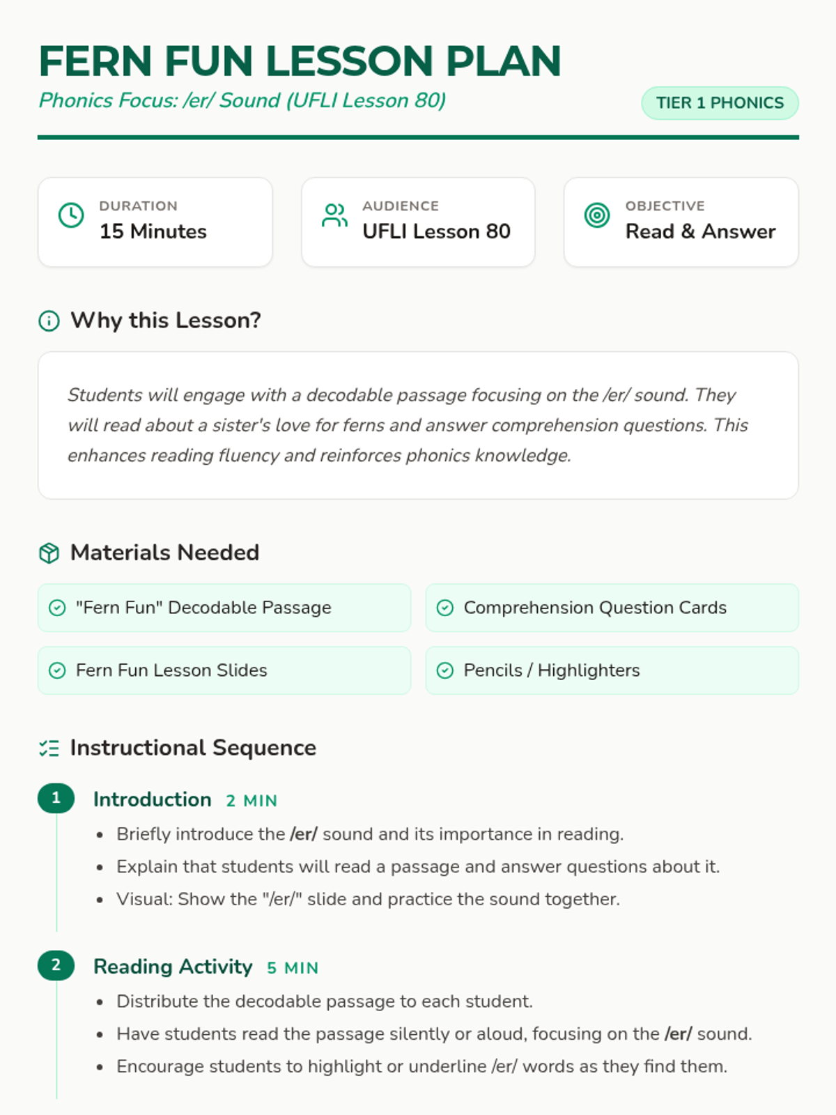 A phonics-focused lesson for UFLI Lesson 80, targeting the /er/ sound through a decodable passage about ferns and comprehension activities.