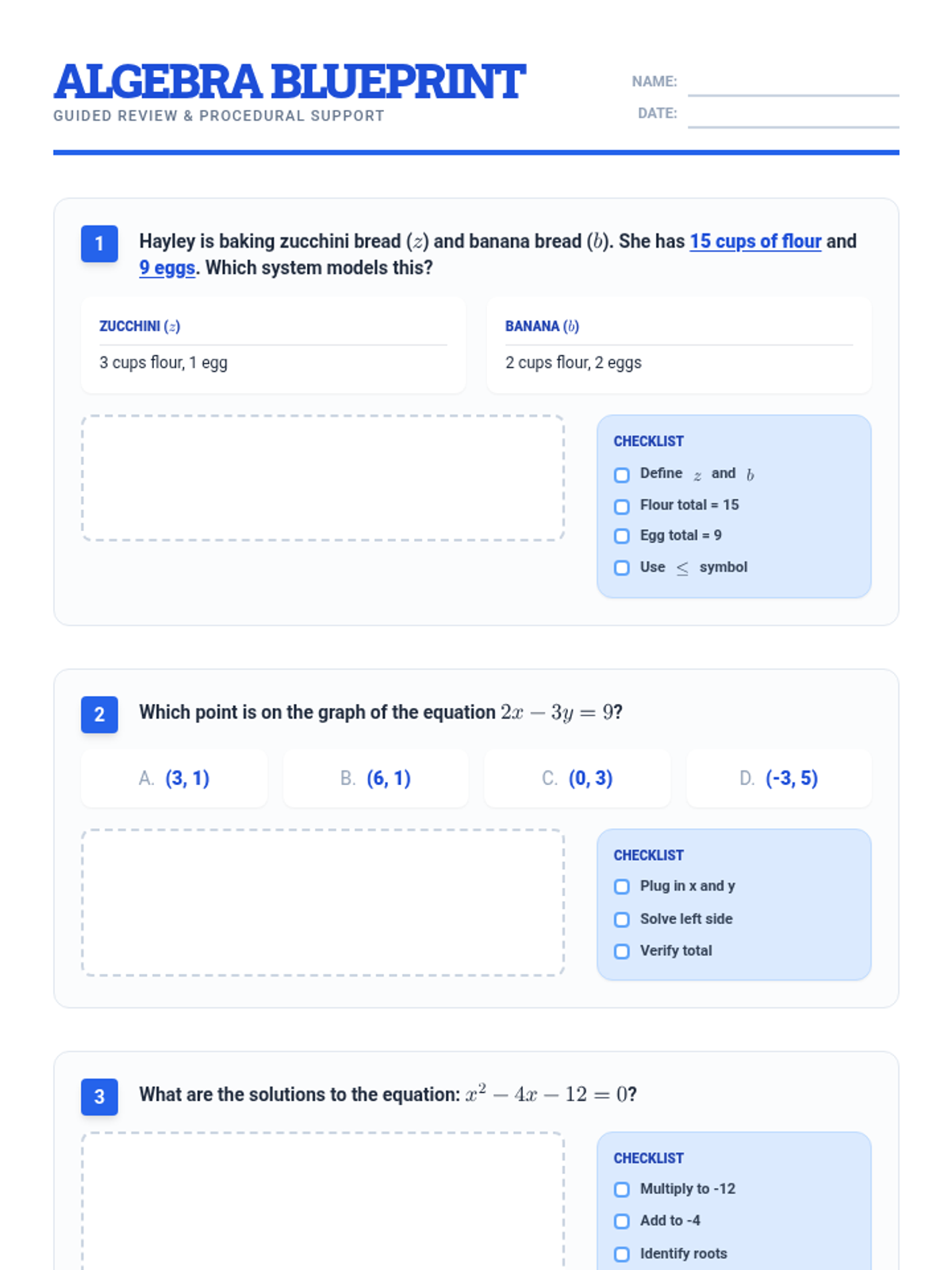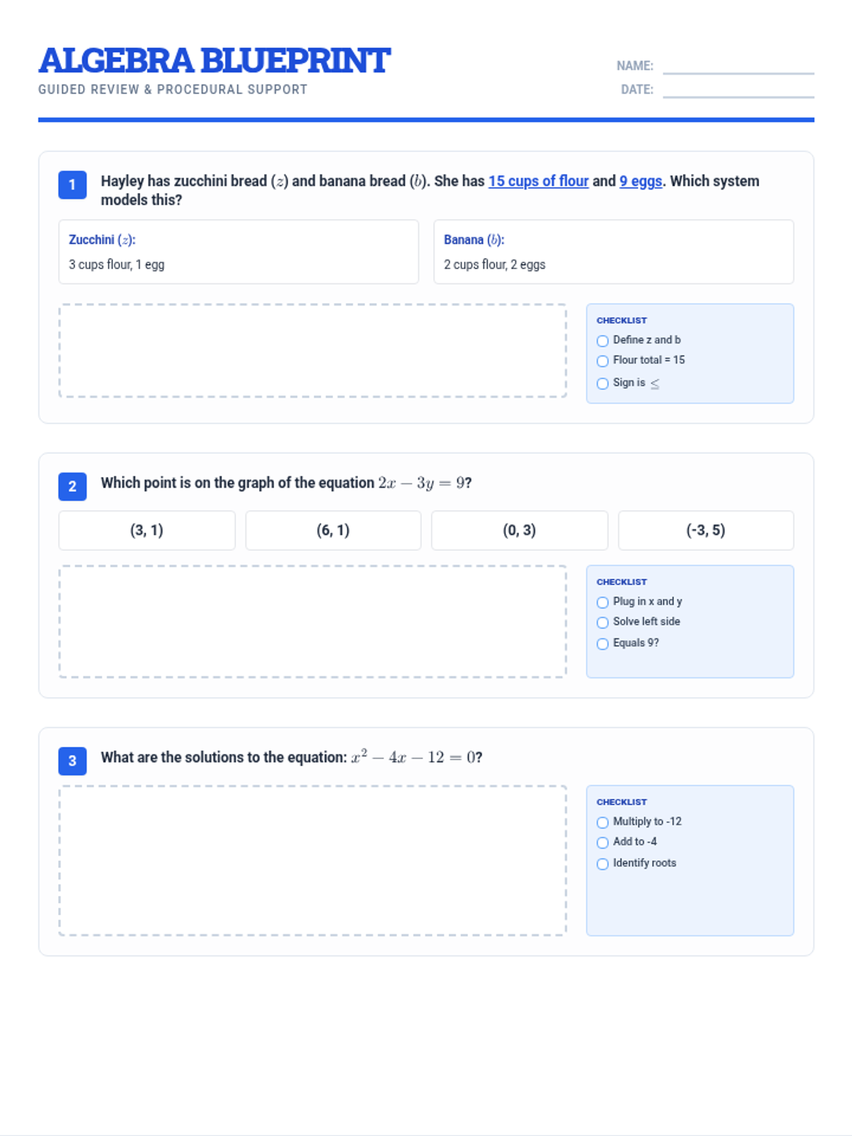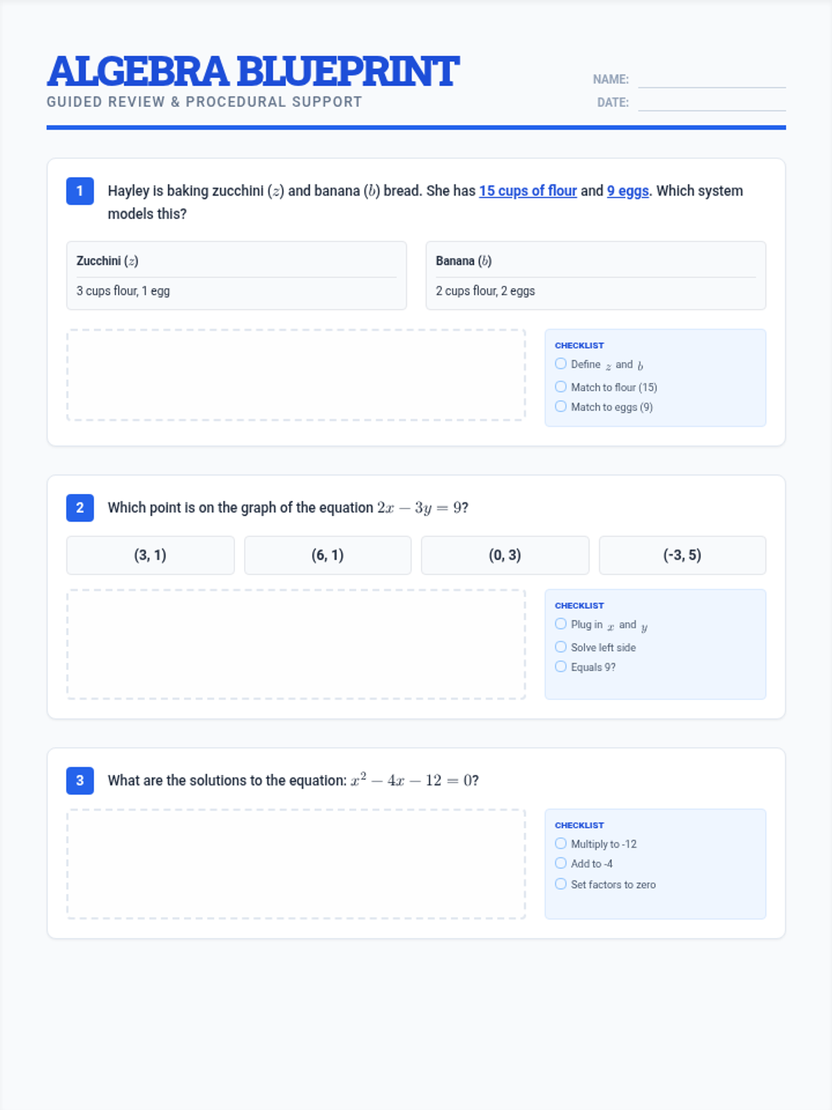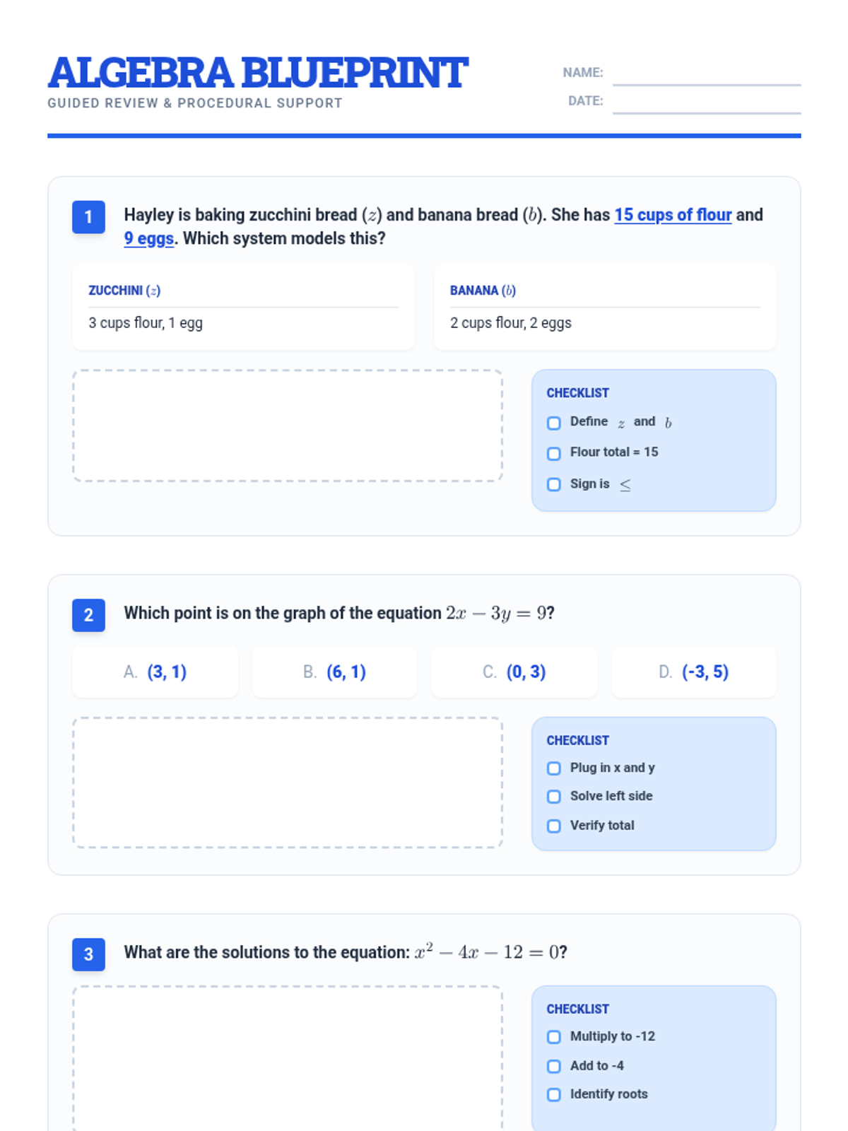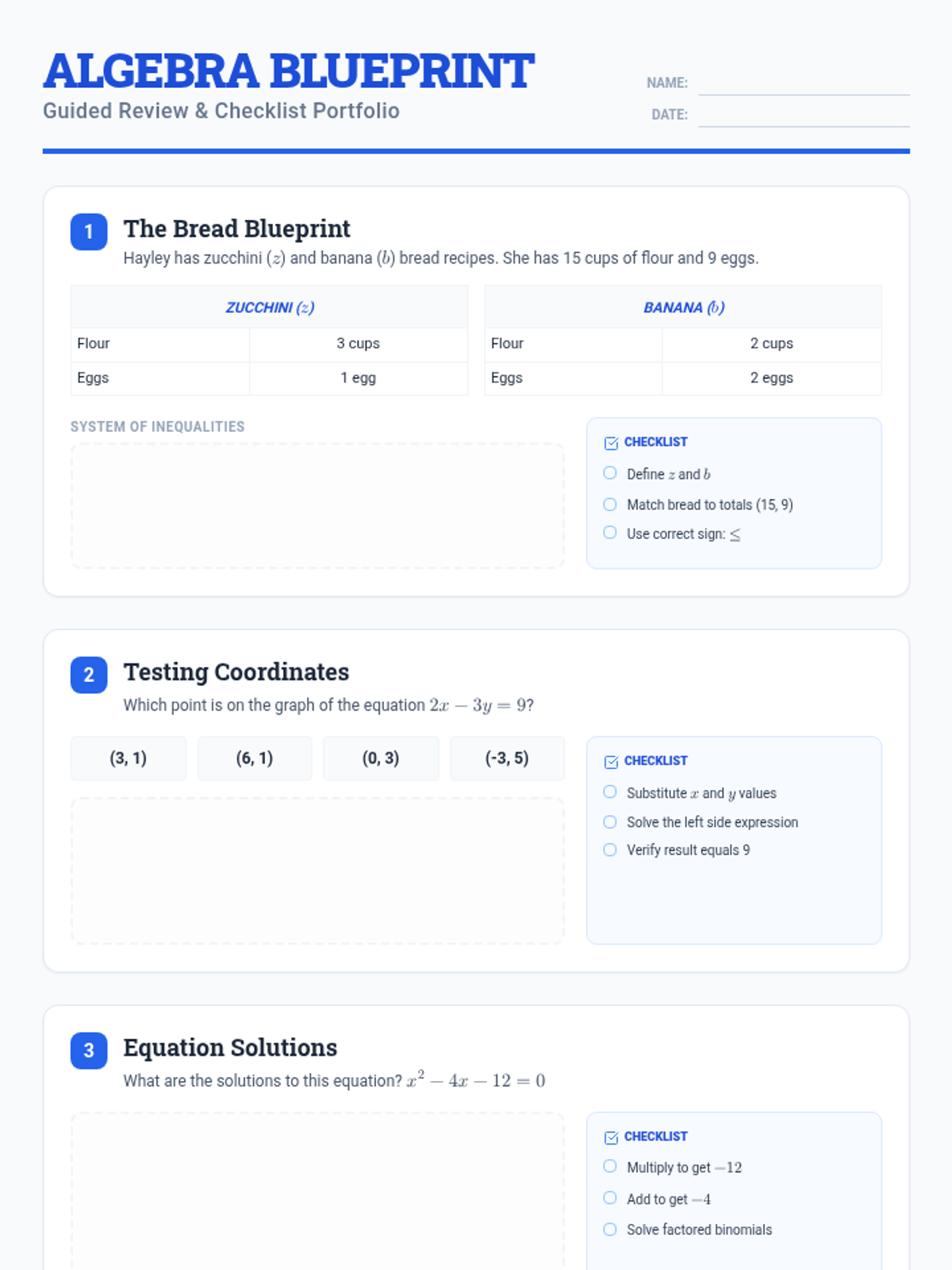 This lesson provides a guided review of core Algebra 1 concepts including systems of linear inequalities, transformations of functions, and quadratic equations. It features a step-by-step checklist approach to support students in breaking down complex multi-step problems.