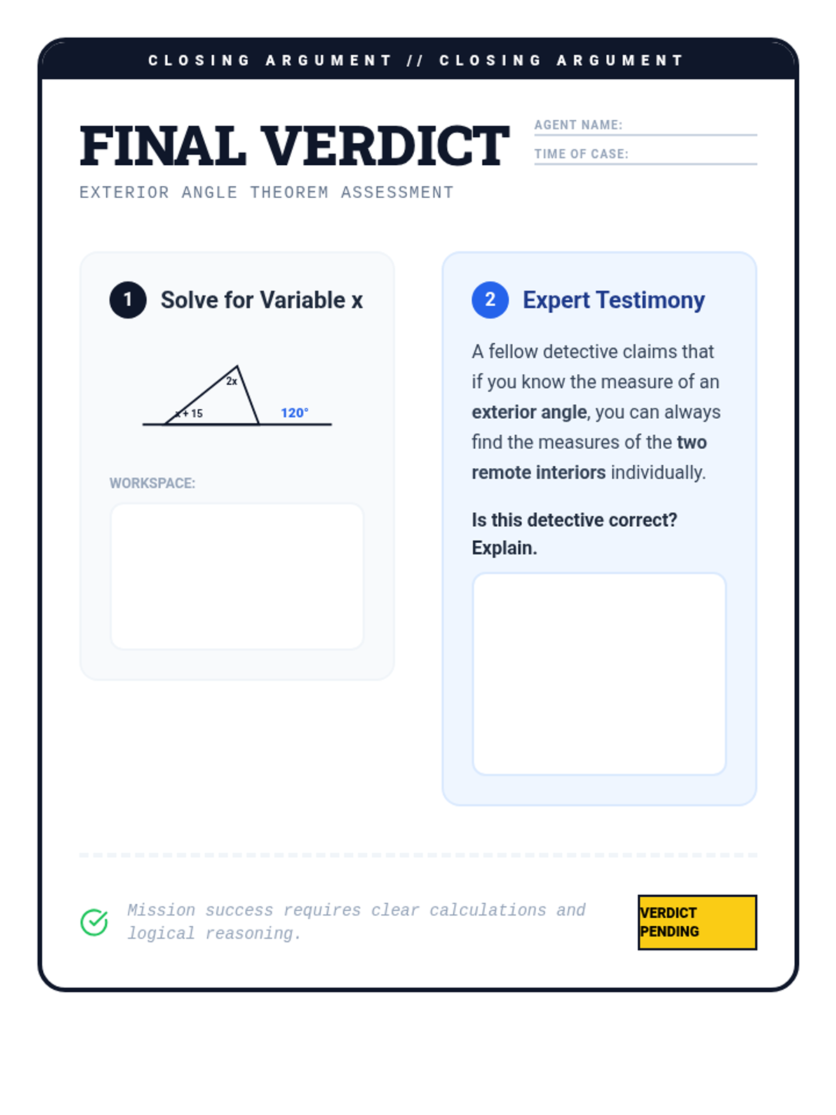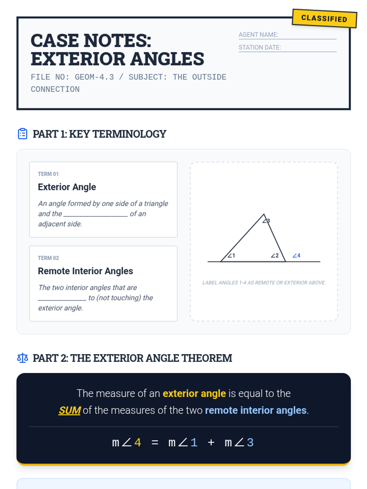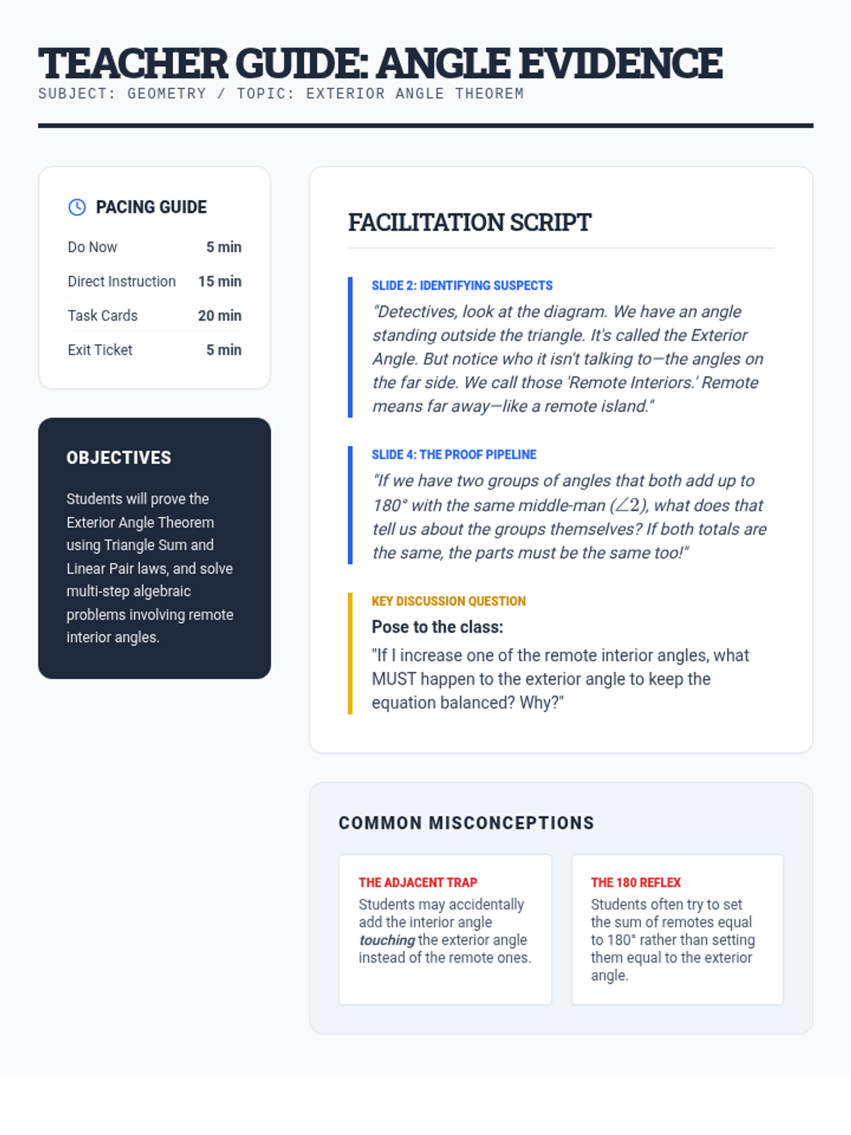 A comprehensive lesson package exploring the Exterior Angle Theorem through a 'detective case' lens. Students investigate the relationship between exterior and remote interior angles through proof and application.