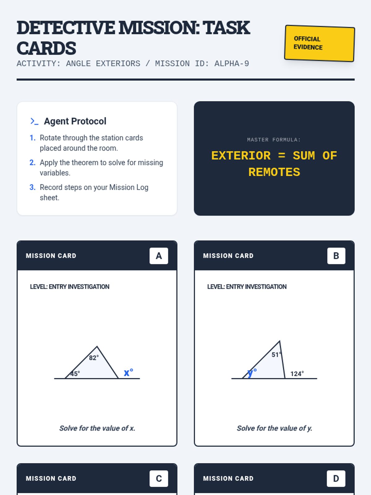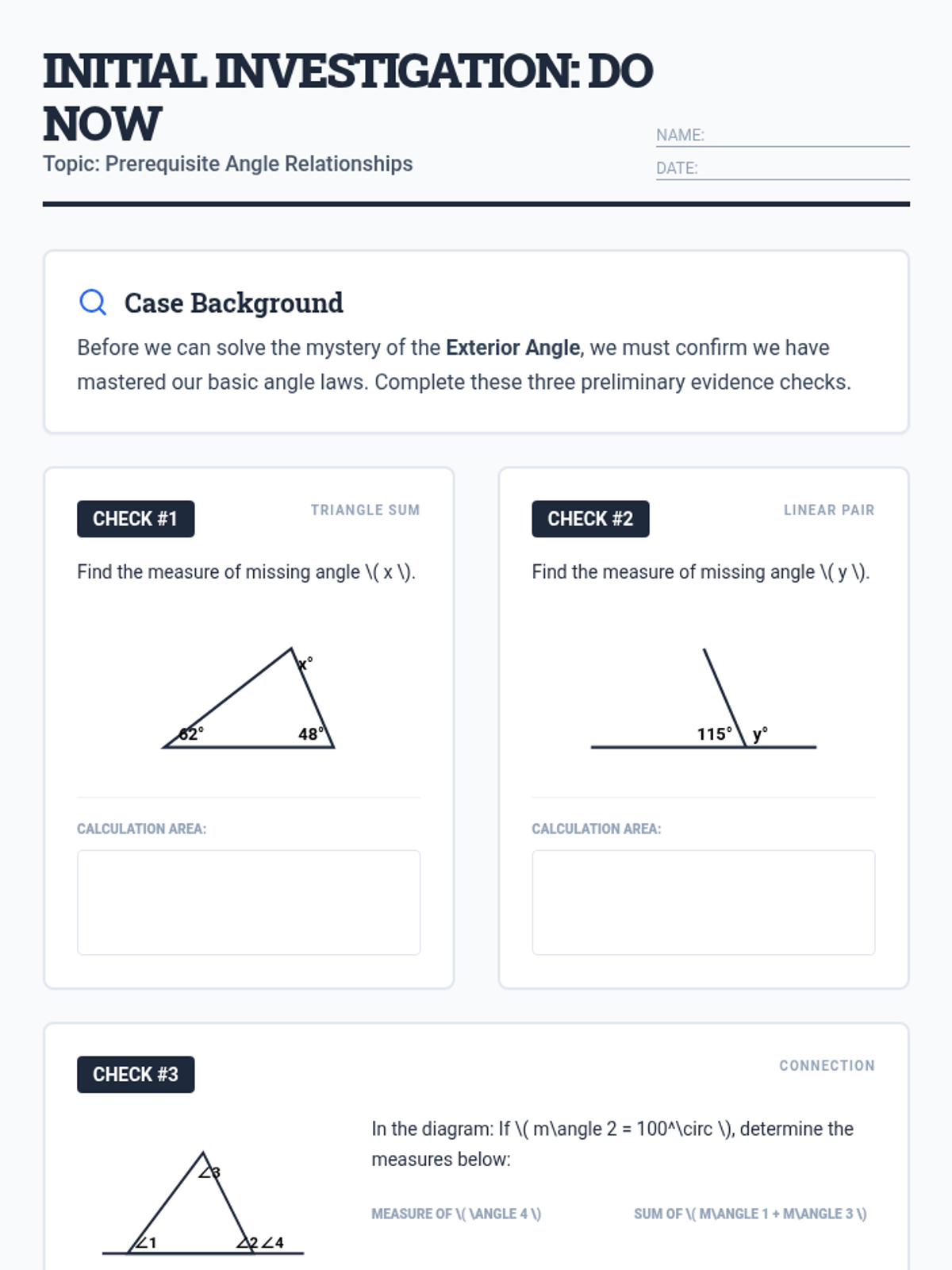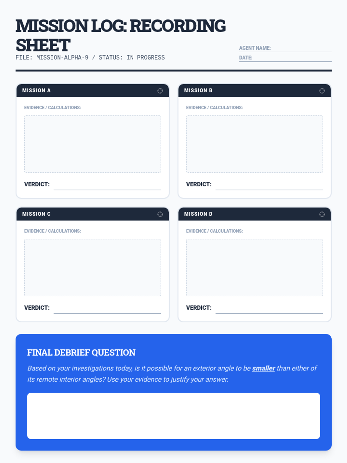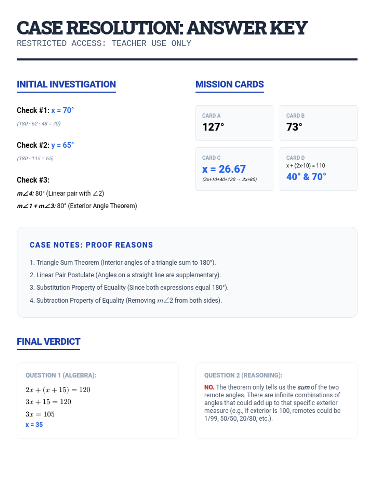 A comprehensive lesson package exploring the Exterior Angle Theorem through a 'detective case' lens. Students investigate the relationship between exterior and remote interior angles through proof and application.