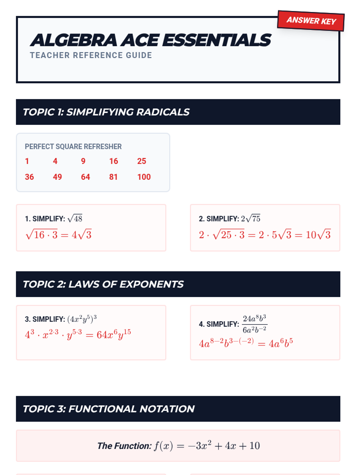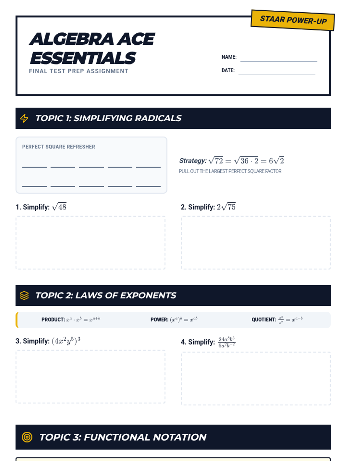 A comprehensive STAAR review lesson covering radicals, exponents, functions, and data modeling designed for high-impact Algebra 1 test prep.