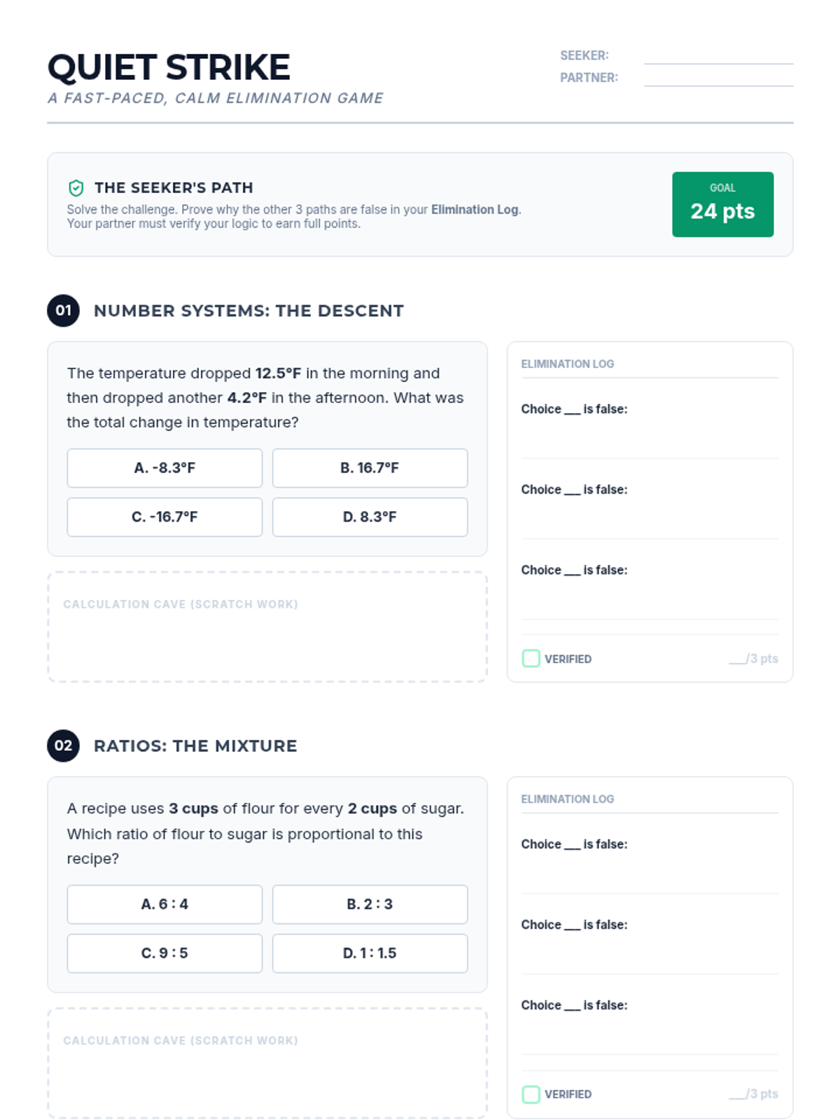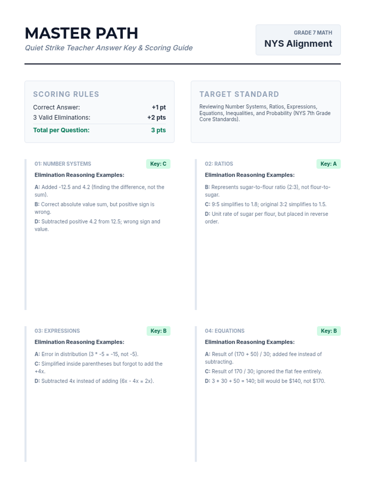 A fast-paced yet calm math elimination game focusing on 7th Grade NYS standards. Students solve multiple-choice questions, provide reasoning for eliminating wrong answers, and engage in partner verification for points.