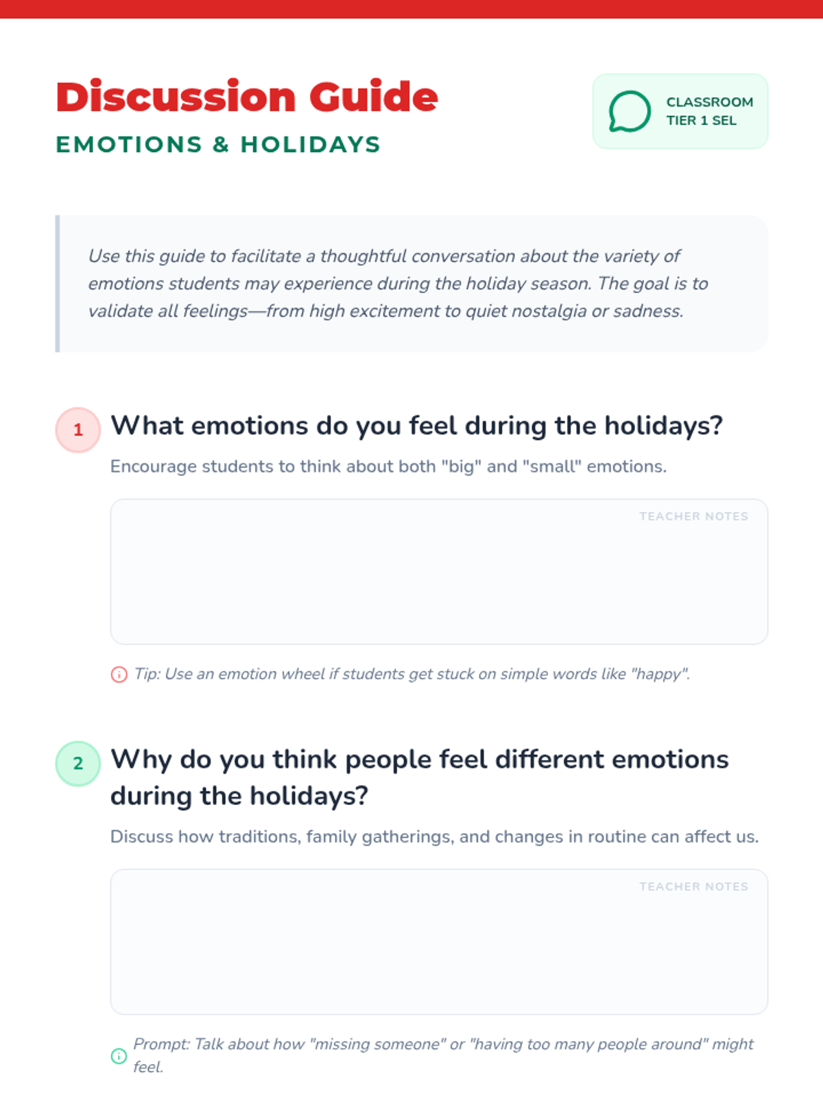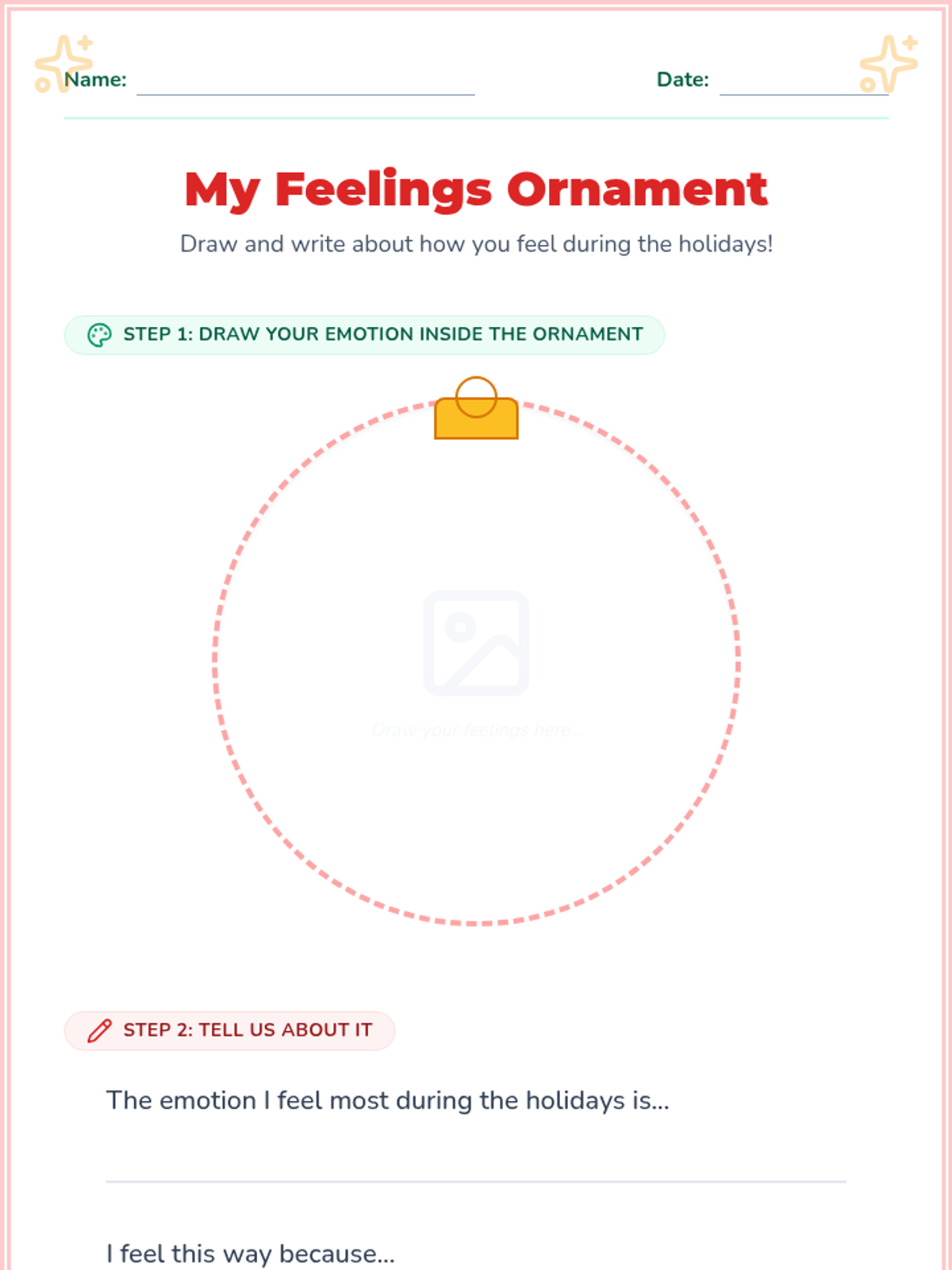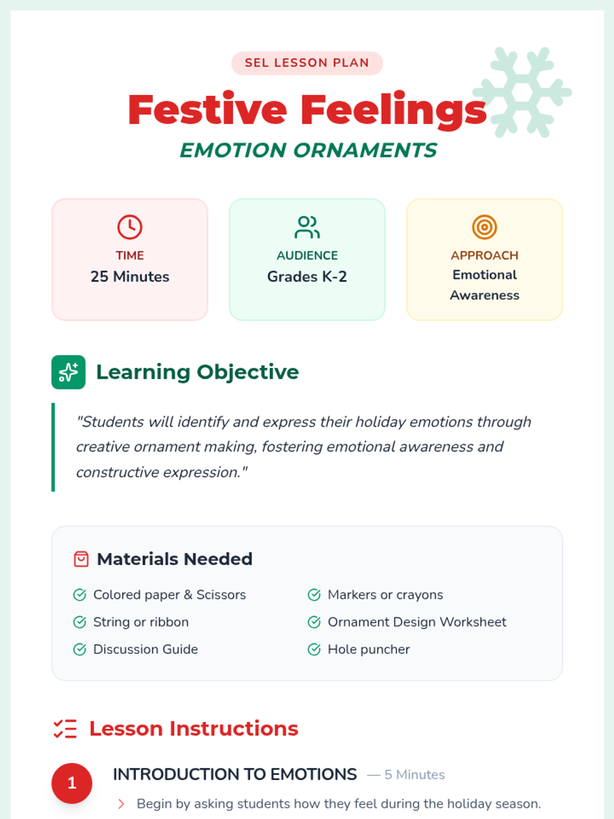 A festive SEL lesson for K-2 students to explore and express their holiday emotions through creative ornament making. Students identify feelings like excitement, joy, or nostalgia and translate them into visual art.