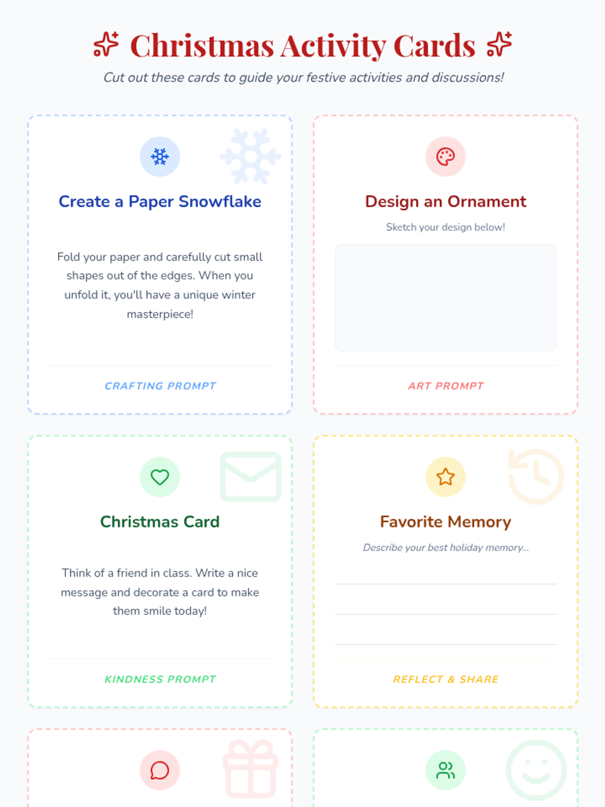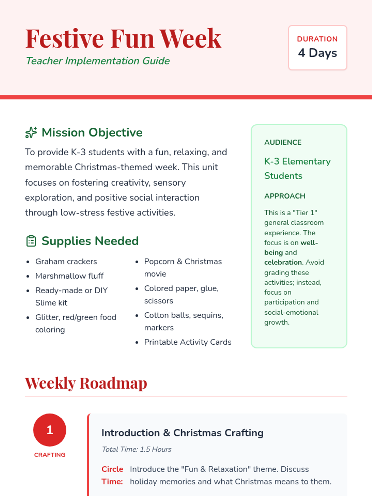 A 4-day series of festive activities including crafting, sensory slime-making, tasty treat construction, and a cozy movie day.