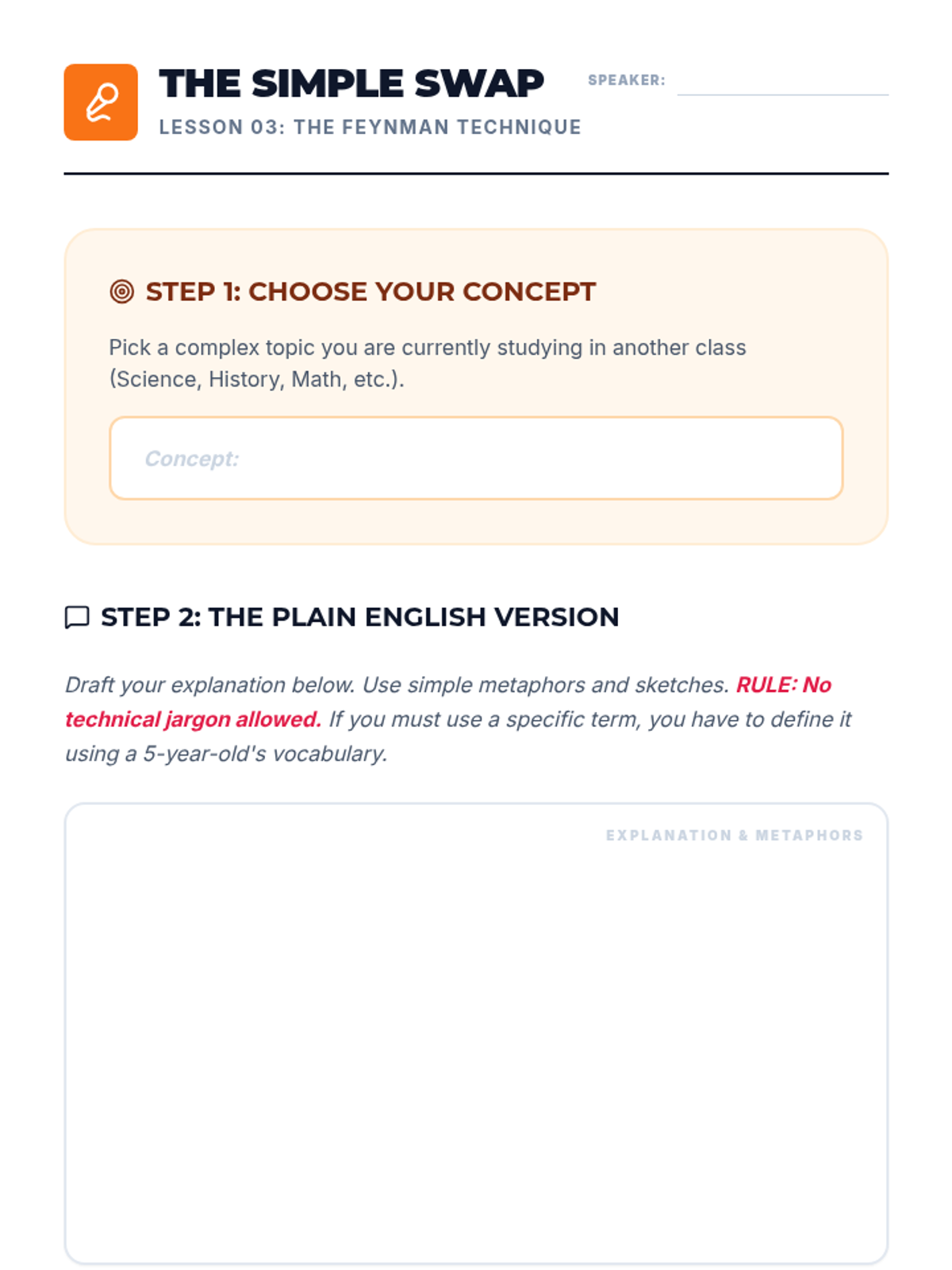 Students practice the Feynman Technique: teaching complex concepts in simple terms to identify and bridge knowledge gaps.