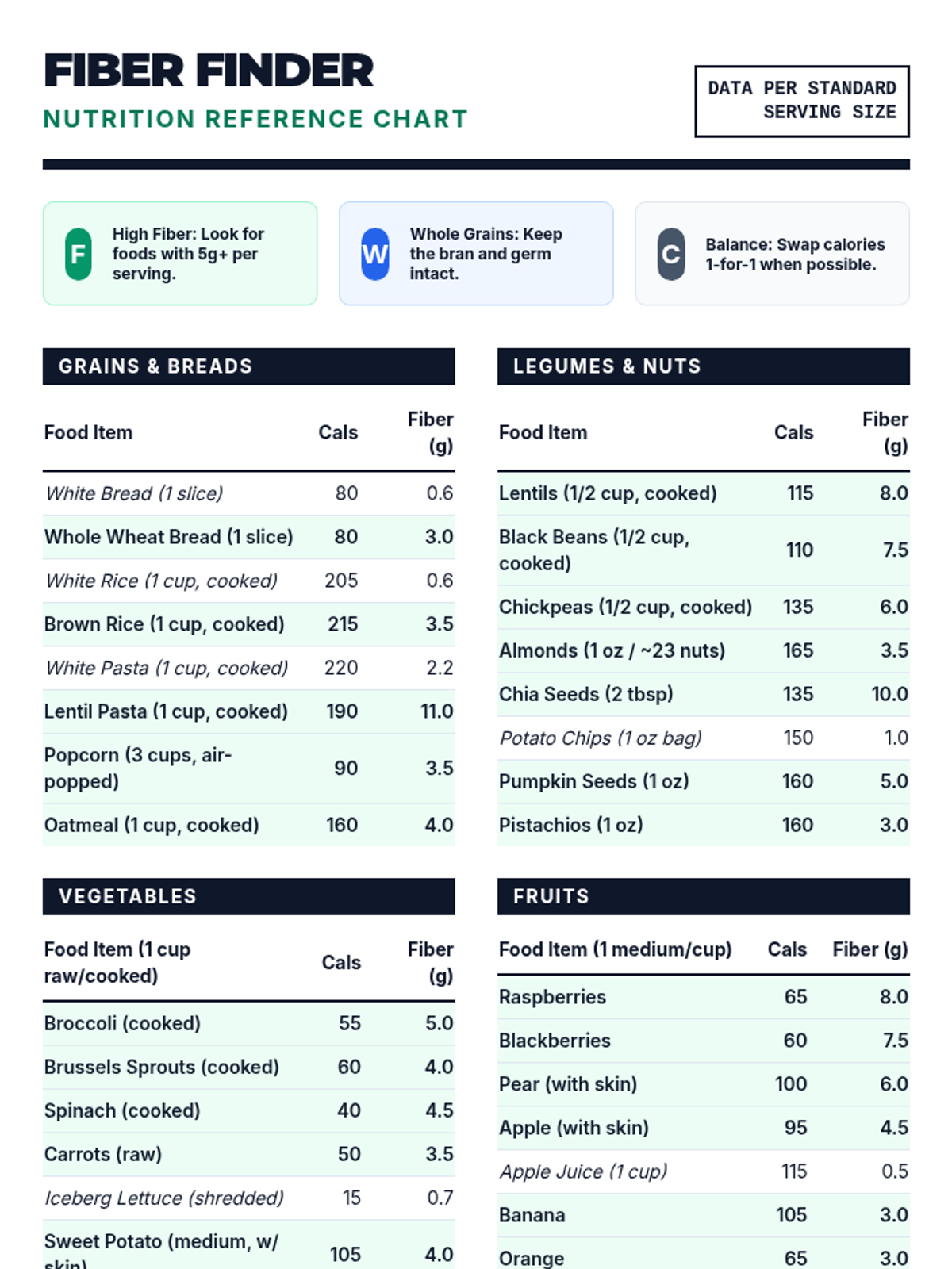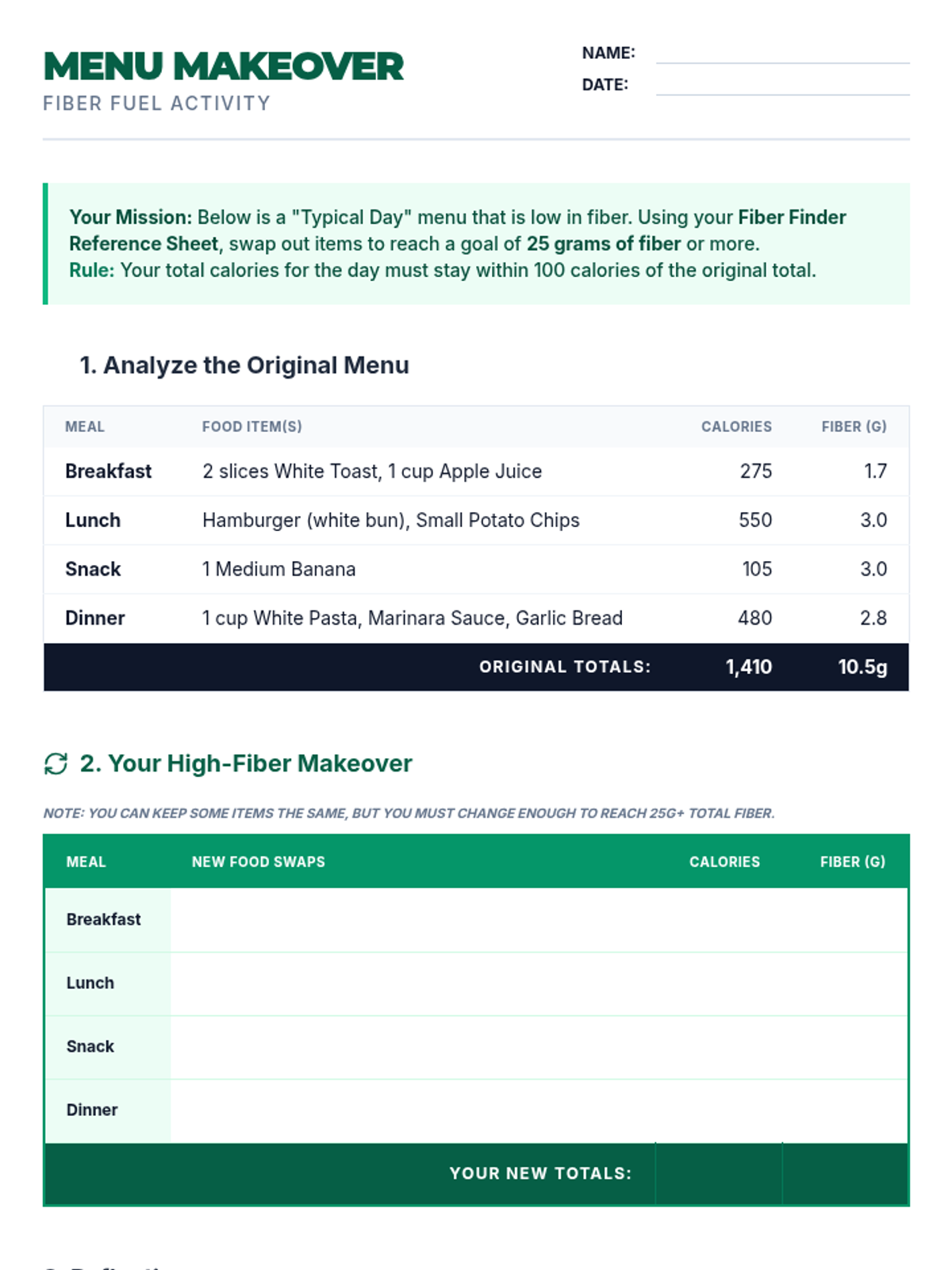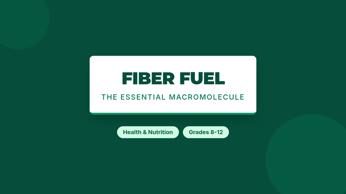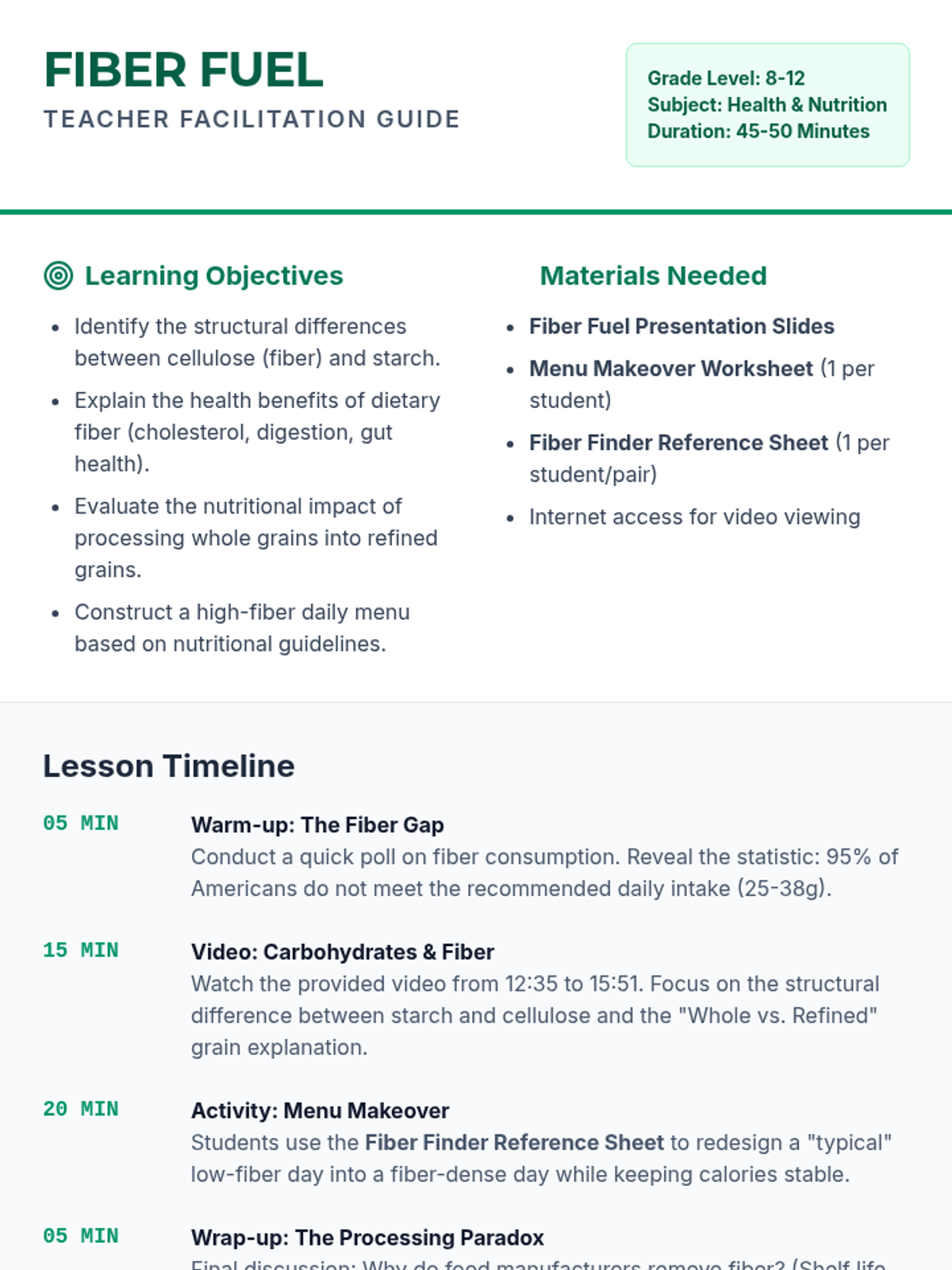 A comprehensive lesson focusing on the biological and nutritional importance of fiber, the difference between whole and refined grains, and practical application of fiber-rich eating.