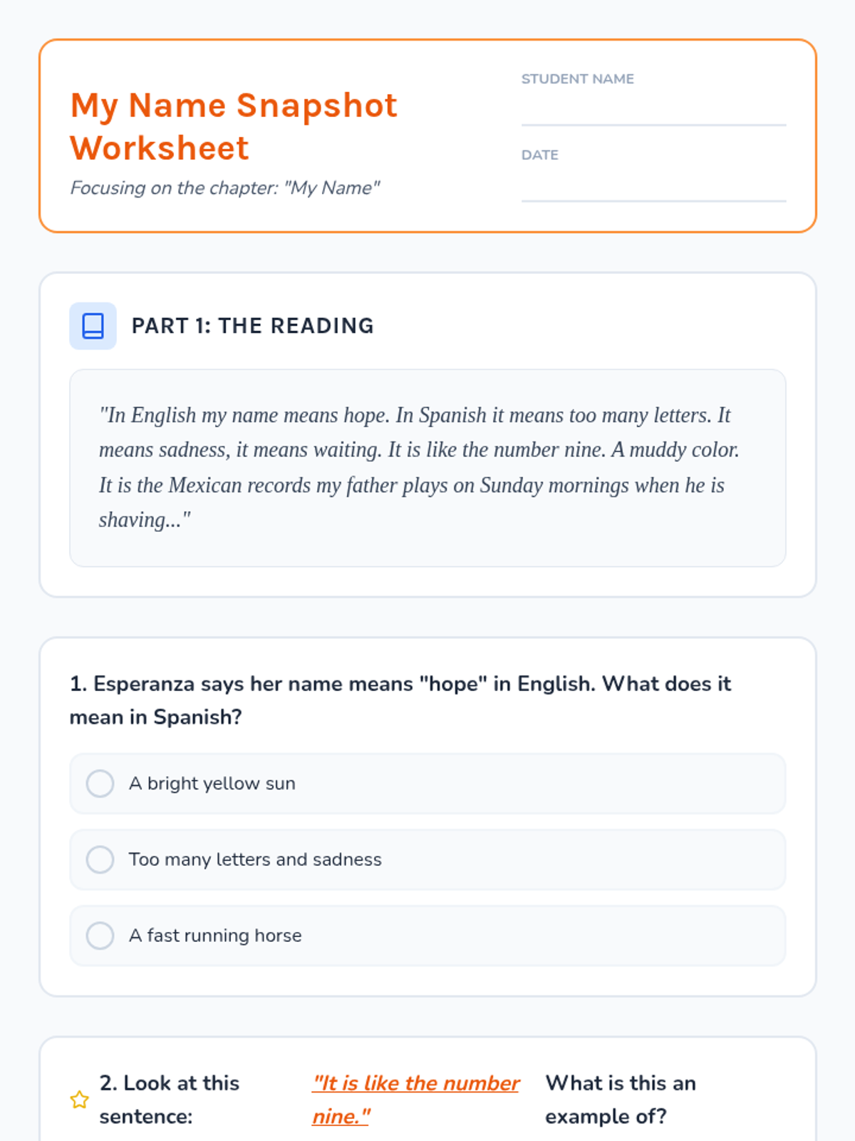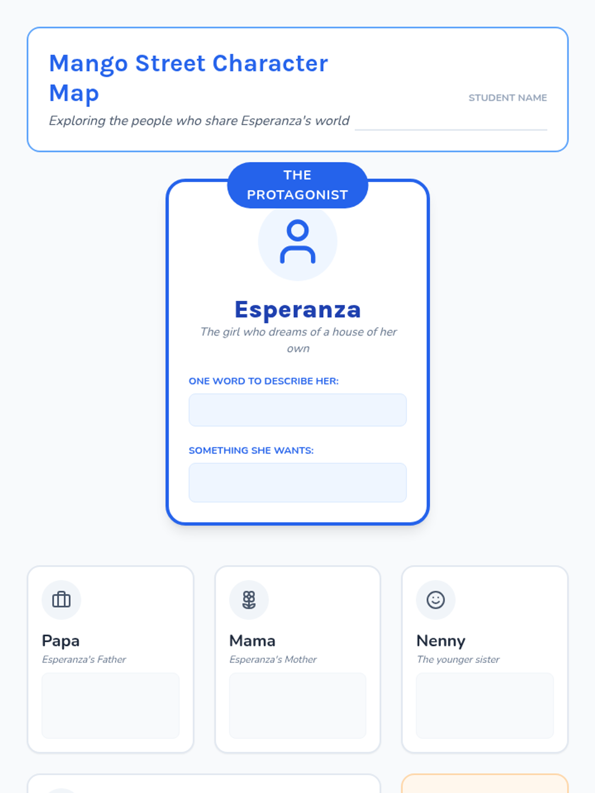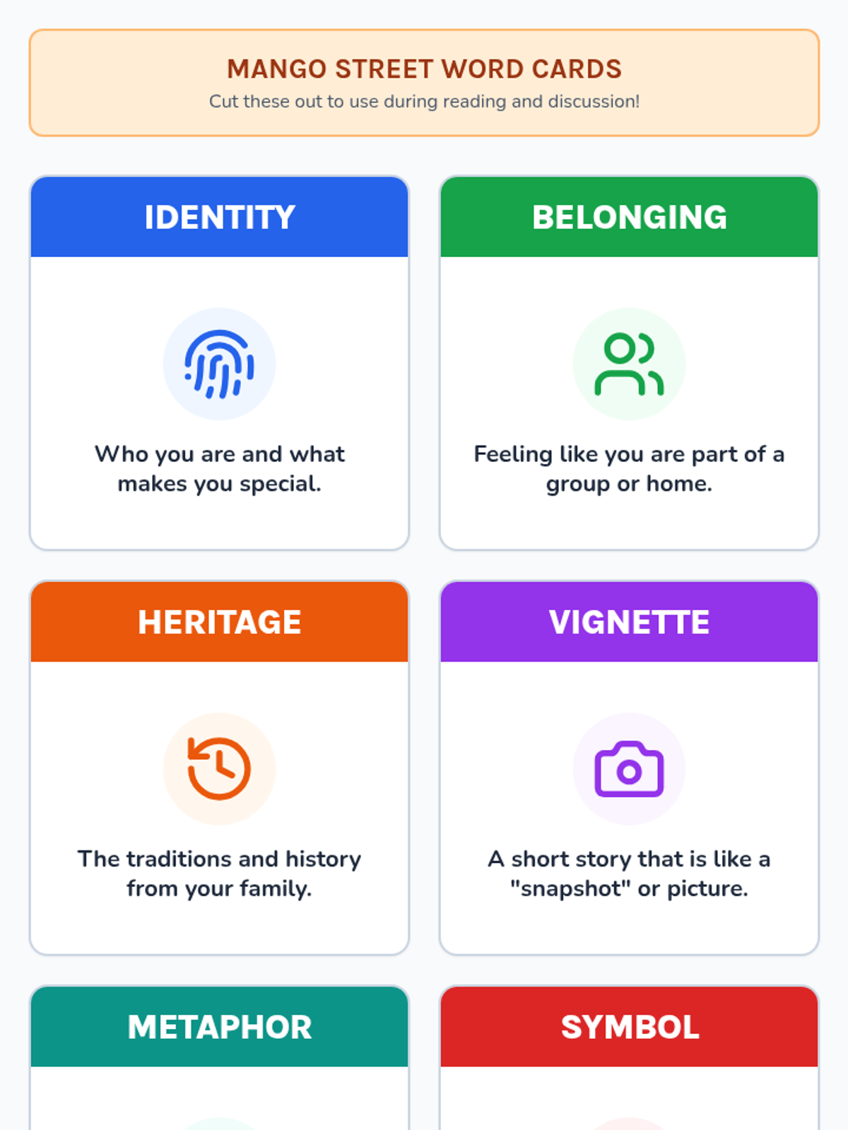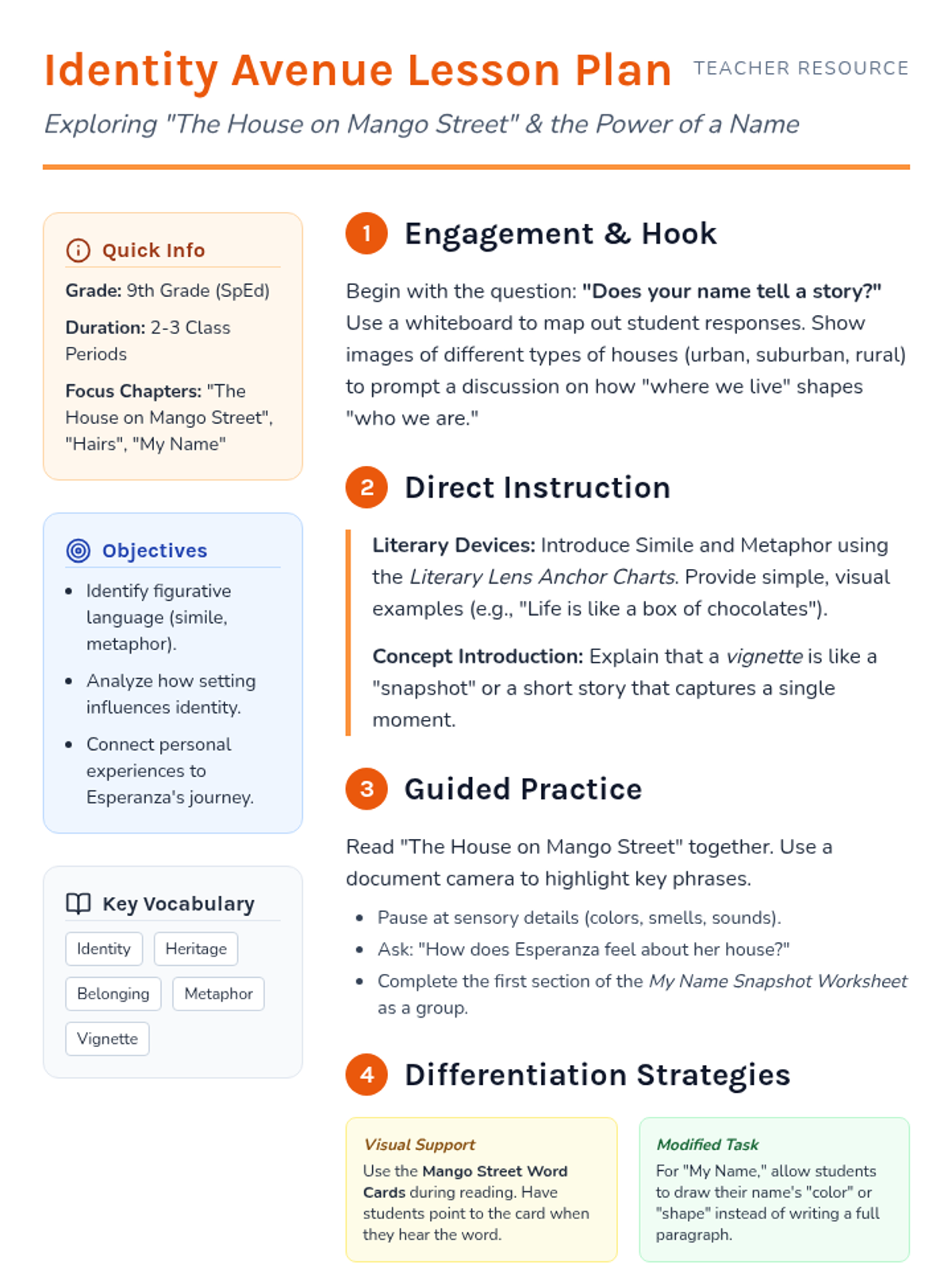 A comprehensive lesson focusing on the themes of identity and belonging in 'The House on Mango Street' through simplified text, visual supports, and character analysis.