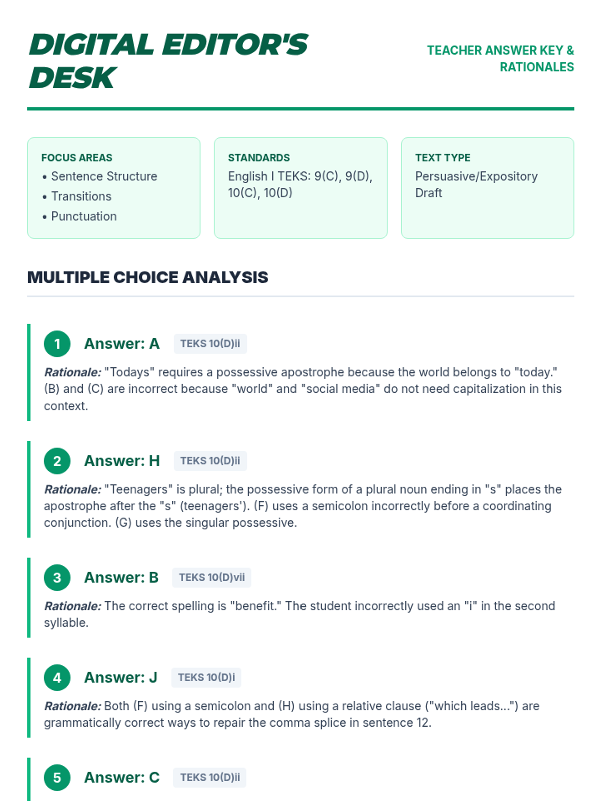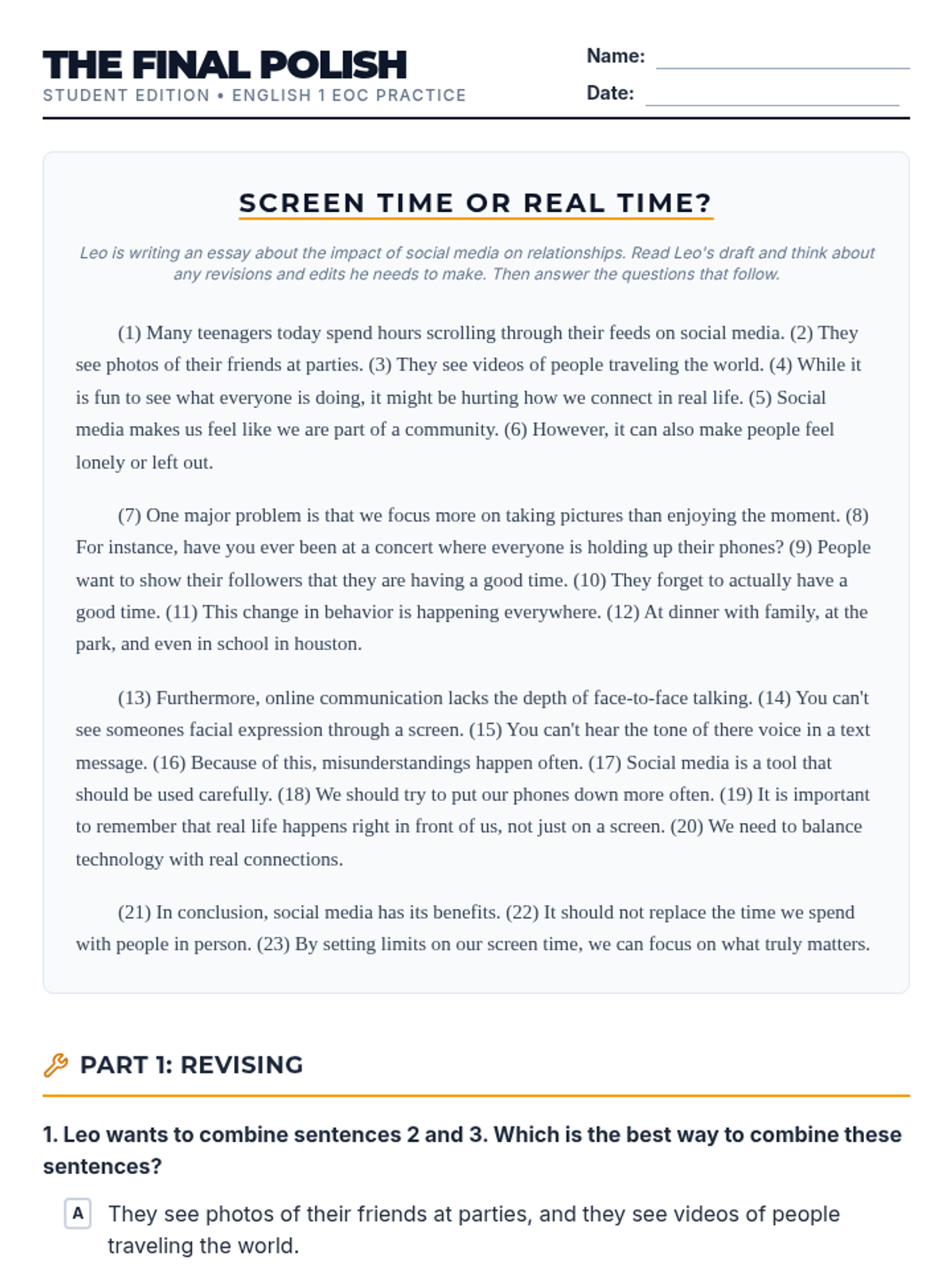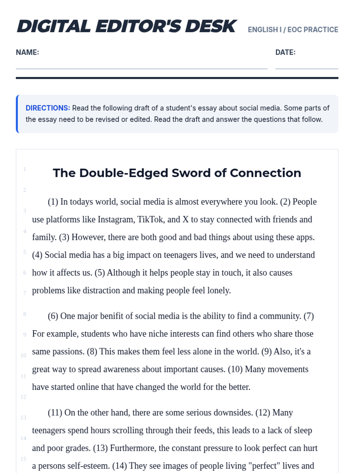 A focused practice session for English 1 students to hone their revising and editing skills using a student essay about social media, aligned with Texas EOC standards.