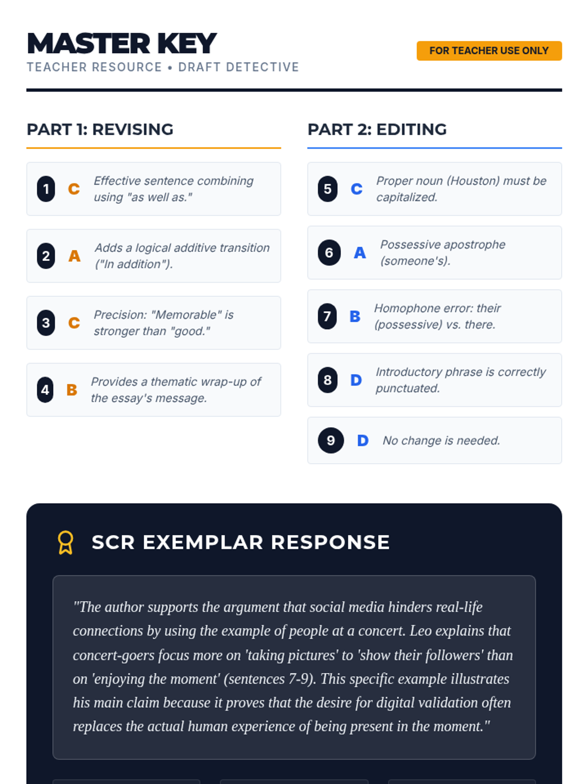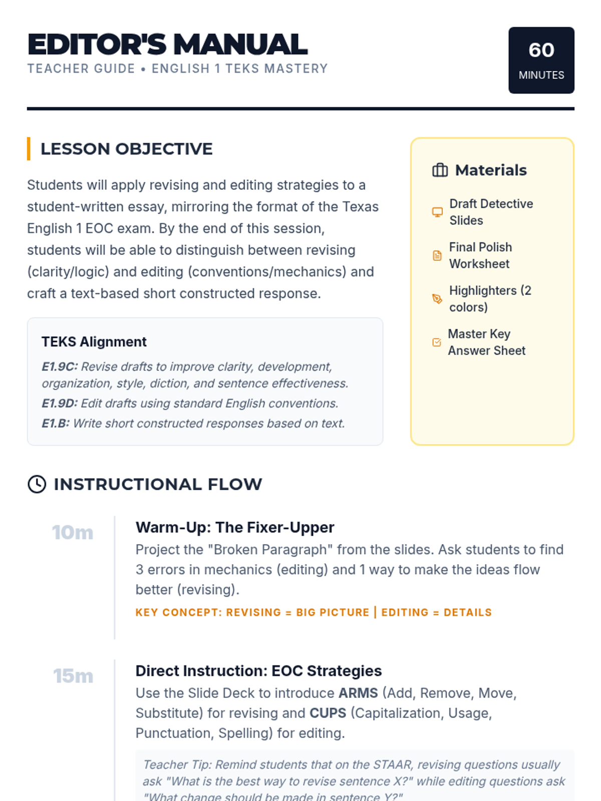 A 60-minute intensive lesson focused on mastering the revising and editing skills required for the English 1 Texas EOC exam. Students analyze a peer essay to identify and correct errors in logic, flow, and conventions.