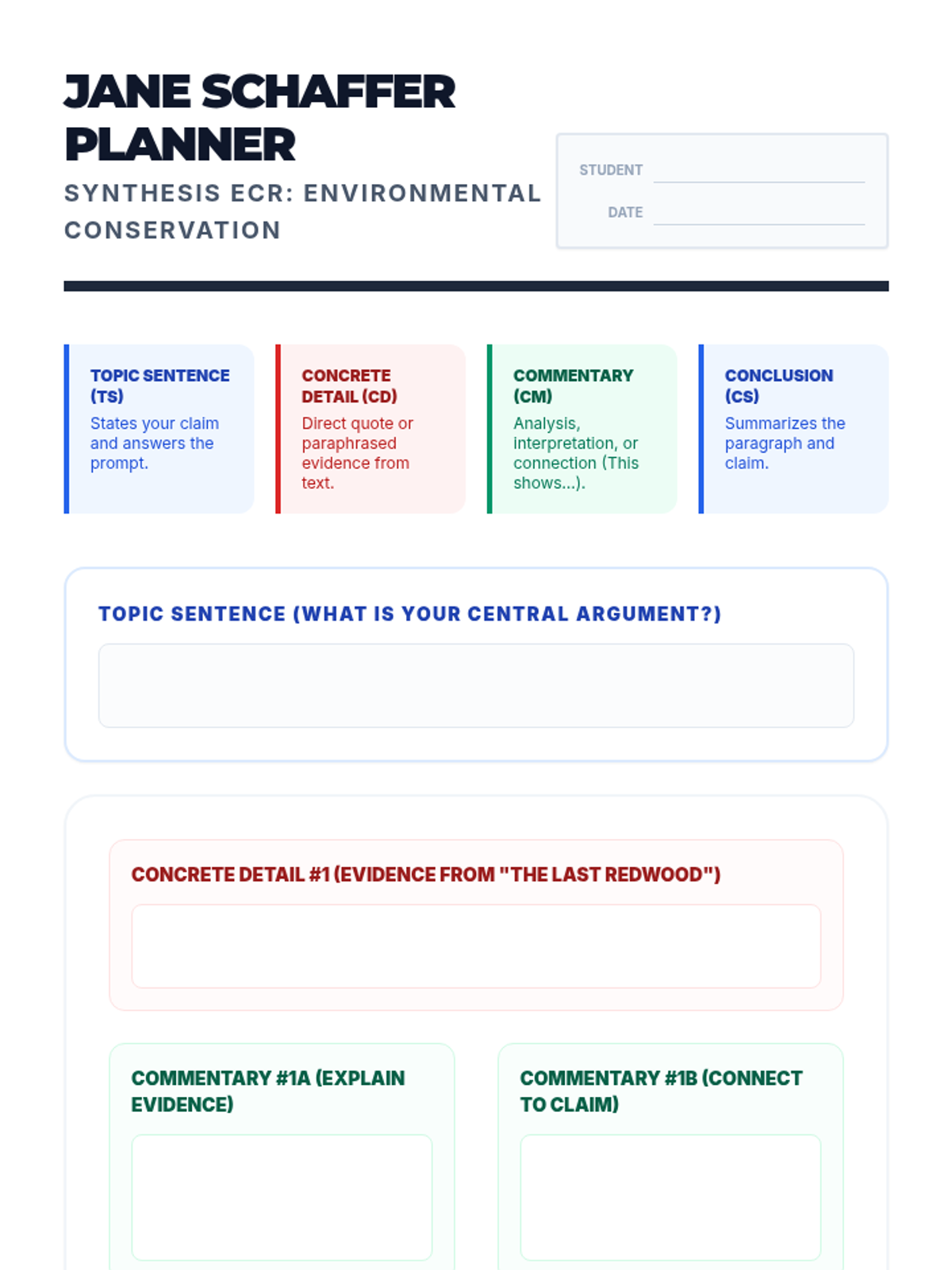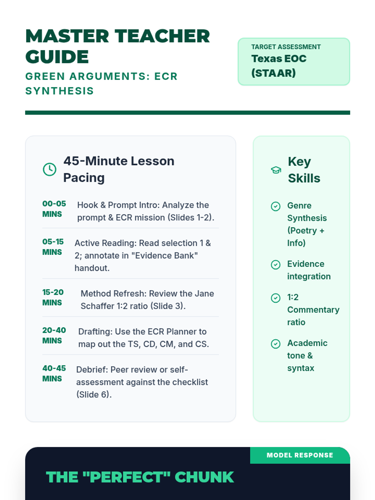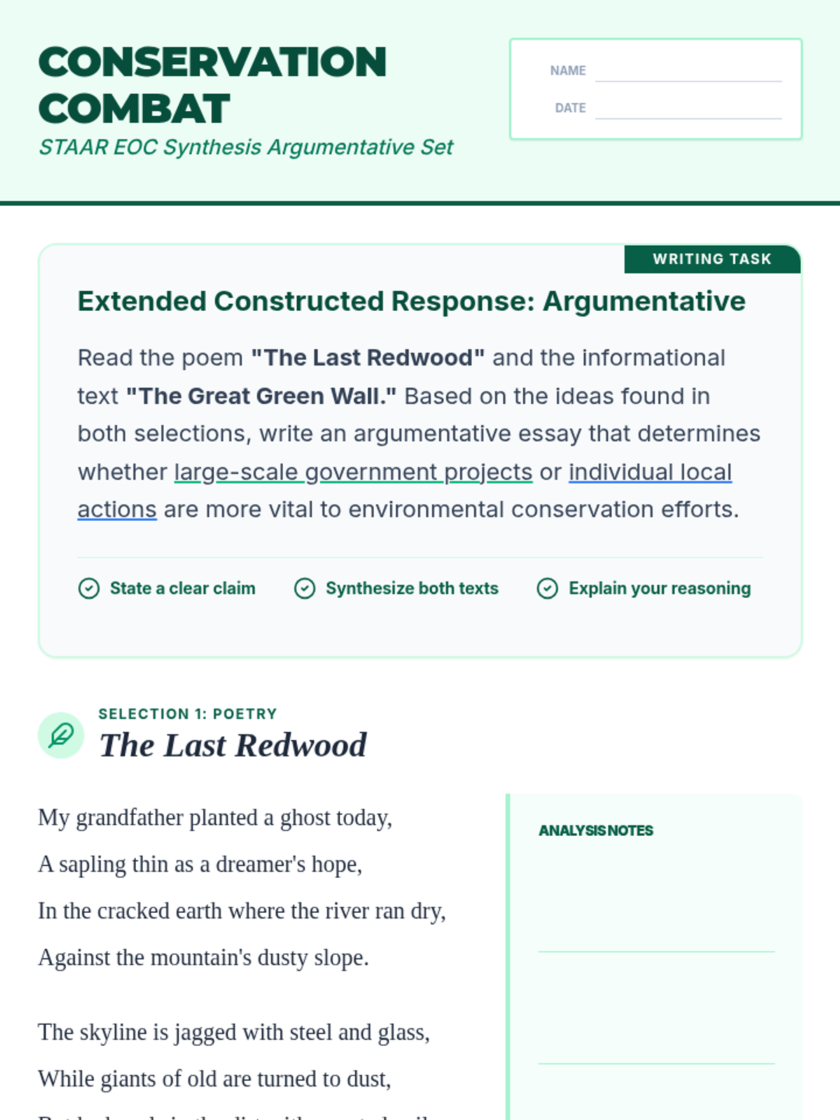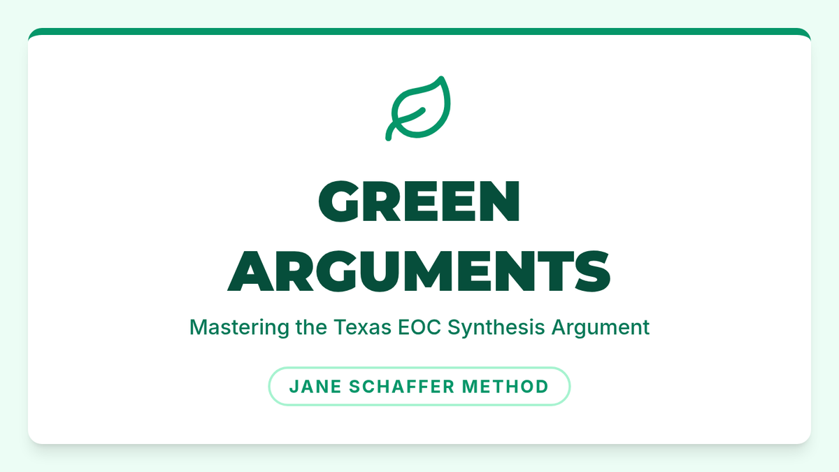 A high-school lesson focused on synthesizing multiple texts to craft a Jane Schaffer-style argumentative response for the Texas EOC. Students analyze environmental conservation efforts through poetry and informational text.