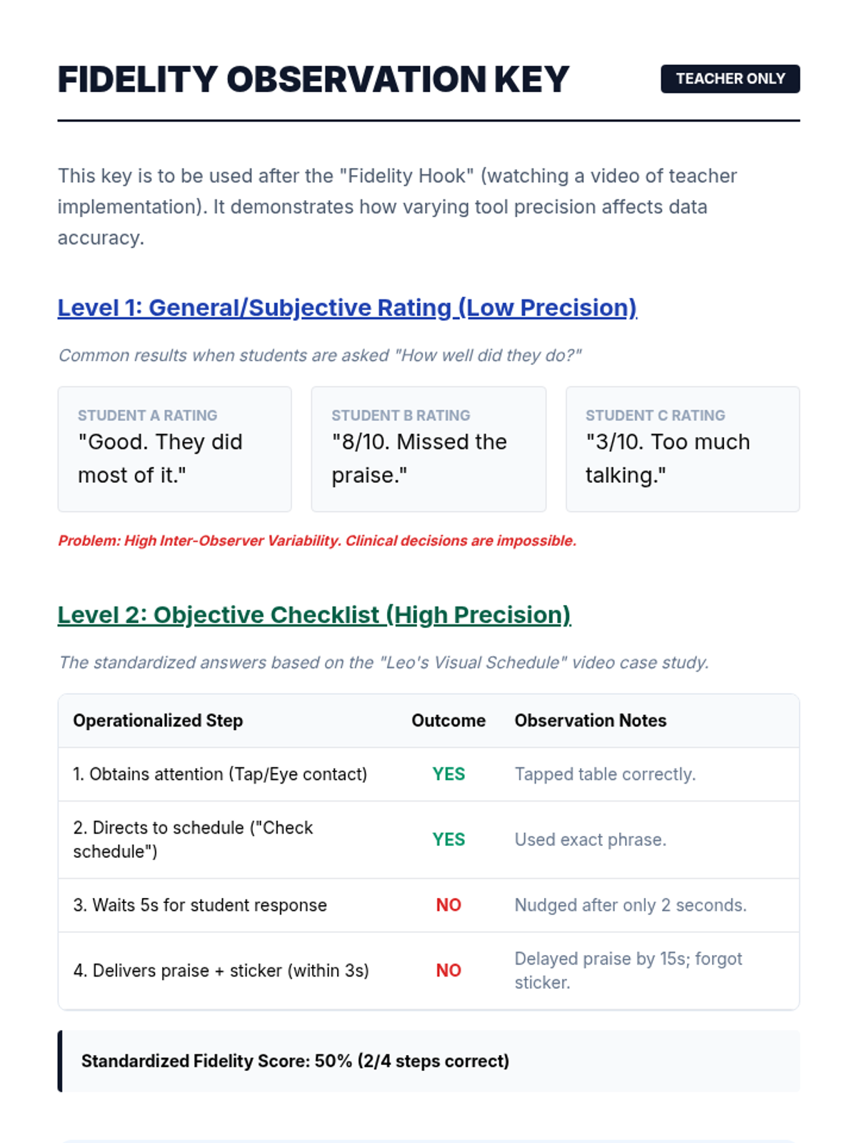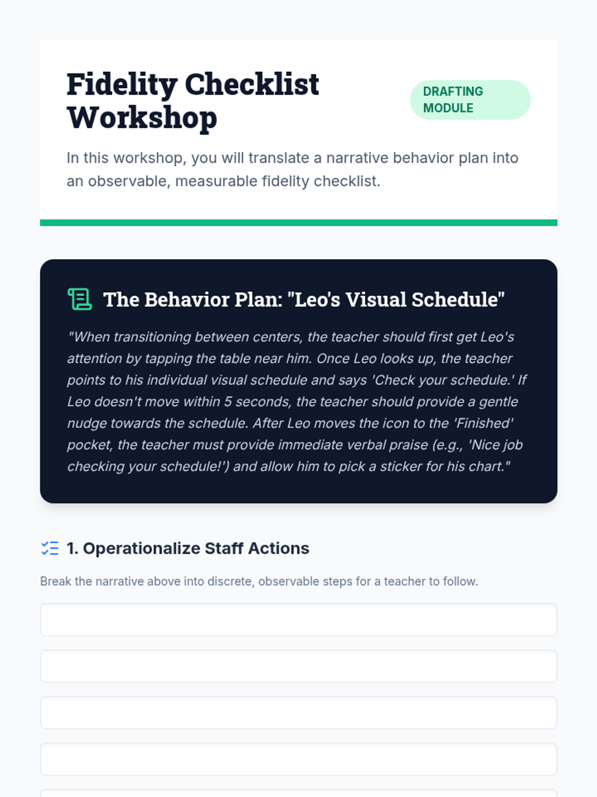 Students learn to operationalize staff behaviors and design rigorous fidelity checklists to monitor intervention implementation.