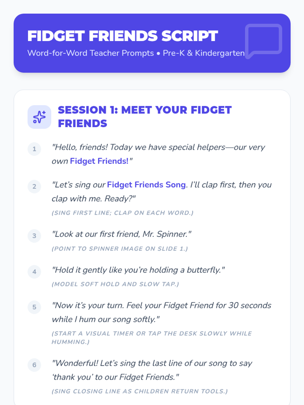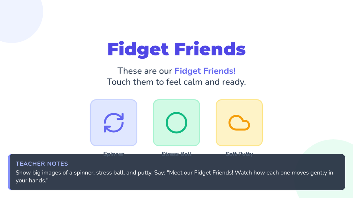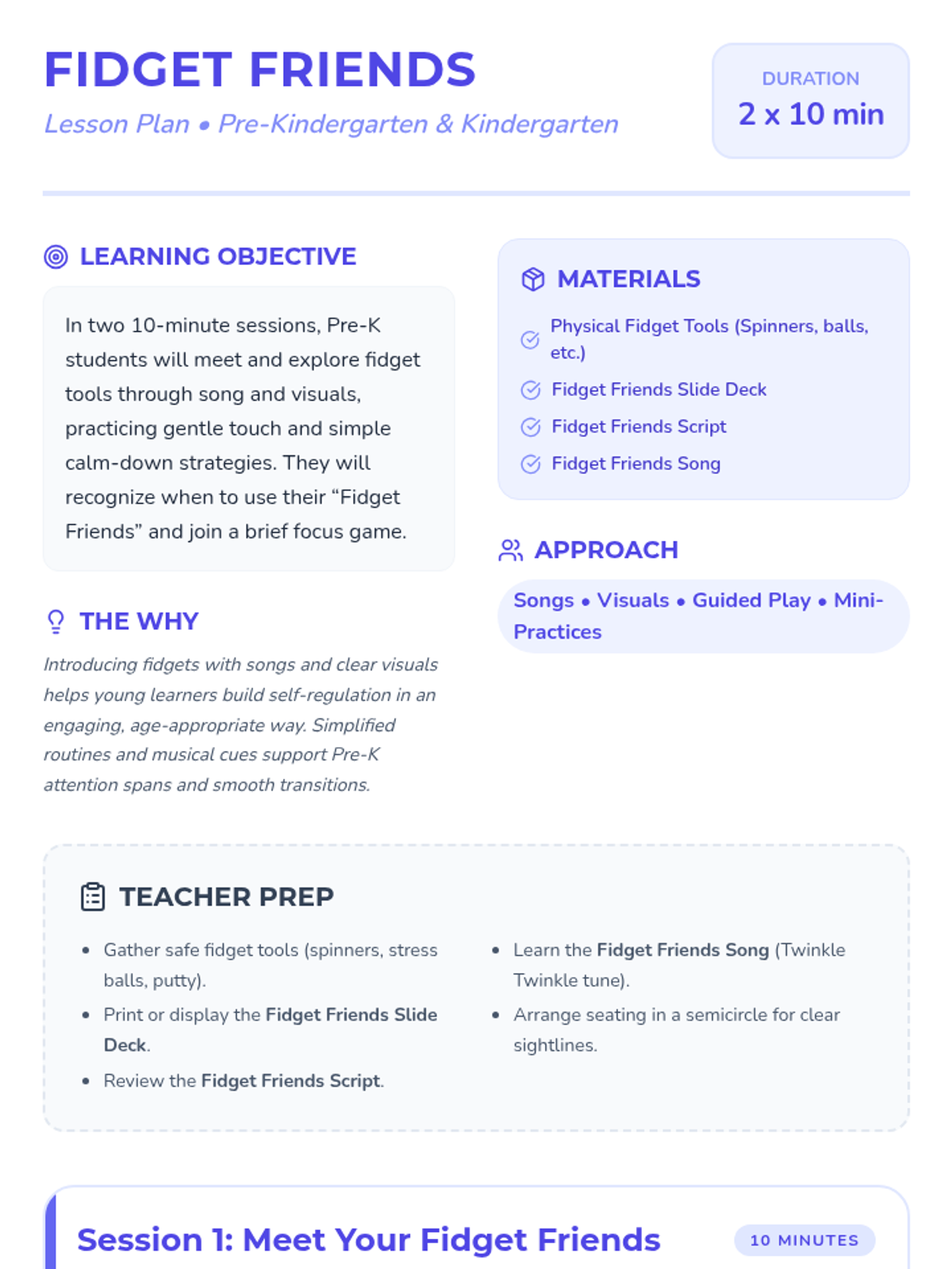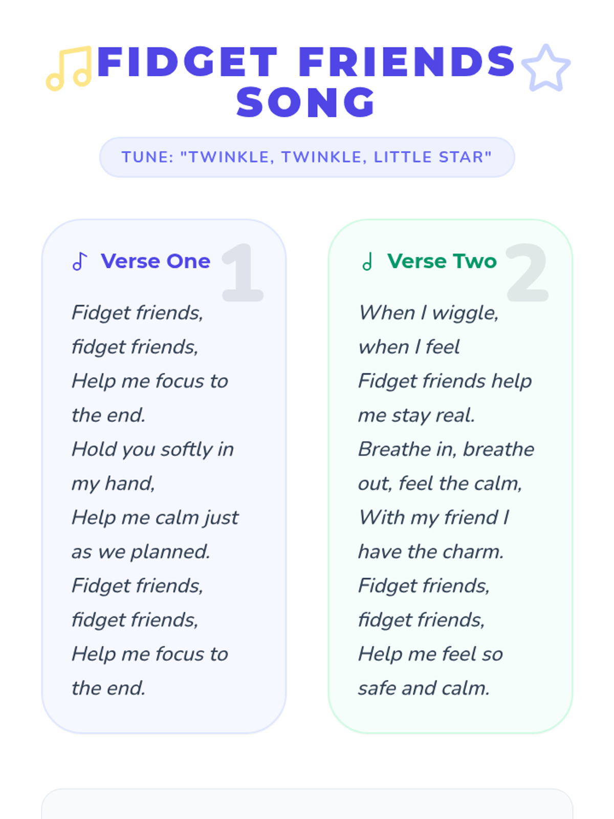Students are introduced to various fidget tools, learn the 'Fidget Friends' song, and practice using the tools gently to maintain focus and calm.