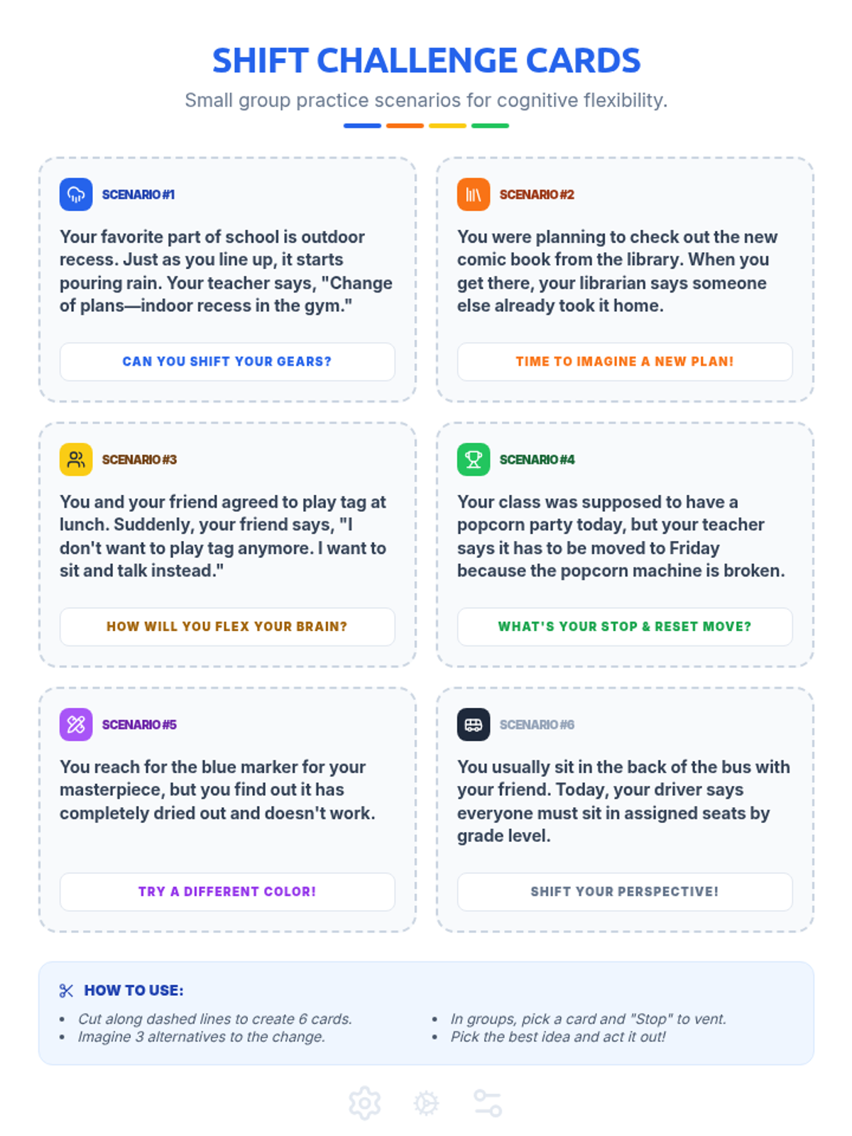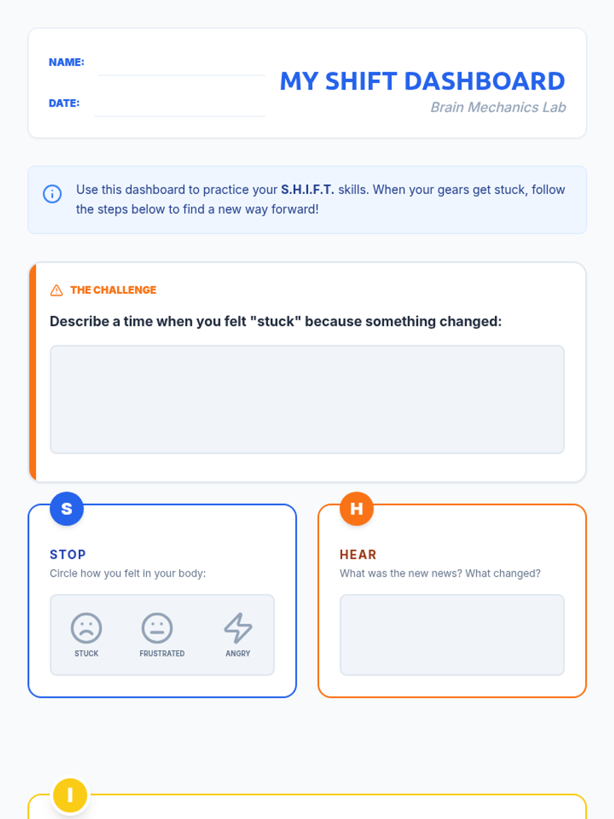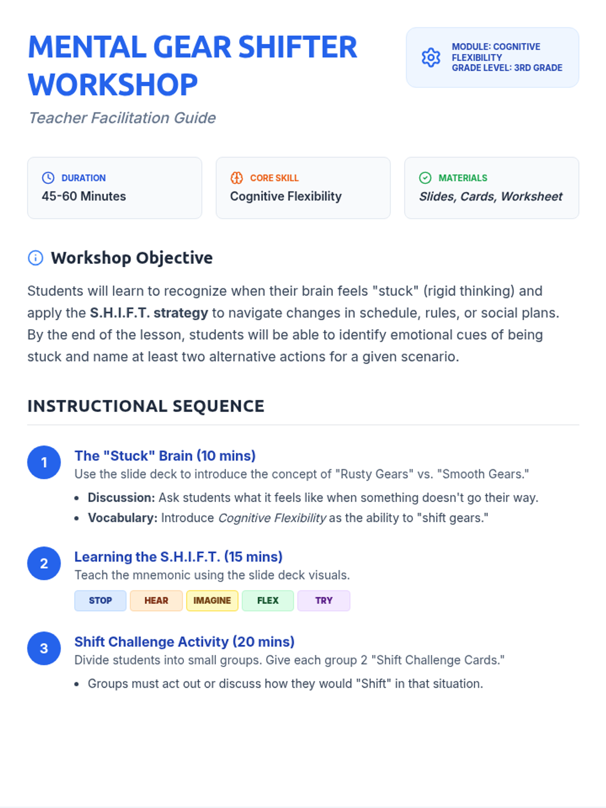 A workshop on cognitive flexibility for 3rd graders, teaching the S.H.I.F.T. strategy to help students navigate changes, obstacles, and transitions without getting 'stuck' in frustration.