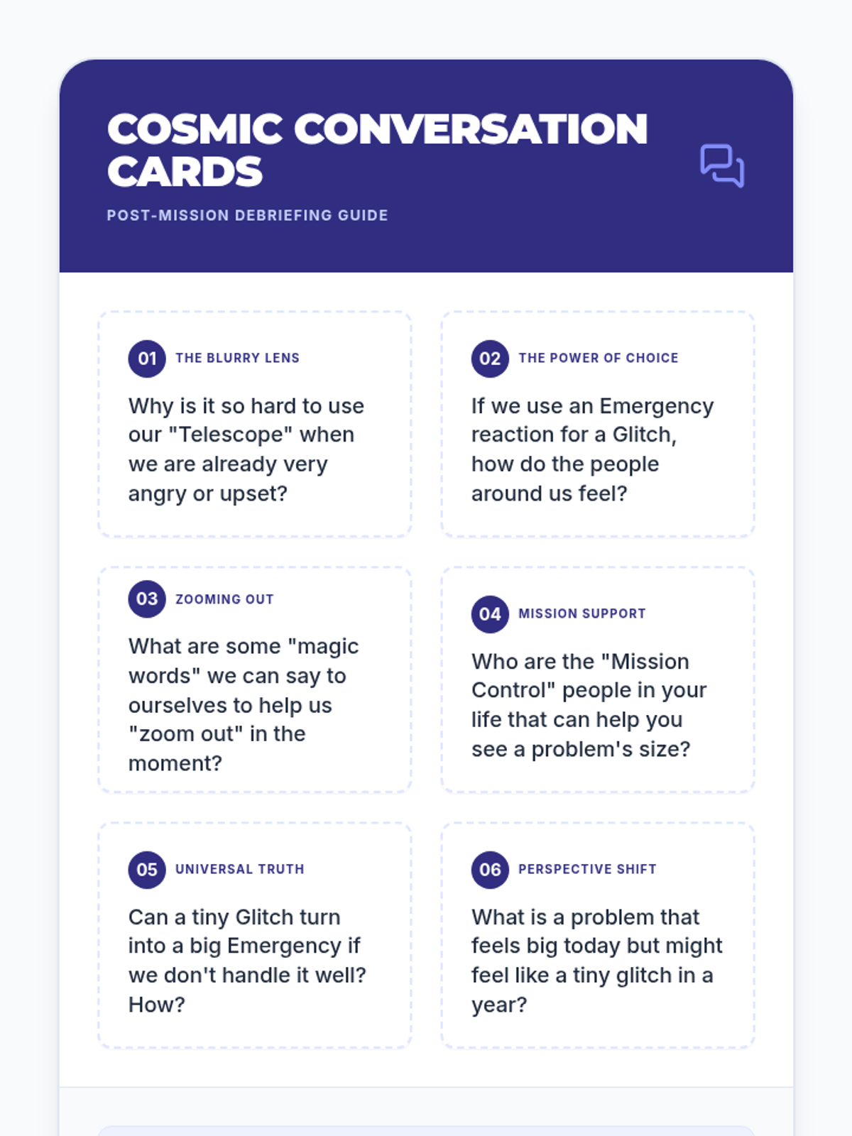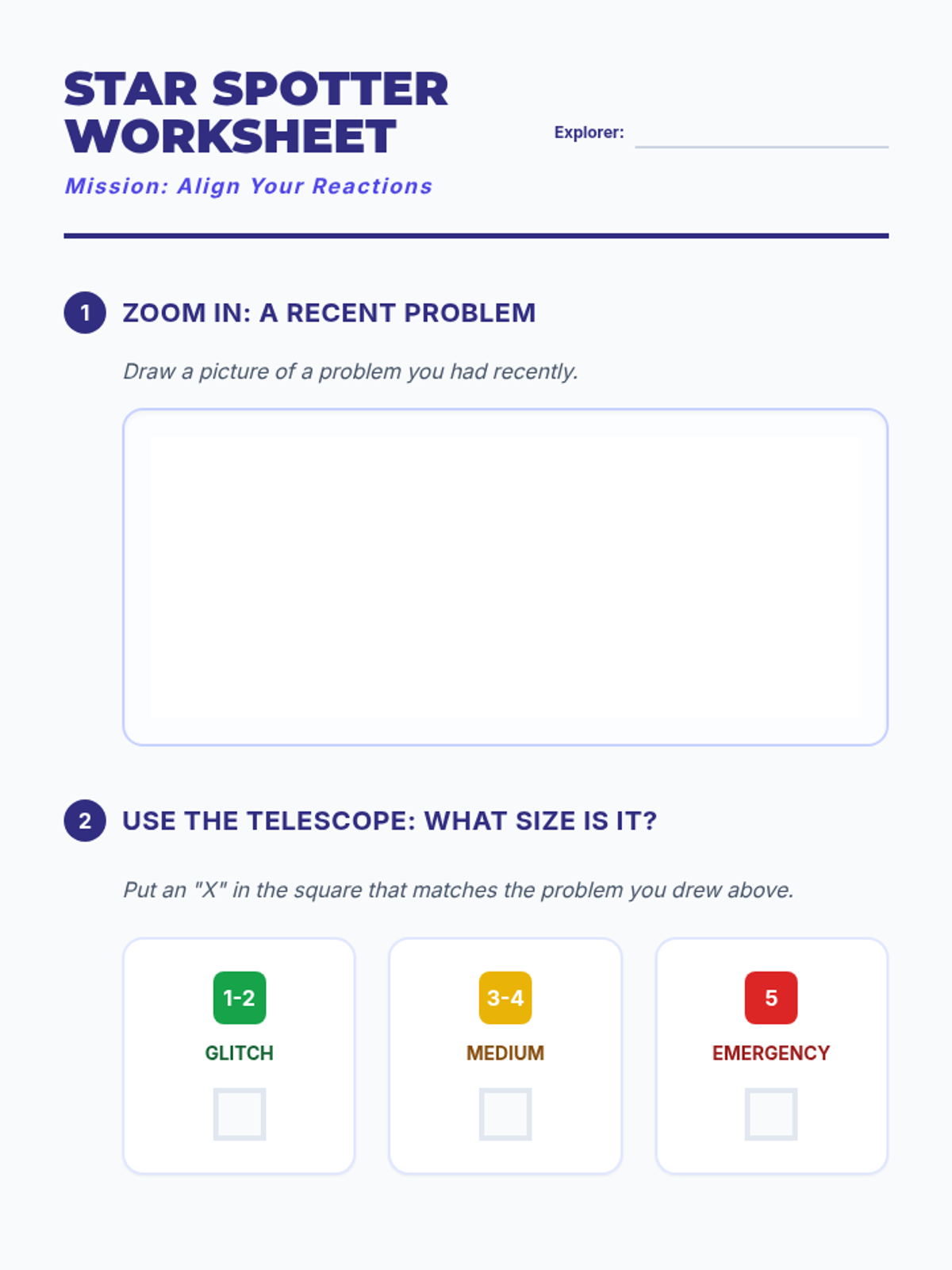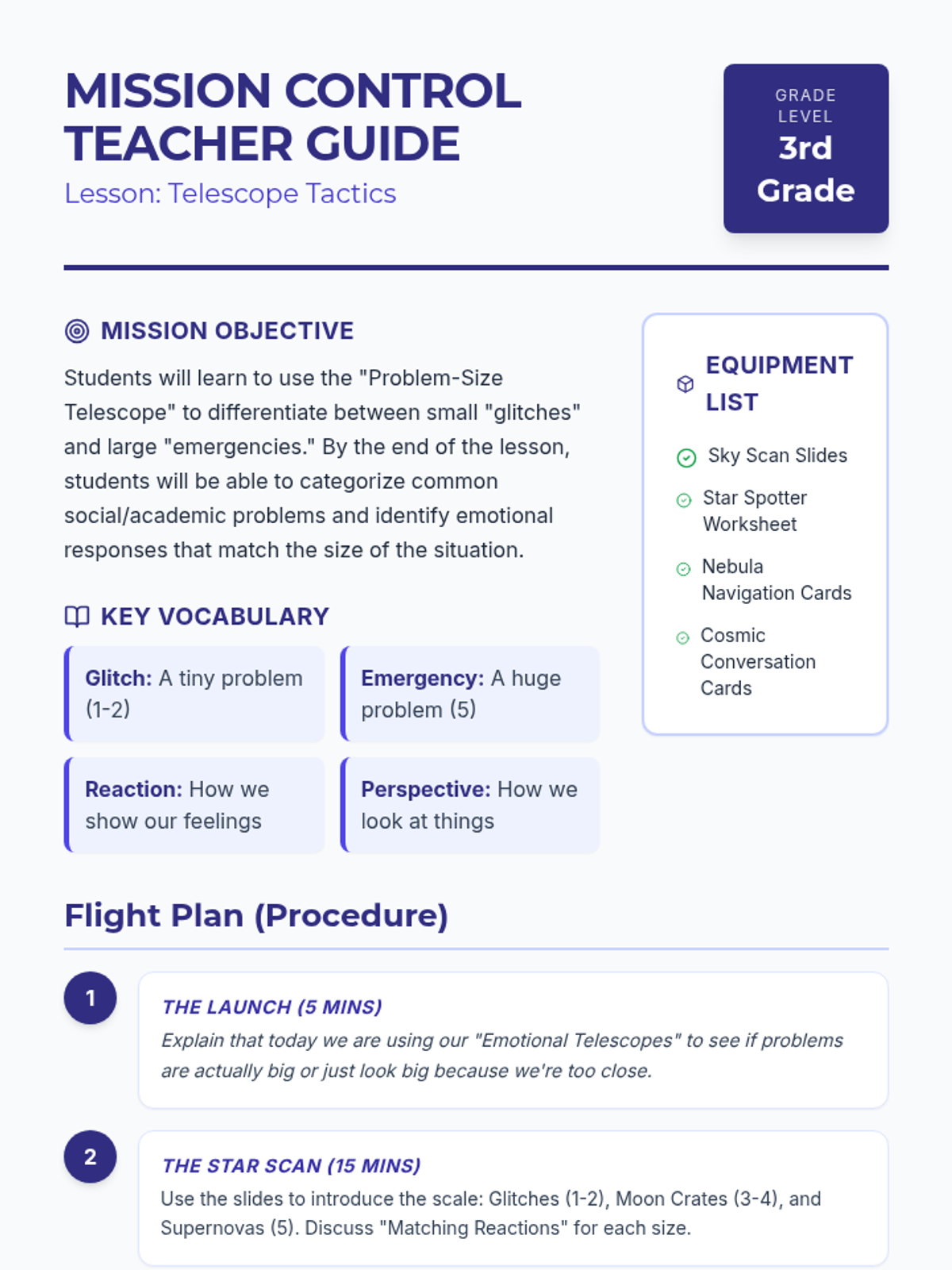 A social-emotional learning lesson for 3rd graders that uses a telescope metaphor to help students categorize problems by size and match their emotional reactions accordingly.