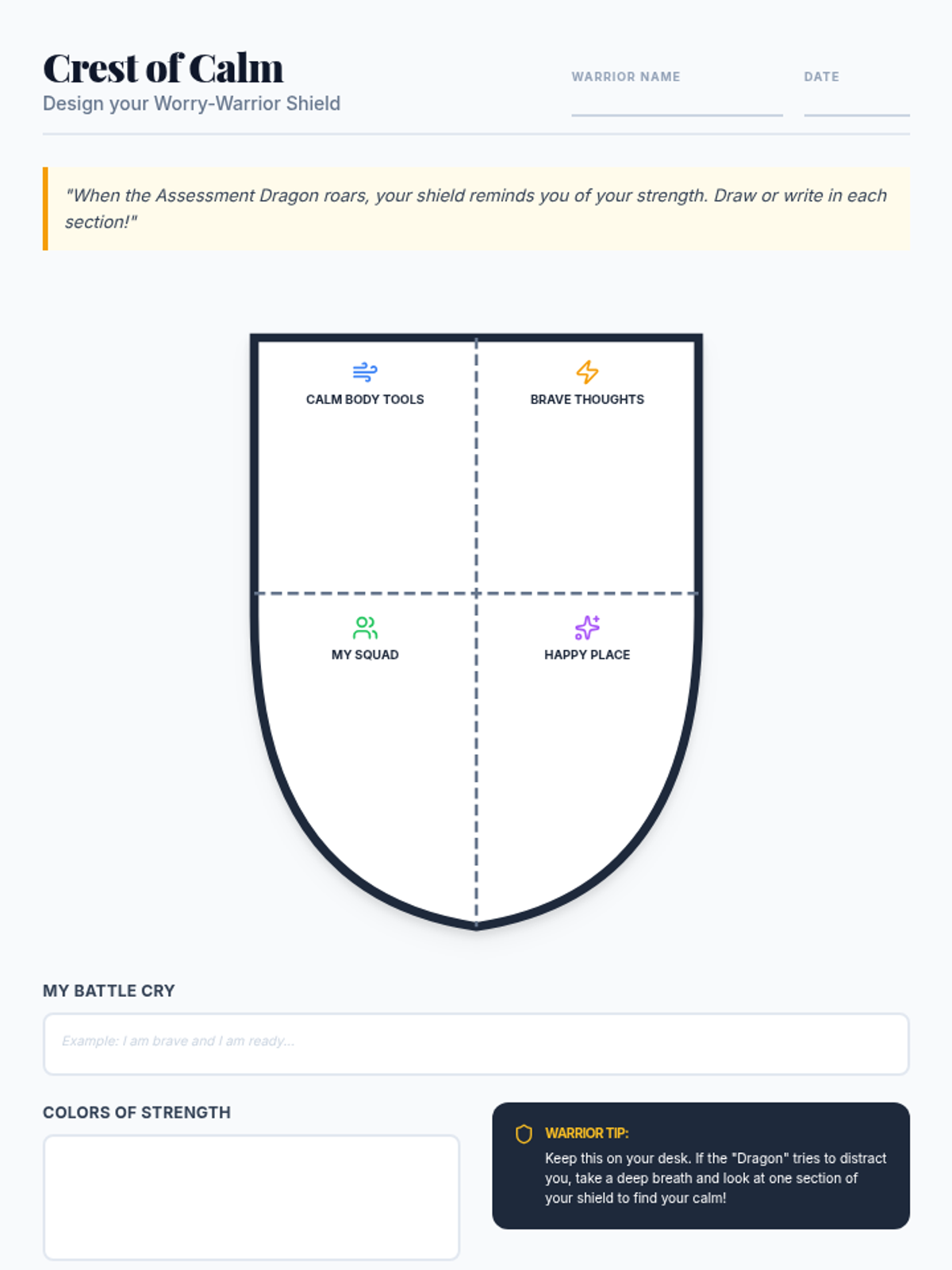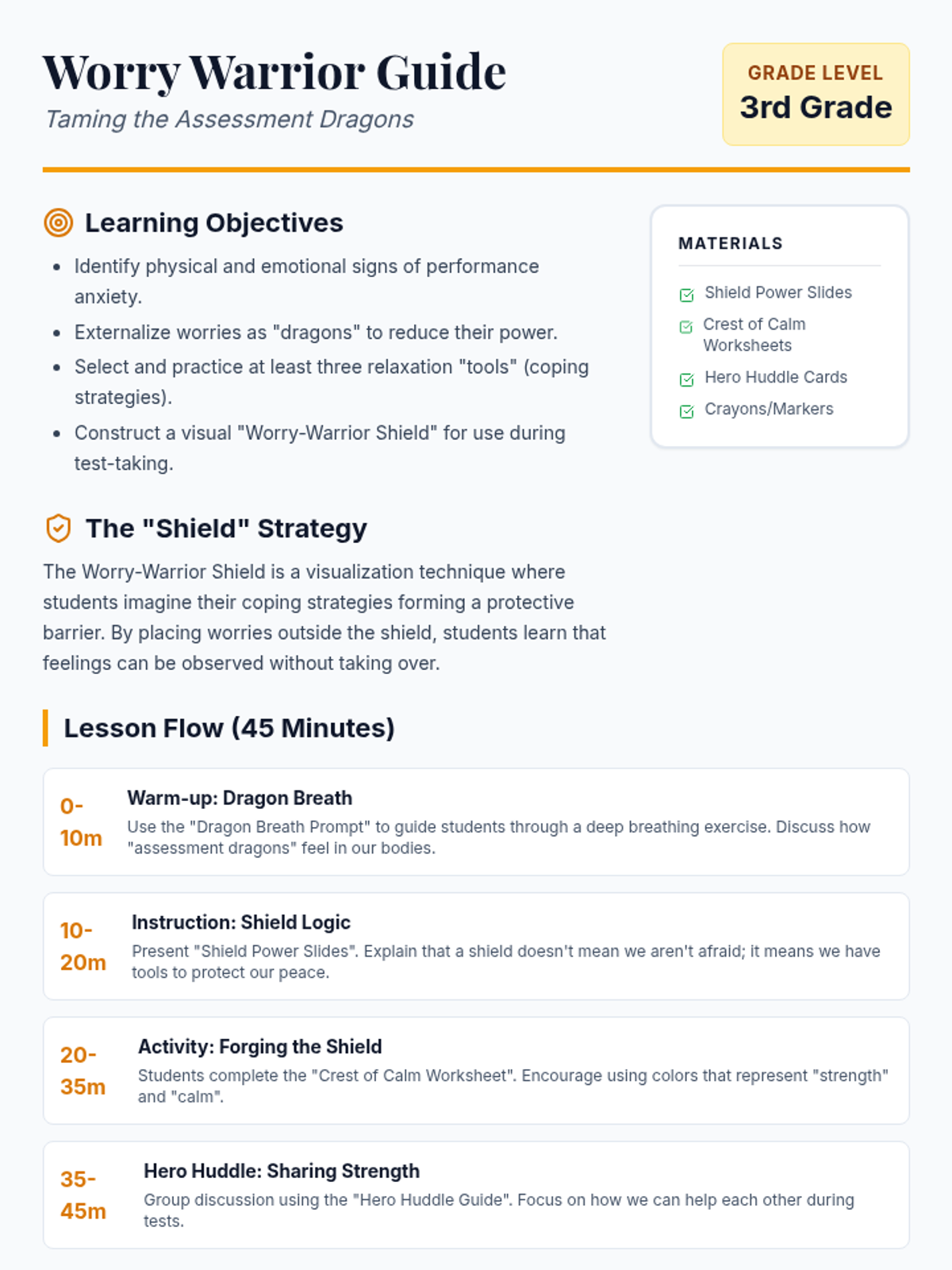 This lesson empowers 3rd graders to combat performance anxiety using the 'Worry-Warrior Shield' visualization. Students identify stressors, learn relaxation techniques, and create a physical shield of coping strategies to build resilience before assessments.