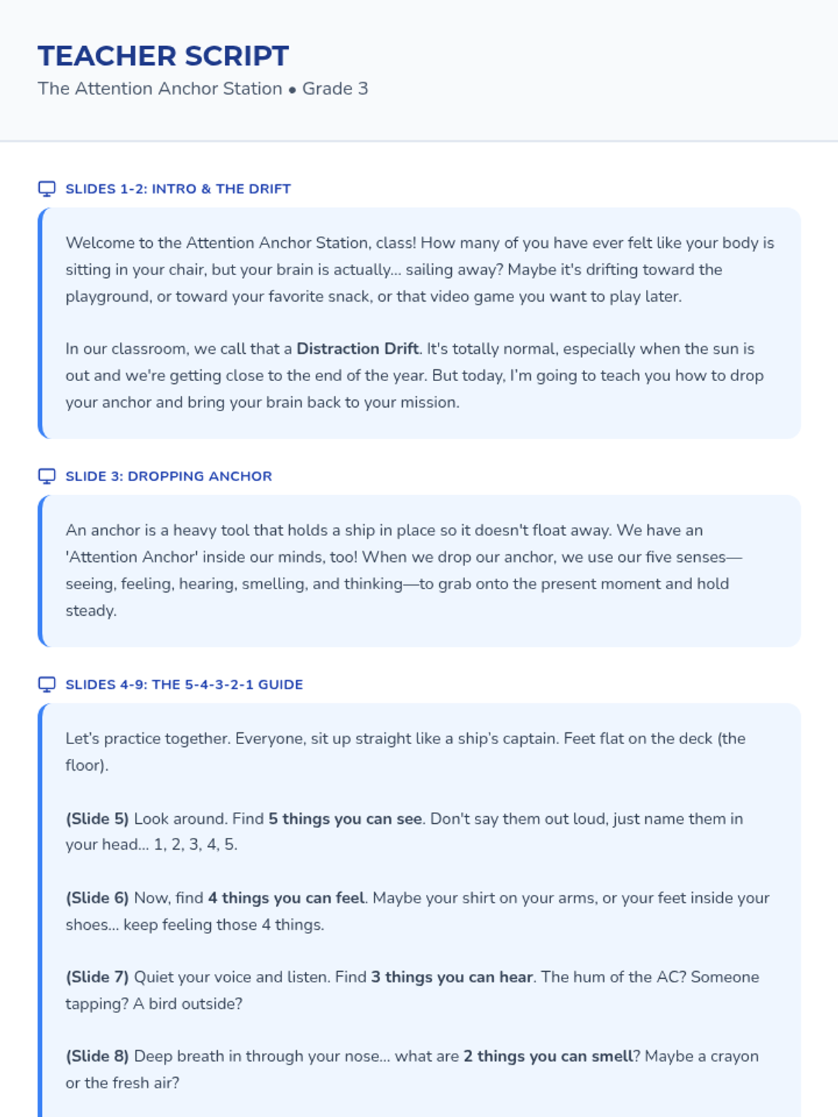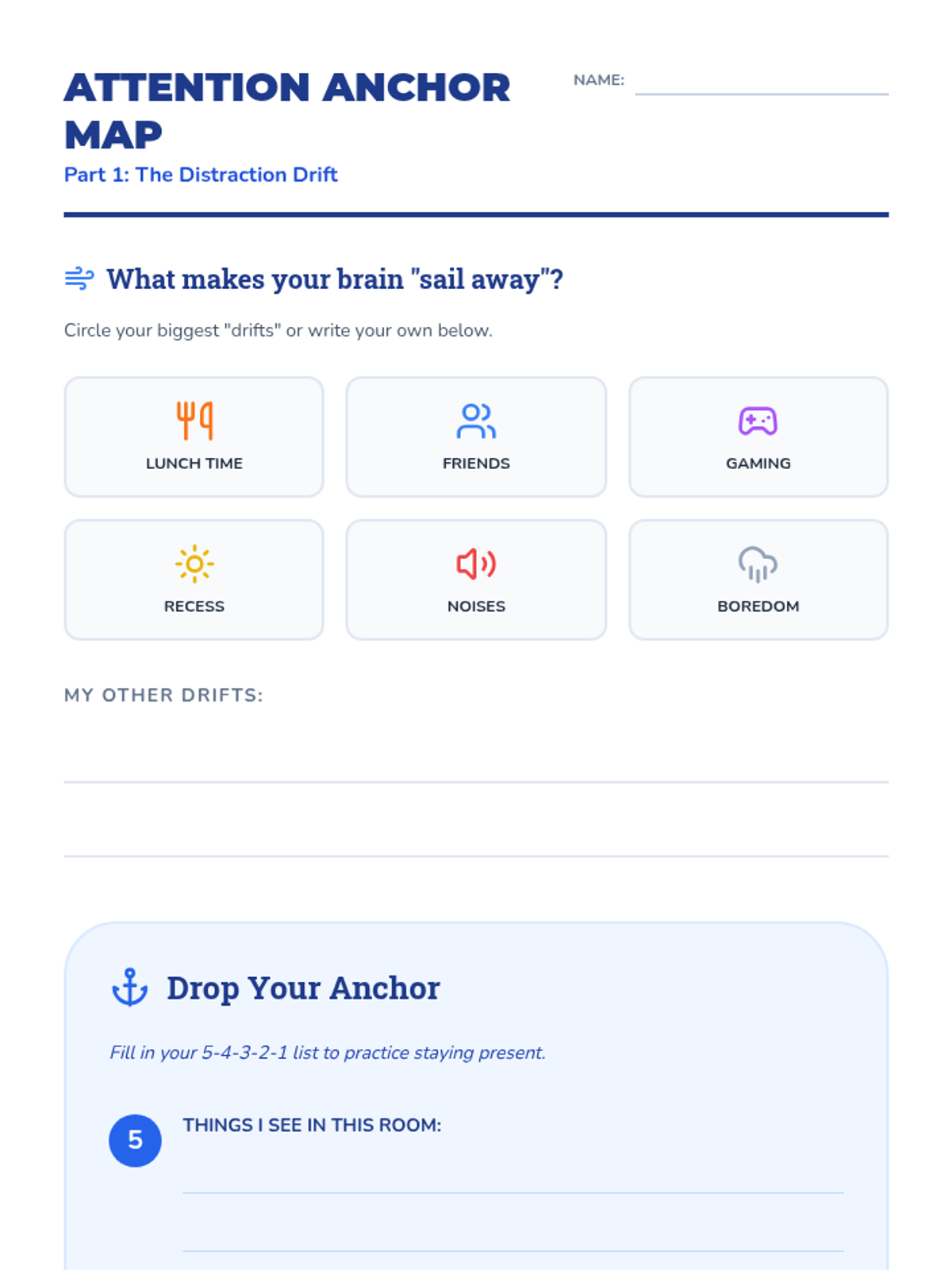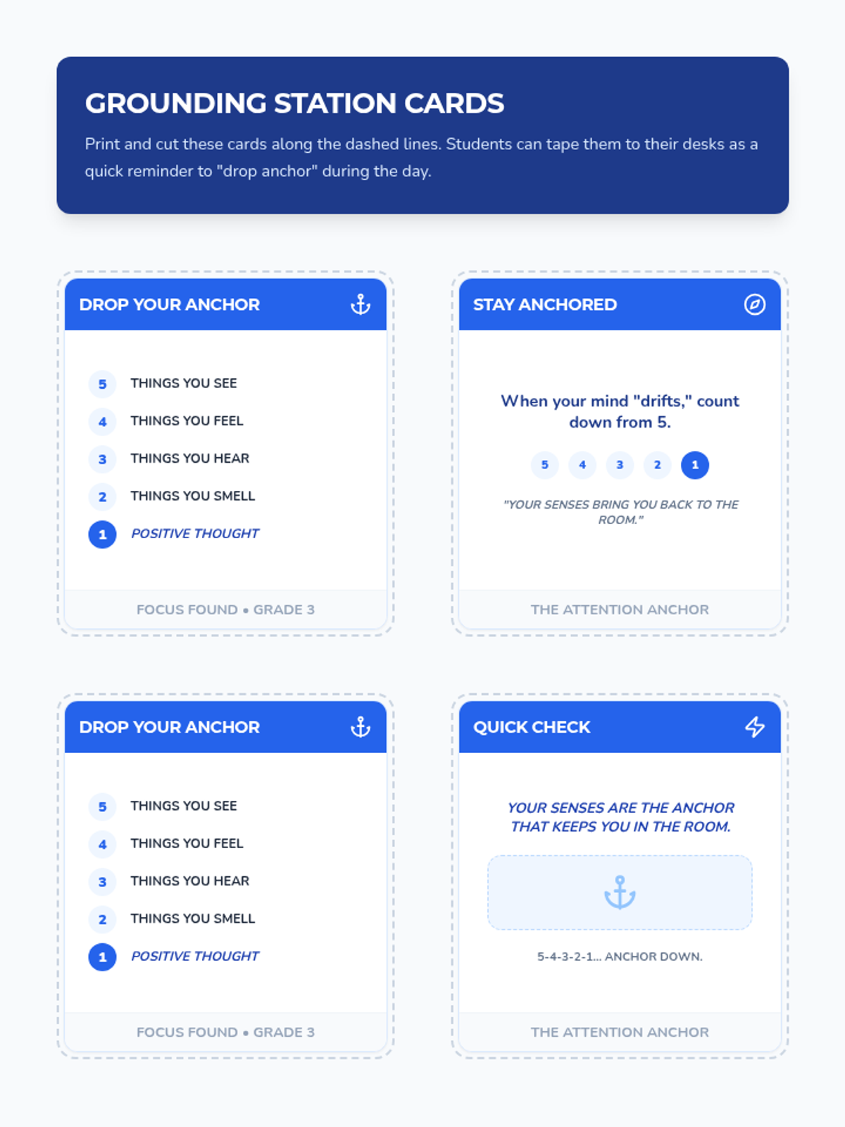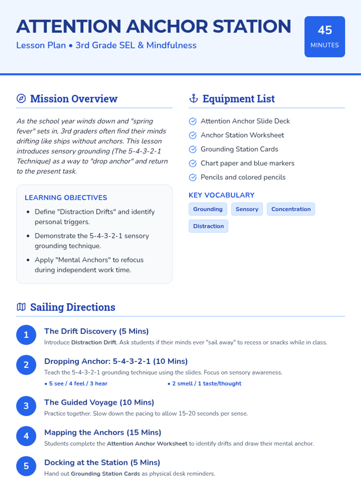 A lesson for 3rd graders on sensory grounding techniques to manage distractions and build focus during high-energy school days, using a nautical 'anchor' theme.