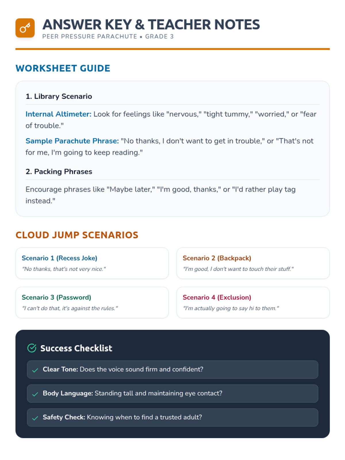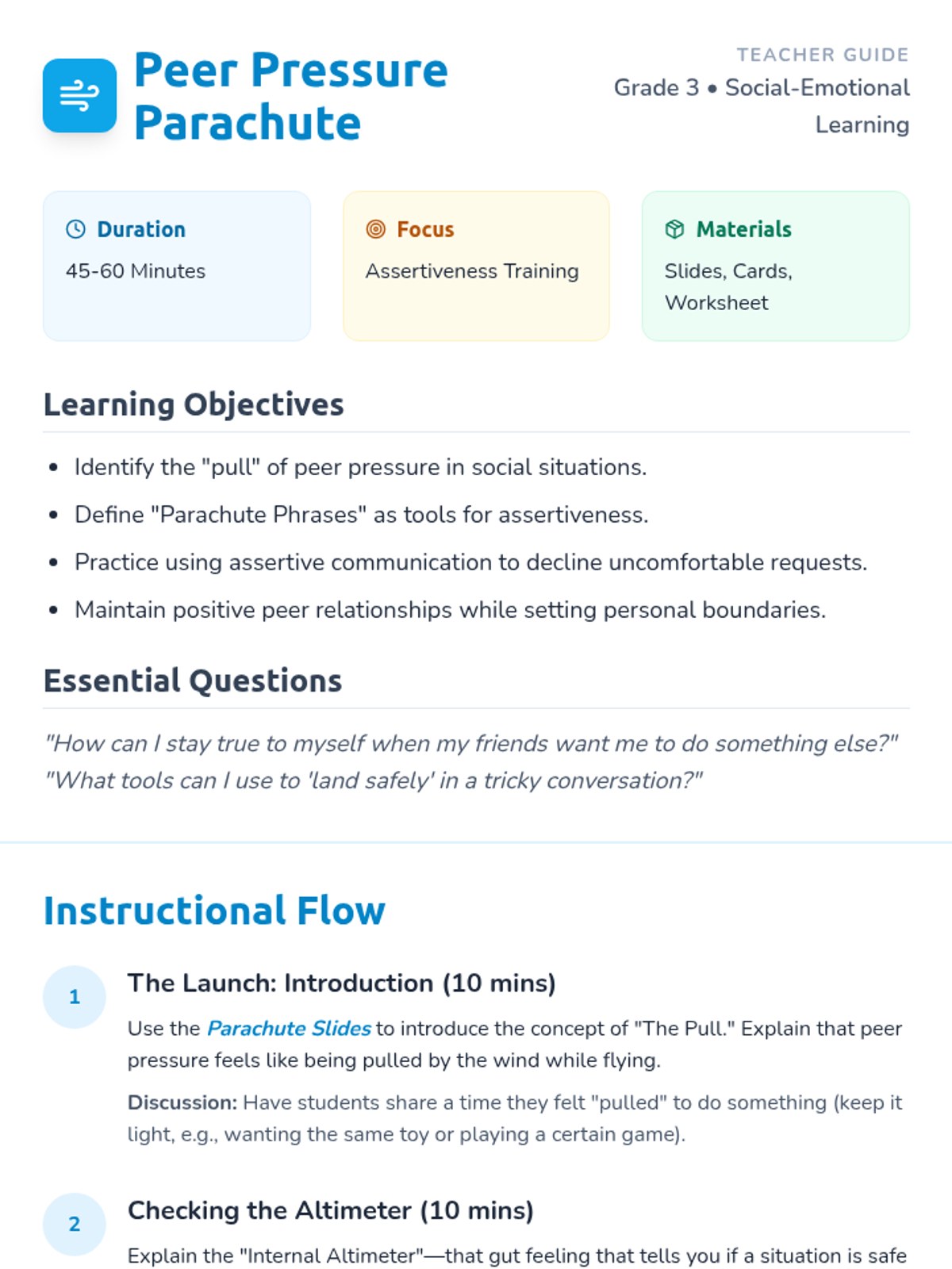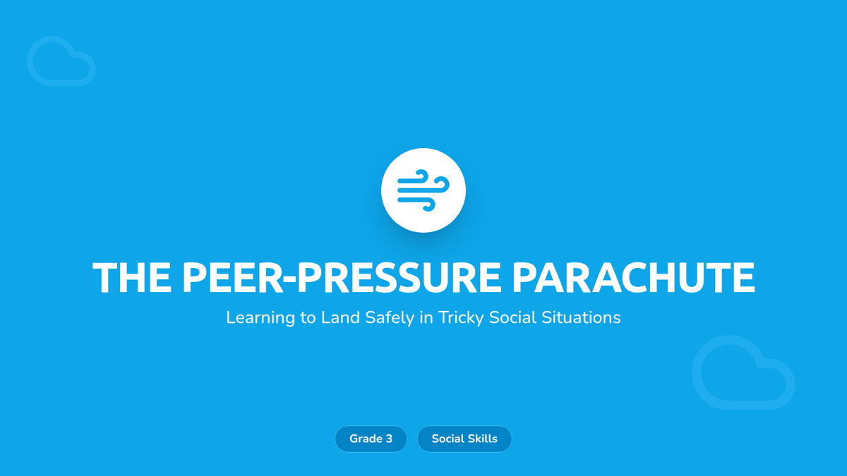 This lesson teaches 3rd graders to identify peer pressure as a 'pull' and equips them with 'parachute phrases'—assertive communication tools—to navigate social pressure while maintaining friendships. Students will engage in role-play, a scenario-based game, and reflective writing.