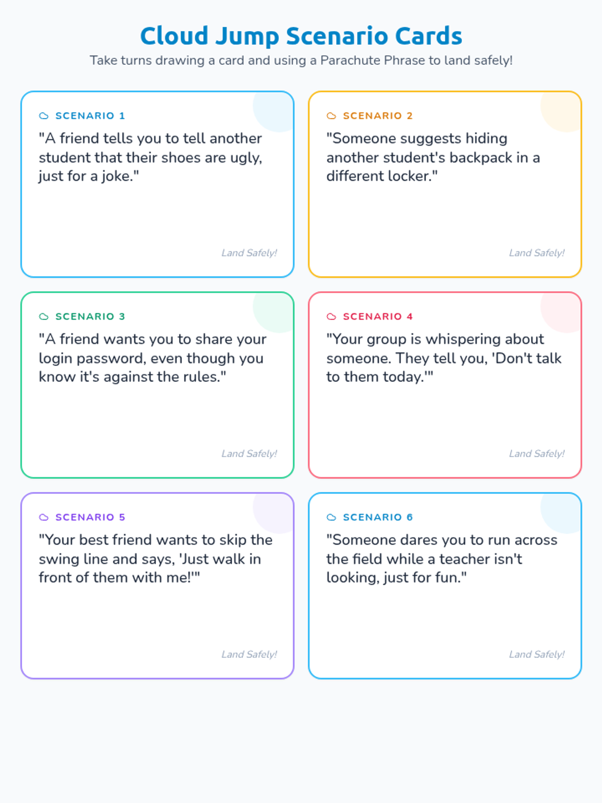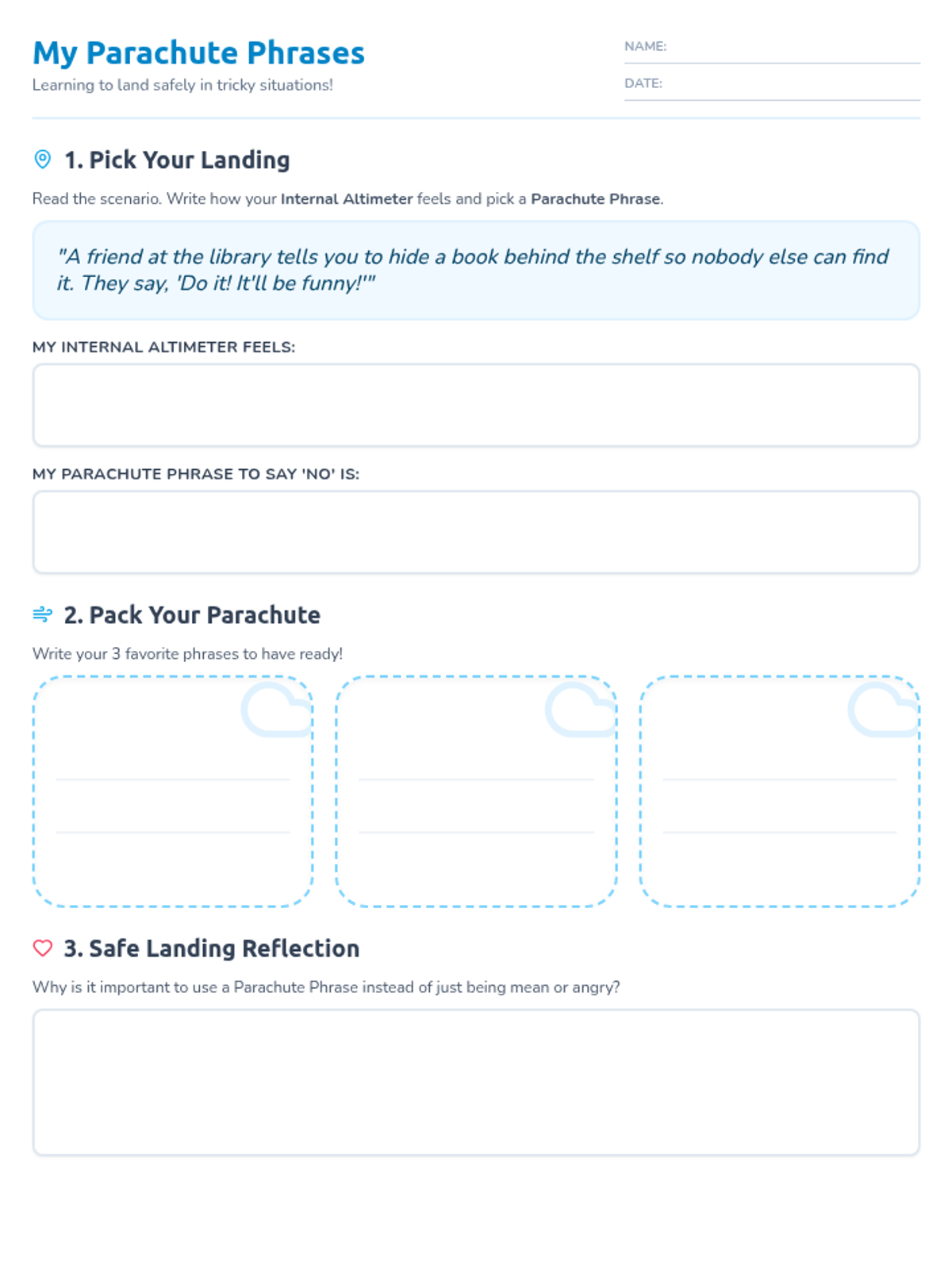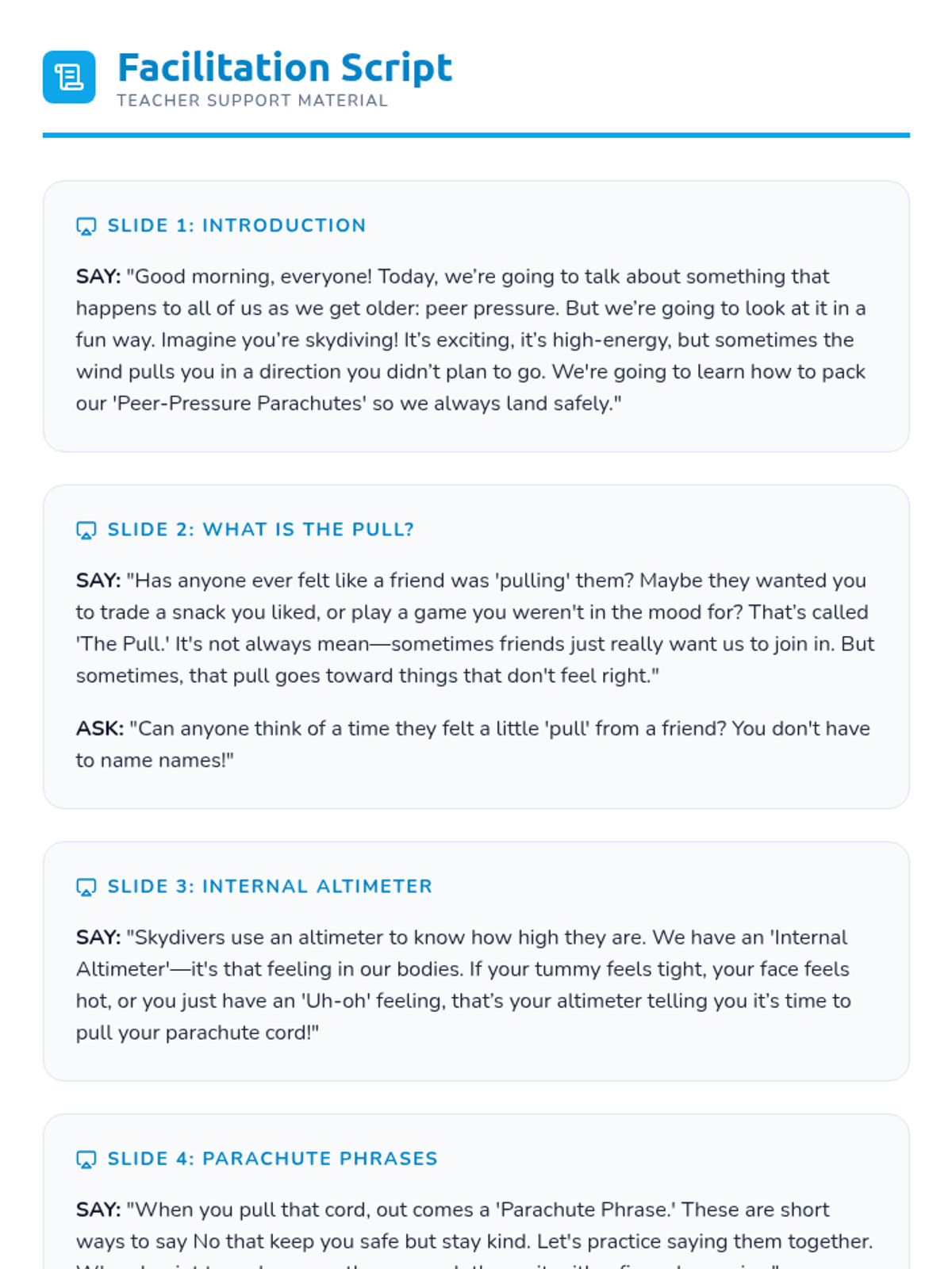 This lesson teaches 3rd graders to identify peer pressure as a 'pull' and equips them with 'parachute phrases'—assertive communication tools—to navigate social pressure while maintaining friendships. Students will engage in role-play, a scenario-based game, and reflective writing.