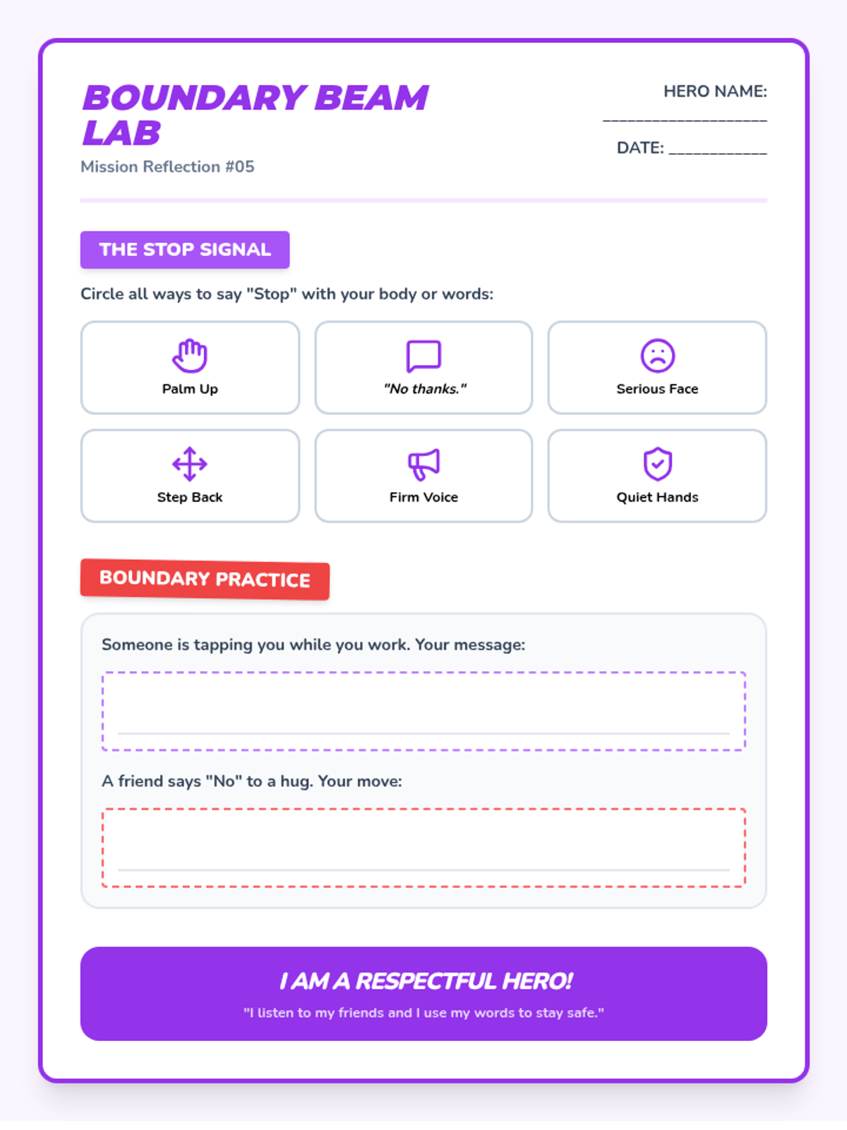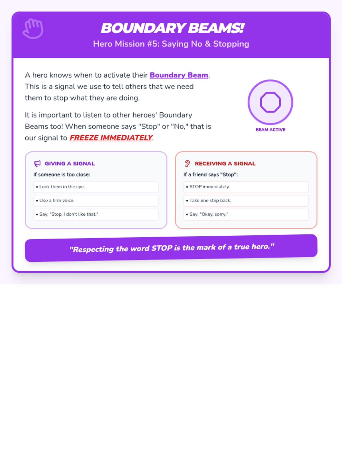 Learning 'Boundary Beams' - how to ask for space and how to listen when a friend says 'no' or 'stop'. Focuses on respecting the word 'stop' immediately.