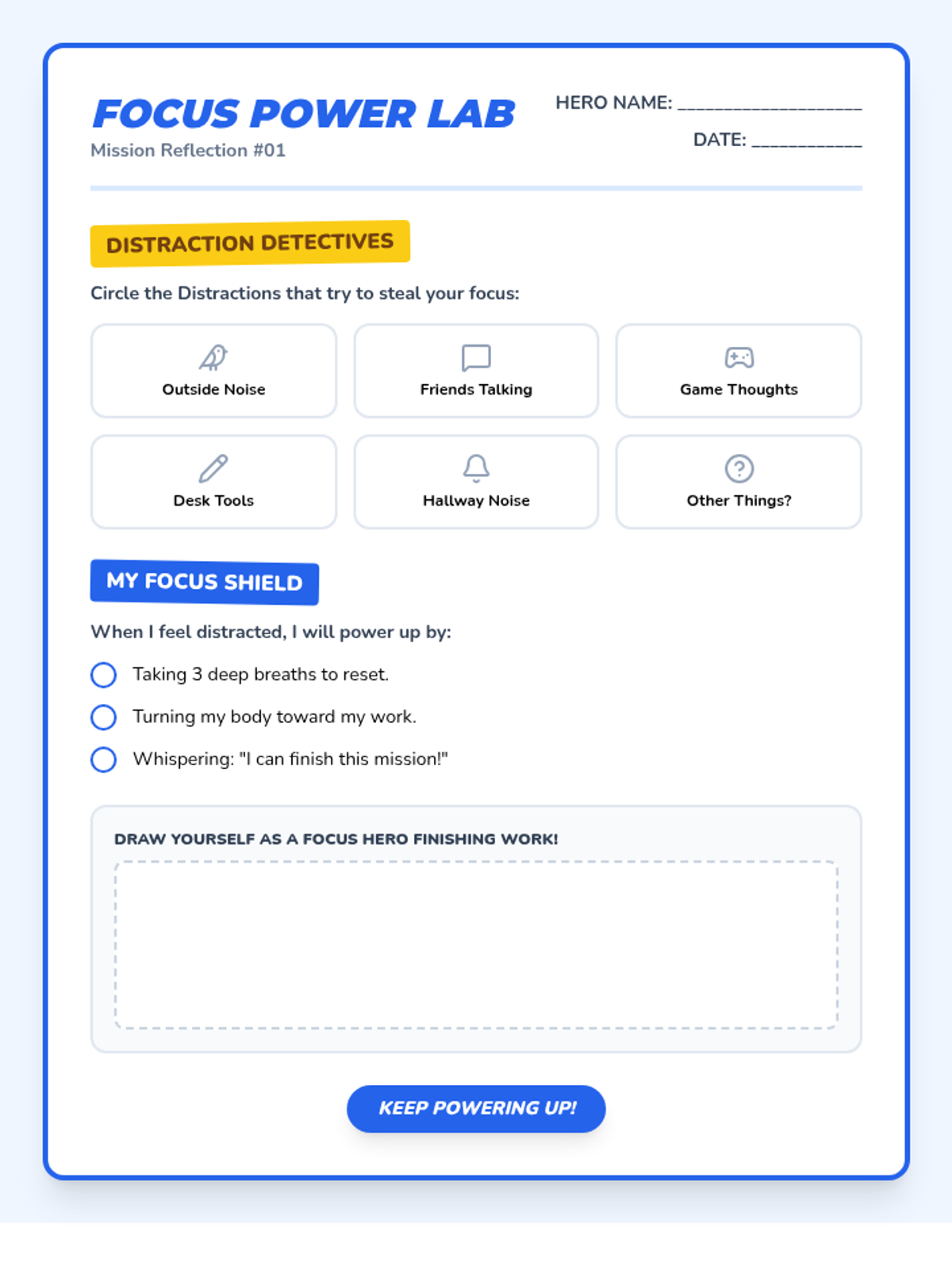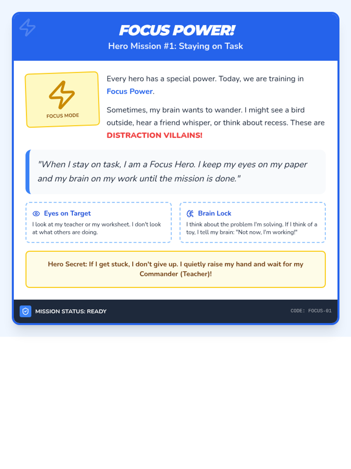 Introduction to 'Focus Power' - techniques for staying on task, identifying distractions, and using 'Tunnel Vision' to complete missions. Students learn how to ignore distractions and keep their eyes on their work.