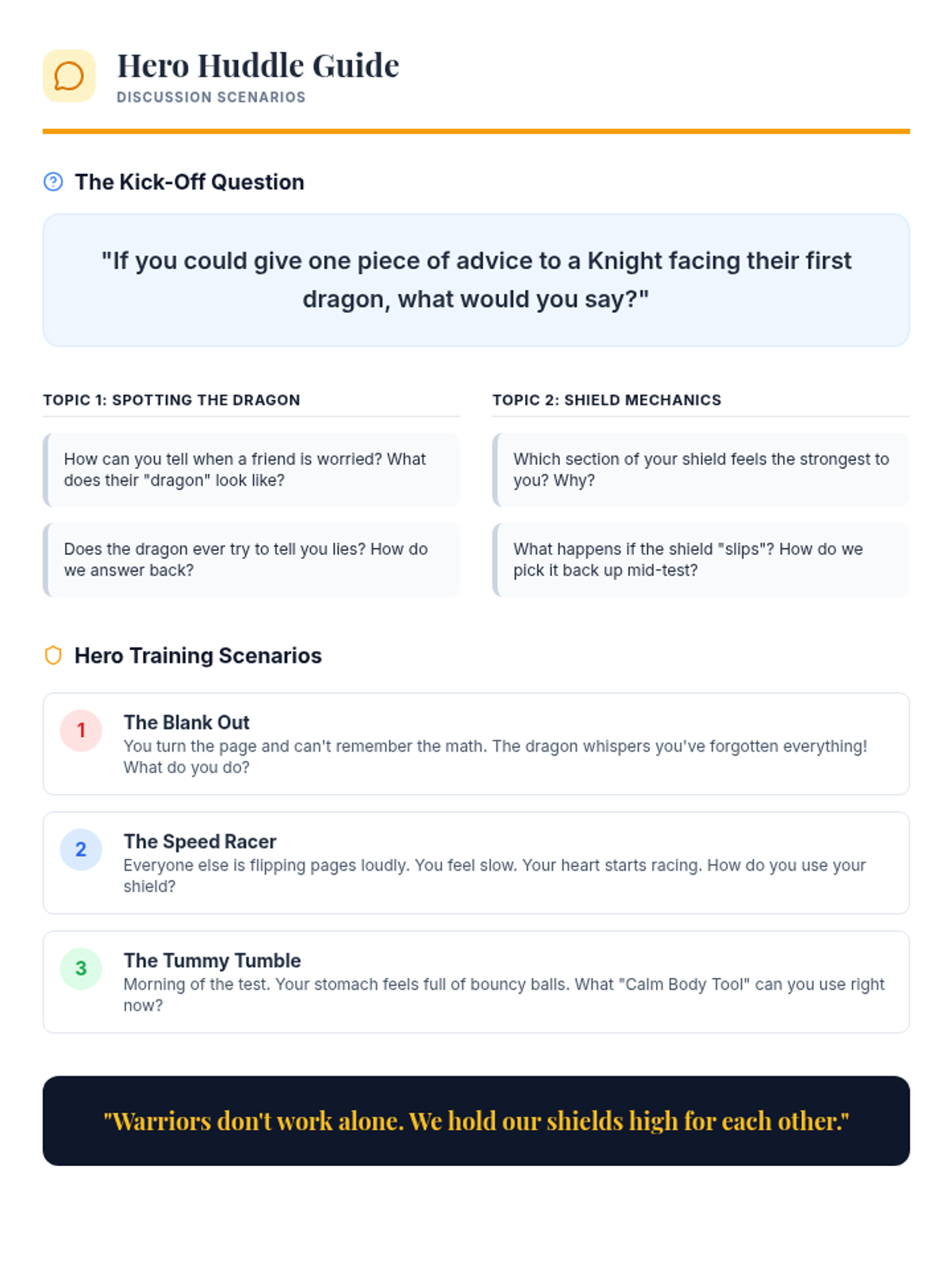 Introduction to 'Argument Armor' - techniques for staying cool when someone disagrees or makes a mistake. Students learn to avoid 'Argument Traps' and use de-escalation strategies to keep the hero team together.