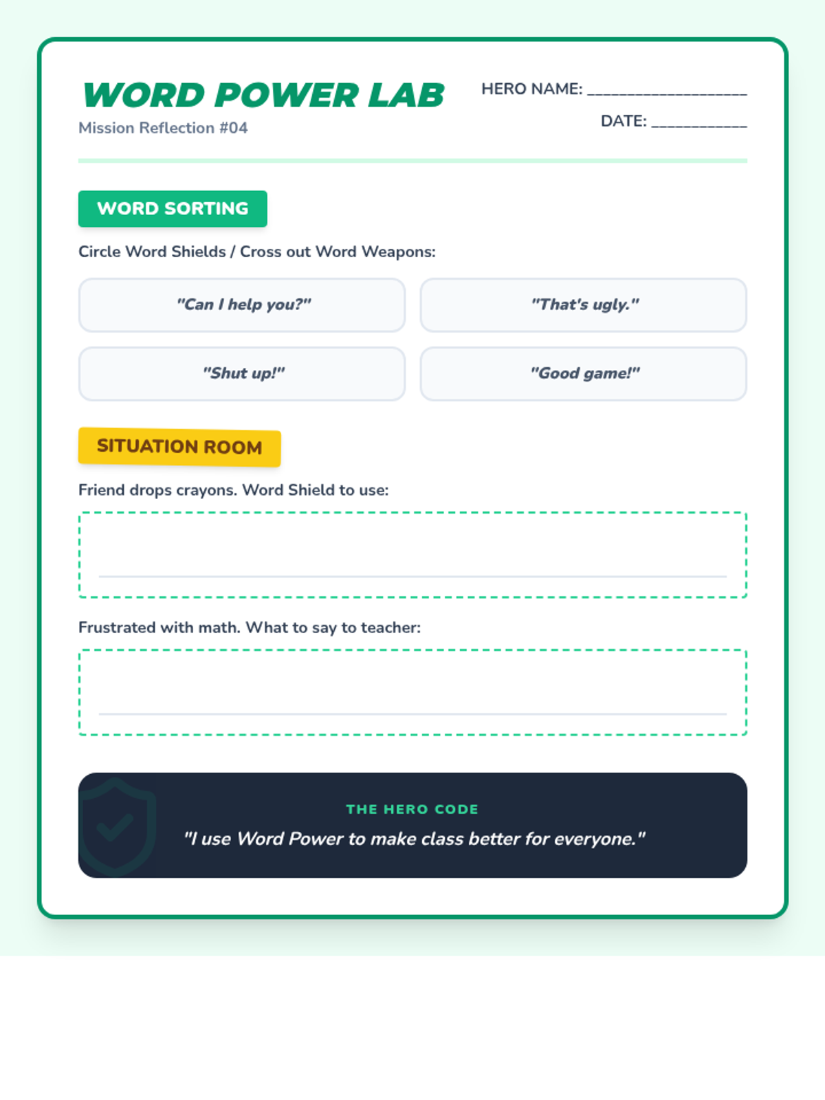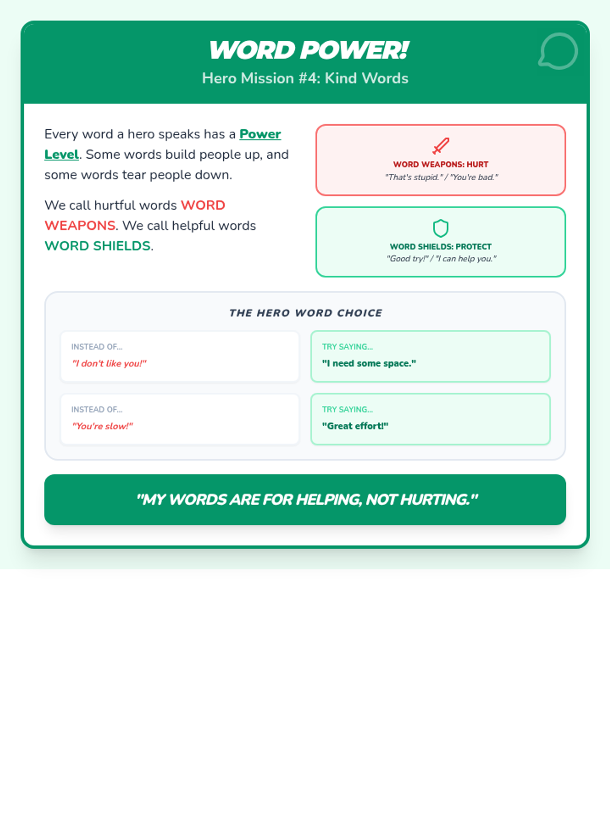 Using 'Word Power' to build others up. Students distinguish between 'Word Weapons' (hurtful) and 'Word Shields' (supportive) and practice kind phrases for 2nd-grade situations.
